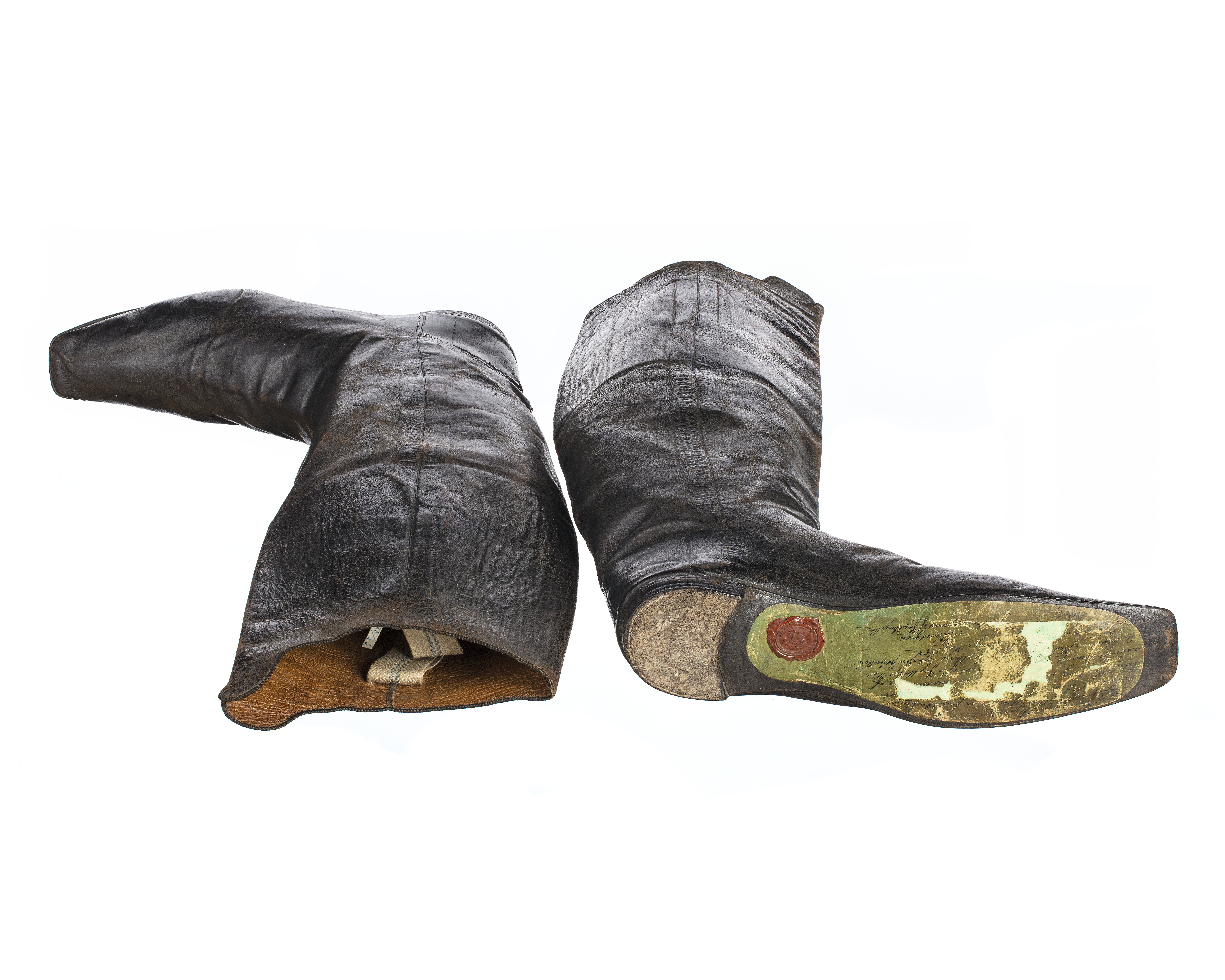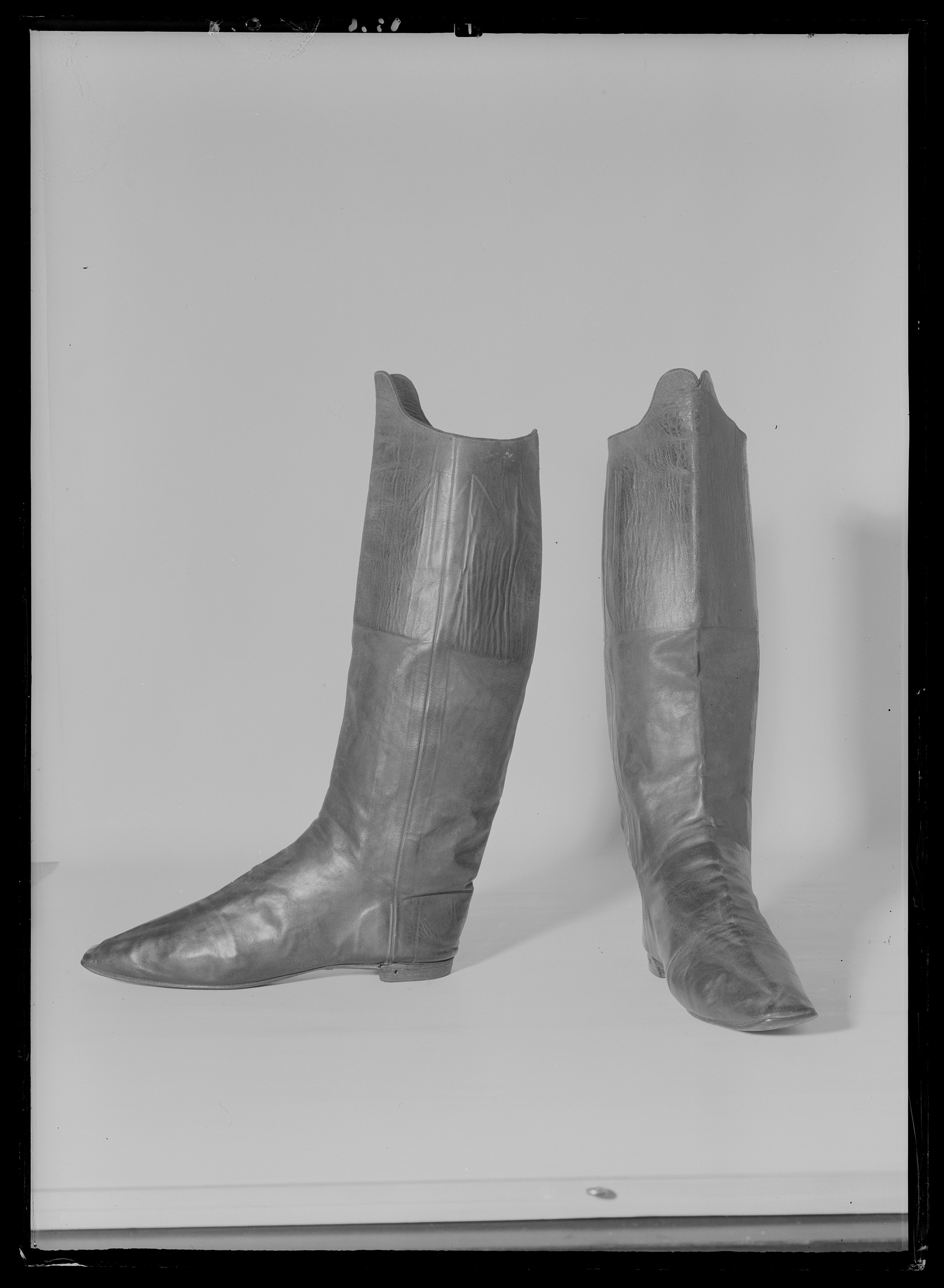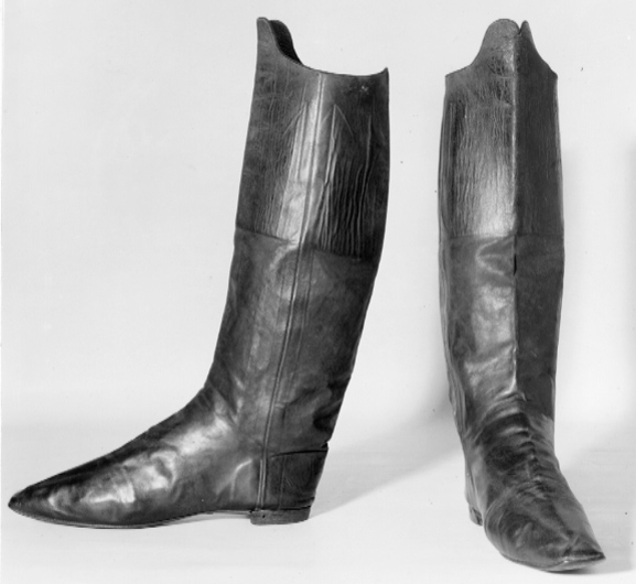 Fotlängden motsvarar idag storlek ca 41. Stöveln av svärtat mjukt gödkalvskinn med narven utåt, troligen av den skärning som kallas bottemoll. Skurna i 2 stycken: framstycket som krökts i vristpartiet och bakstycket. Sömmar - sydda från insidan - i sidorna. Skaftets övre del, som går upp i 2 rundade flikar mitt fram, fodrad med läder - här har med bläck skrivits 15. Obetydligt svängd smal läst. Tvär tå, tunn vändsydd lädersula. Låg klack av 4 klacklappar, varav den översta lagts ovanför sulan och putsats med klacktrilla. Bakomrand påsatt med klacktrilla. I klackarna hål efter sporrarna. I skaften sitter 2 st ca 125 mm långa stroppar kypertvävda av linne i vitt med 2 blå ränder i mitten - 27 mm breda, fastsydda över sidsömmarna på insidan. På sulorna är gröna lappar fastklistrade. De är försedda med lackstämplar G L. På a) står: Desse förvarade silfversporrar försedda G. Lundgren b) skadad i hälpartiet Stöveln begagnad av skulptör B. E. Fogelberg för framställningen av ryttarstatyn av Karl XIV Johan (1844) vid Slussen i Stockholm.