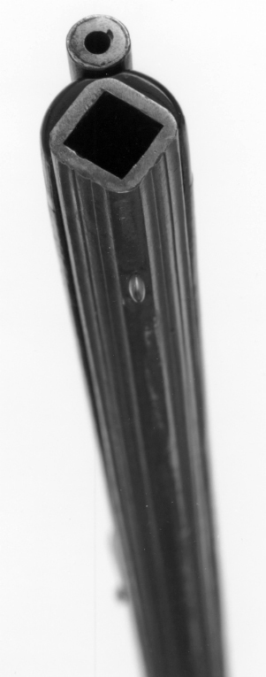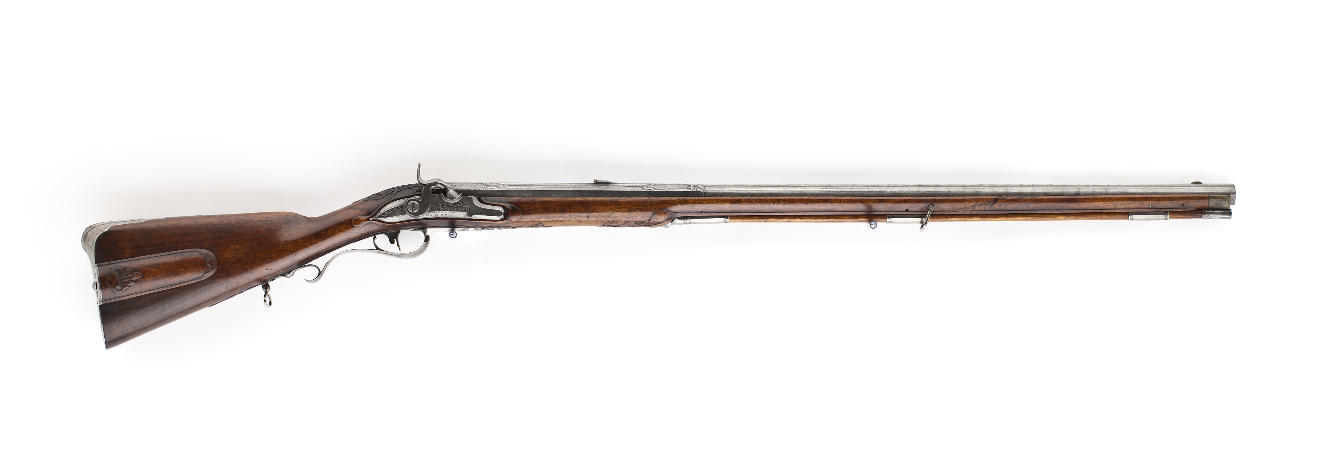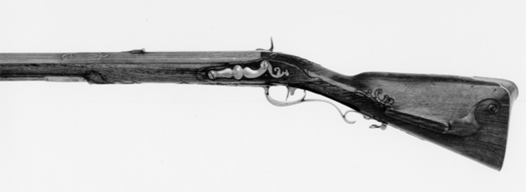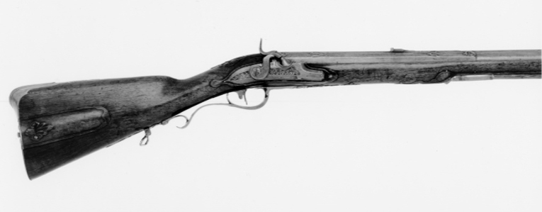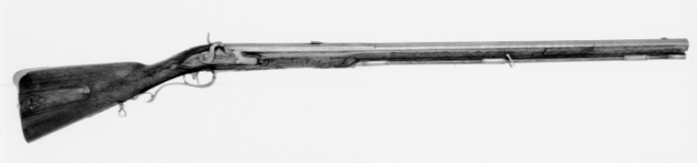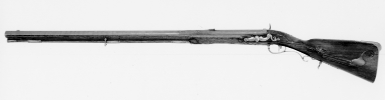Fyrsidig pipa av stål med åttsidigt kammarstycke, den fyrsidiga delen på kant i piprännan. Etsad damaskering, dekor i stålsnitt i form av bladornament vid pipbasen och övergången till det fyrsidiga partiet, längsgående lister med profilerade kanter på hela pipan. På kammaren inslagen signatur av guld:"A. GERHARD. A. STOCKHOLM", därbakom guldstämplar med sjöblad och krona (LRK vägl.1921:209-210), omgivet av guldtext: "P.S.B.INVENTOR" (Pehr Sjöblad). Över skarven svansskruvblad-pipbas en spirliknande stämpel. På pipans h. sida en tändhattssnäcka av stål. Riktmedel: Inlaxade riktmedel, ståndsikte av stål på kraftig platta med framåtriktat, profilerat blad. Stolpkorn av silver. Fästning: Tre häften. Pipan fäst med krysskruv, två pipstift av stål samt främre rembygelns skruv. Flintlås ändrat till slaglås. Plant låsbleck med brett fasade kanter, punsad kantdekor. På mittfältet dekor i relief mot mörkpunsad bakgrund, bakom hanen koger, rävhuvud och fågelhuvud, framför hanen signatur: "A. GERHARD", på nederfasen därnedanför: "STOCKHOLM". Platt hane med något fasade kanter, välvt, graverat hanhuvud. Hane och slagfjäder utbytta. Fästning och avtryckare: Två låsskruvar. Svagt böjd avtryckare. Brun helstock av valnöt, kolv av fransk typ med kindstöd och kolvlåda, lock med fingergrepp i form av flikigt blad, stålskodd bakände. Vid kindstödet, runt svansskruvbladet och bakom spetsrörkan snidade blad-och rankornament.Näsband av horn, övriga beslag av stål. Bakplåt med förstärkning med upphöjd list över hälen, flik på kolvryggen med bladvoluter i relief mot mörk, punsad bakgrund. Sidbleck med mittoval, flankerad av en s-formigt svängd, välvd, bakåtriktad arm och balusterformig, välvd framdel. Tre sjusidiga rörkor, slät, triangulär spets. S-formigt svängd varbygel med list på bygeln, fri bakre arm med omvänt c-formig, bakre stolpe, avslutning i form av treflikigt blad. Balusterformig främre arm med avslutning i form av ett flikigt, profilerat blad. Rektangulära rembyglar, den främre vid mellanrörkan, den bakre bakom varbygeln. Tillbehör: Laddstock av trä, l: 845 mm, med invändigt gängade stålbeslag i båda ändar.