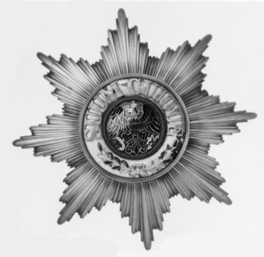 Åttauddig strålstjärna av silver, varannan stråle konvex, varannan konkav. Välvd medaljong täckt med gulorange emalj, därpå fäst svartemaljerad, krönt örn av guld med en grönemaljerad lagerkrans i vänster klo, ett blixtknippe i den högra. Runt medaljongen en välvd ring täckt med vit emalj, därpå fäst guldtext: "SUUM CUIQUE" samt två grönemaljerade, korsade lagerkvistar, kantringar av silver, den inre med repstavs-, den yttre med pärlstavsdekor. På frånsidan stämplat: 88421. Vertikalt placerad säkerhetsnål.
