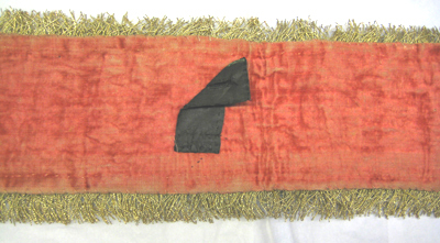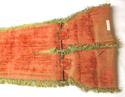Avsmalnande axelgehäng bestående av två delar vid varandra fästade med ett metallspänne med en oval sölja överklädd med guldtråd. Gehängets breda ände delar sig i två tampar och vid vardera tamp är fästat ett litet stycke med en ficka för fäste av värjan. En, rektangulär lös hälla av metall, överklädd med guldtråd sitter runtom den smalare änden av gehänget. Gehänget har ett yttäckande broderi av guldtråd med gaufrure i botten. Därpå är broderat i relief från båda håll, mötandes i mitten så att motiven kan ses rättvänt då gehänget är buret. Broderiet bär antikiserande motiv med korteger med ryttare och romerska soldater, dragna av fantasifullt utformade djur, lejon, vädurar och elefanter och ringlande ormar samt med trofégrupper och vattenkonster. Vid gehängets mitt är broderat en skock av fåglar under ett moln genom vilket solen tränger fram. Runtom- och i motiven är broderat små blommor. Broderiet är av guldtråd med detaljer av silketråd i rött, blått, svart, vitt och beige. Svarta pärlor utgör djurens ögon. Förgyllda paljetter är strödda över broderiet. Formspråket är böljande med voluter. Vid gehängets smala ände förekommer inget broderi. Istället är ovansidan klädd med röd sammet och ytterst skjuter mellanfodret av brunt läder fram i en flik. På fliken sitter en metallnit. Gehänget kantas av en drejad guldfrans, 26 mm lång. Franskanten är av tvinnade guldsnoddar och med ett invävt band omvirat med guldtråd. Innanför franskanten löper en upphöjd bård med korslagda band omvirade med silketråd och med små knoppar av silvertråd. Gehänget är på undersidan fodrat med röd sammet.