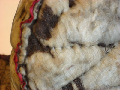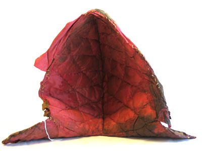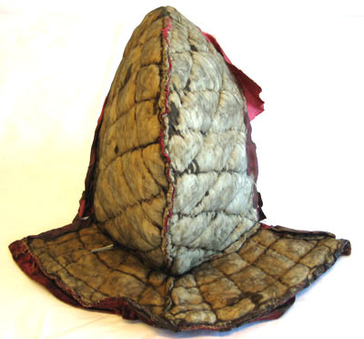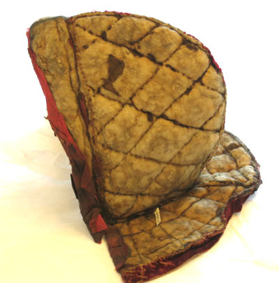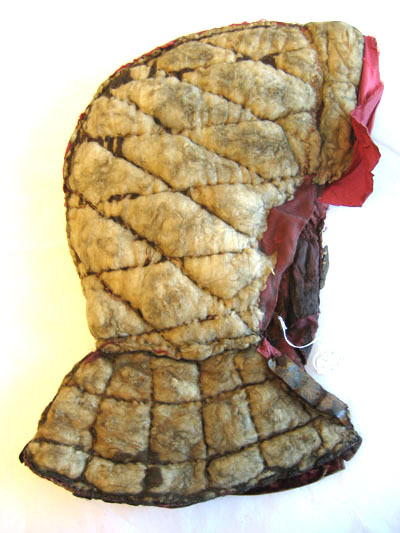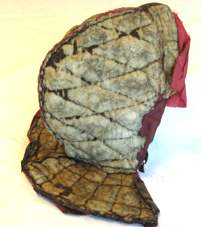 Foder till hjälm av vitt ylle som är beklädd invändigt med rött siden och utvändigt antagligen med ett ockra färgad tyg i linne. Hela luvan är lagad med crepelin. Vid luvans nedre kant på båda sidor är en läderrem som är 50 mm lång och 18 mm djup respektive 35 mm lång samt 10 mm djup.