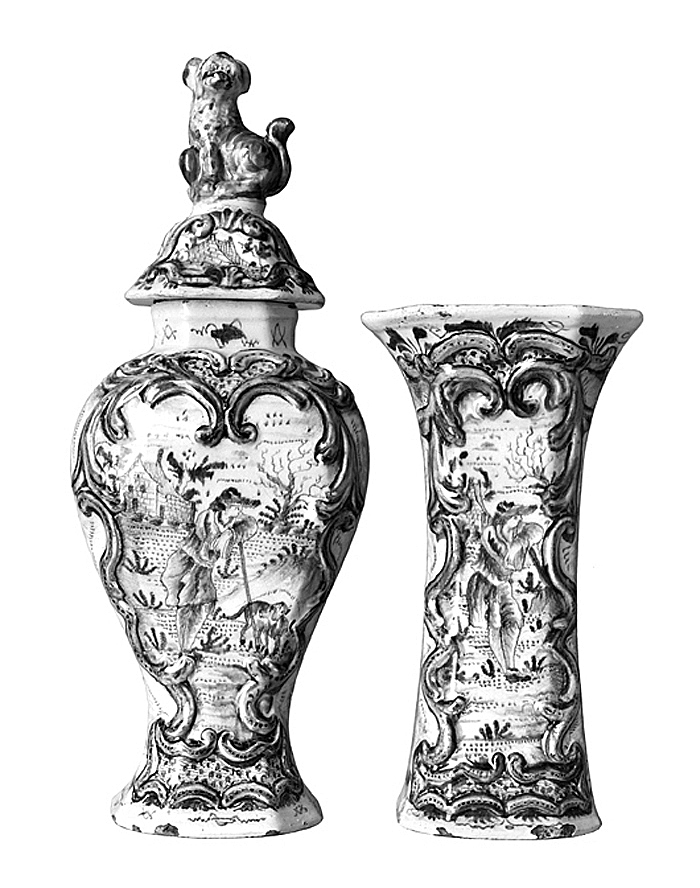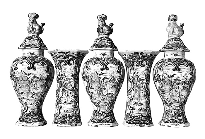 KAMINGARNITYR. Bestående av tre urnor med lock samt två vaser. Dekor: I relief samt i blått (ojämnt och utflutet) på tennglasyr. Godset blekt brungult. Urnor: Omvänt päronformiga, tvärsnitt rektangulärt med fasade hörn; hals kort, rakt uppstående, fot utsvängd samt med insänkt botten. På framsidan ett bildfält inom låg reliefram av rokokobågar och bladornament i blått, ramen följande framsidans konturer. I fältet en mansfigur stående i en trädgård och lutande sig åt höger mot en lång käpp, intill käppen en släthårig hund med lång svans. Mannen befinner sig i ett landskap. På två av urnorna på bottnens utsida en signering i blått. Lock: Högt kupiga med svagt karnisformig profil; knopp stor, i form av en sittande hund (imiterande FoS hund, ett i den kinesiska keramiken ofta förekommande motiv) med huvudet vridet åt vänstra sidan. Höjd 35,5 cm, utan lock, höjd 23,8 cm, längd 13,6 cm, bredd 10,6 cm. Lock, höjd 13,1 cm, längd 9,7 cm, bredd 8,2 cm.