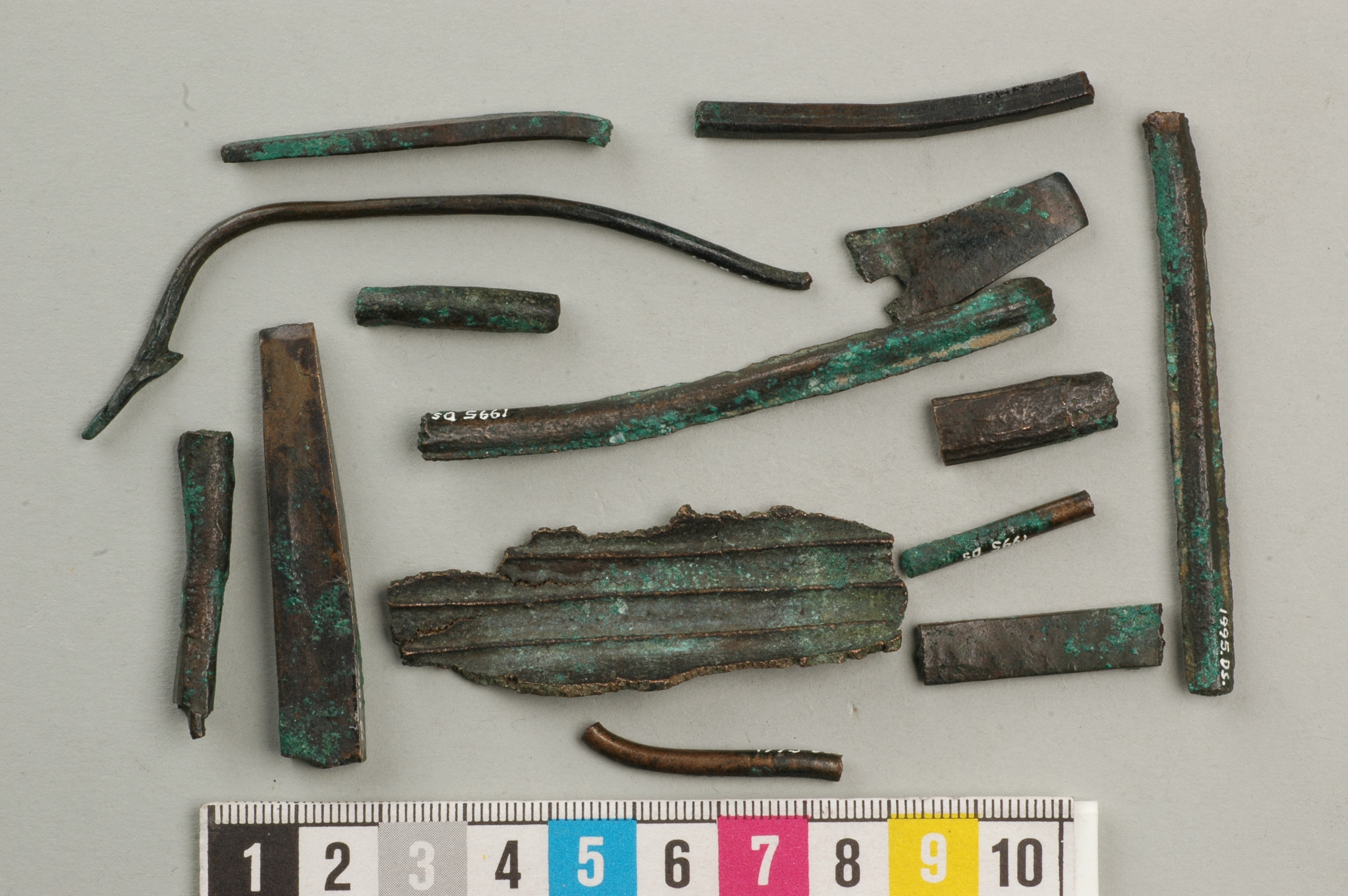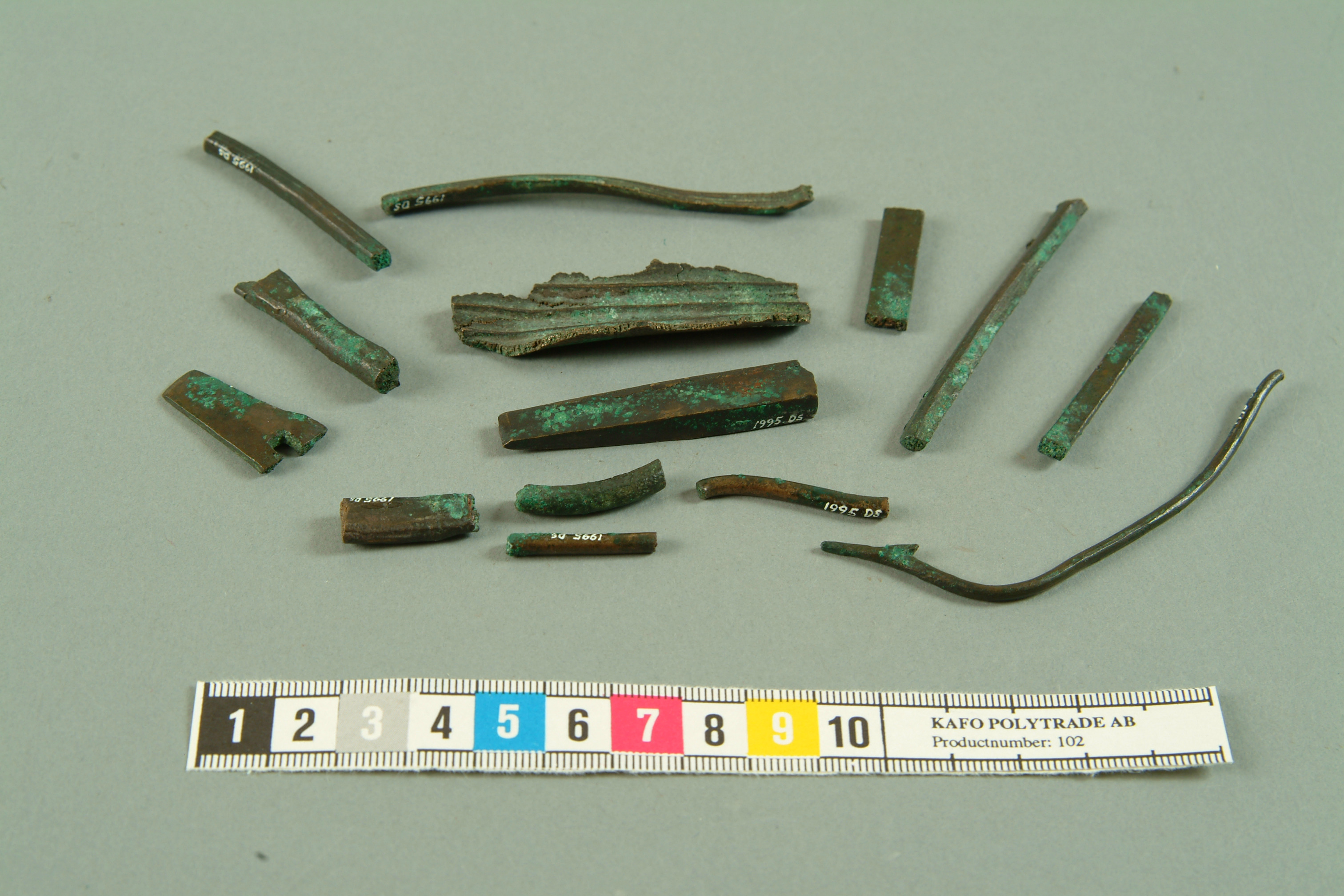 Fjorton gjutavfall av brons. fyrkantiga tenar, platt fragment med tre åsar, bleck med hål och tenar varav en med krok i ena änden. En ten sågad för metallanalys 2009.
