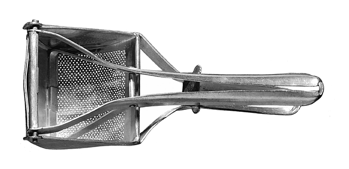 PURÉPRESS Av förtent järnplåt. Bestående av två i varandra fällbara hälfter; den yttre utgöres av en form med hjärtformiga ändar av hel plåt, sidorna mellan dessa genombrutna med små runda hål; inre delen utgöres av en något bågformig skiva med uppvikta kanter samt fällbar på en axel vid framkanten i den yttre delen. Vardera hälften försedd med ett långt skaft av tunt bandjärn, omvikt på mitten samt med ändarna förgrenade och fästa vid respektive hälfter; mellan skaftet och den bågformiga skivans inre ände en gaffelformig stötta med ändarna fastnitatde vid skaftet; på den yttre hälftens skaft vid förgreningen en tvärgående skiva (till stöd, då skaften fälls mot varandra). Höjd: 9,2 cm.; längd: 28,8 cm.; bredd: 10,1 cm.