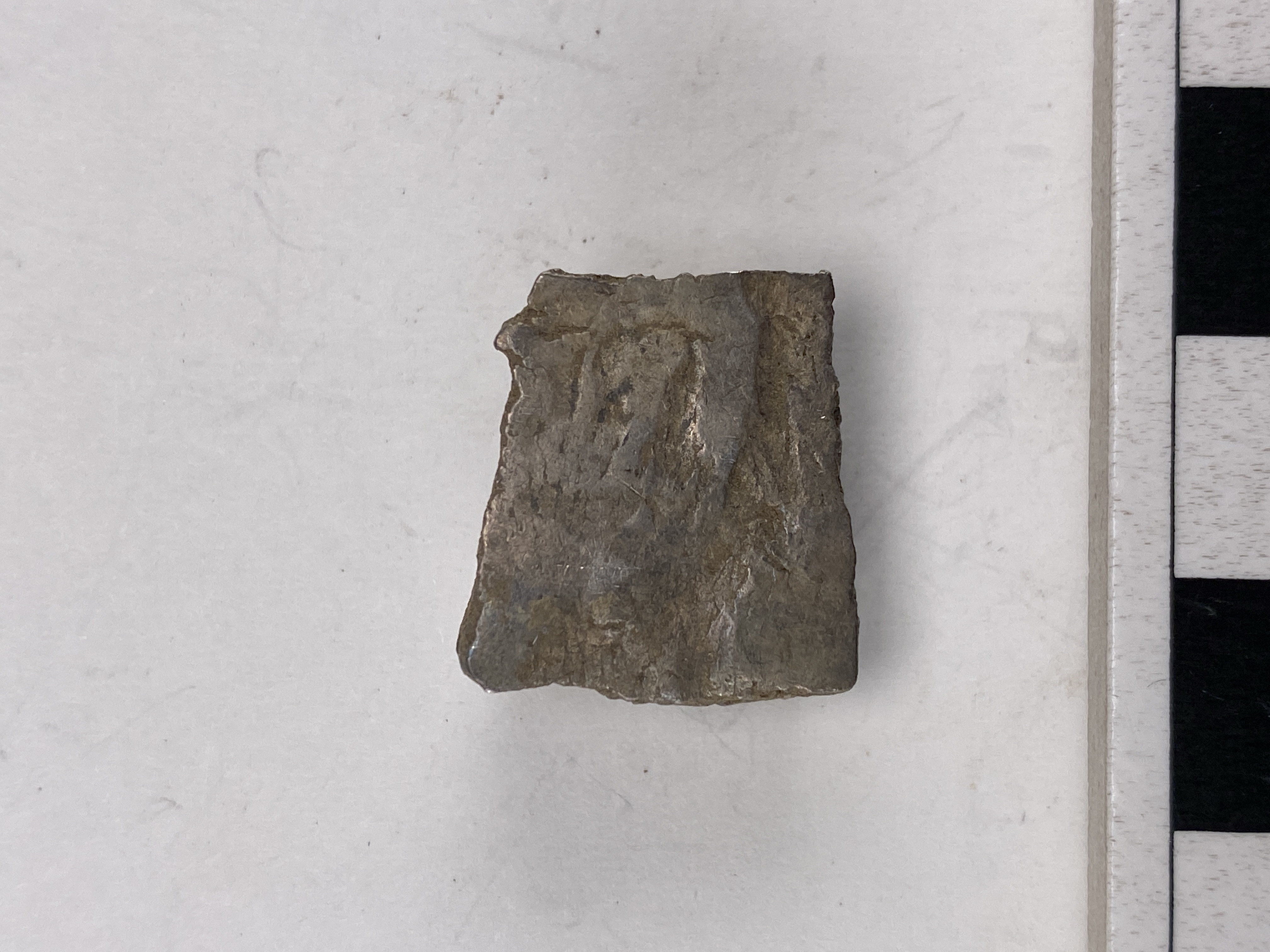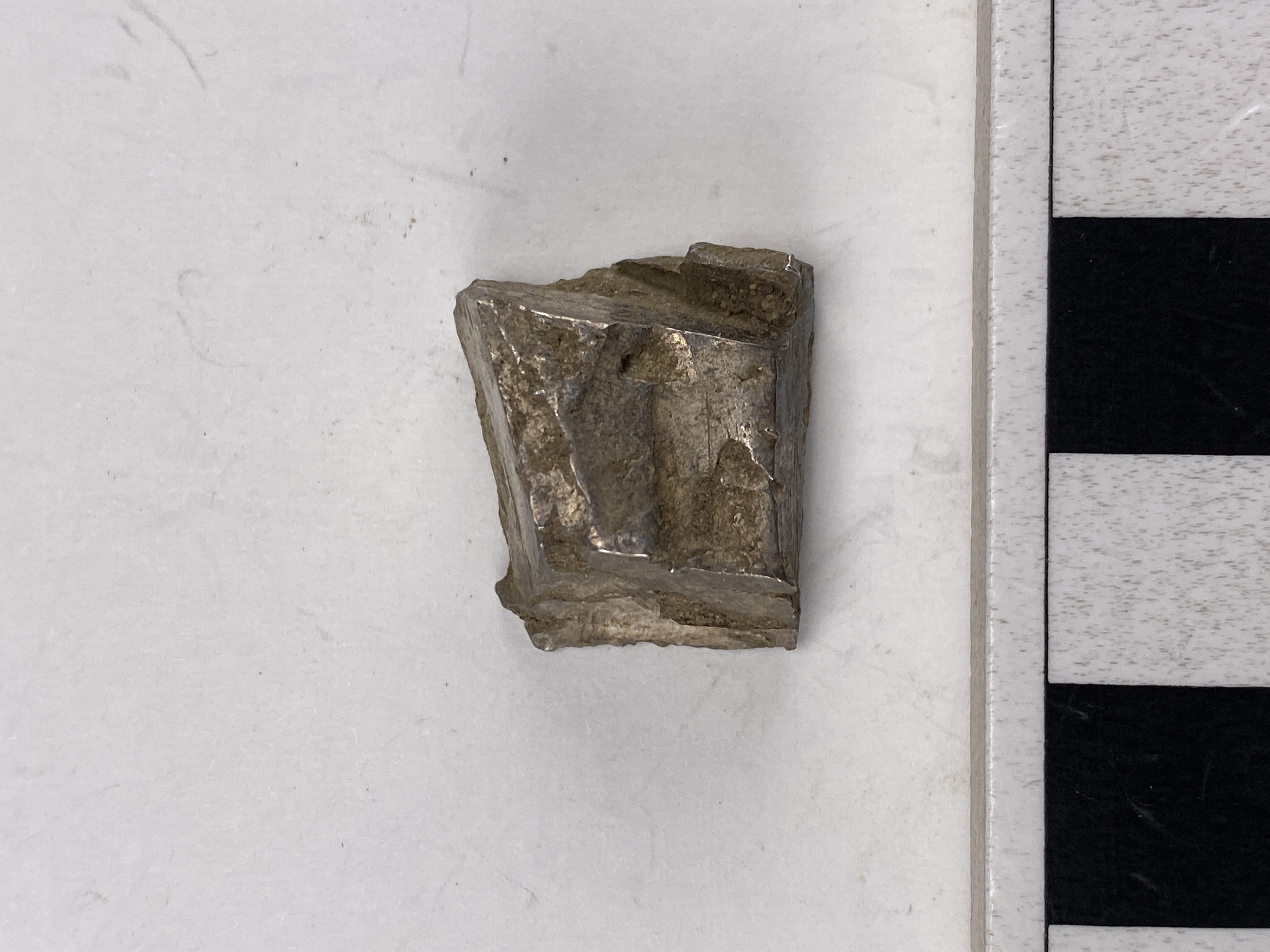 Silverstycke, avhugget/knipsat på fyra sidor.