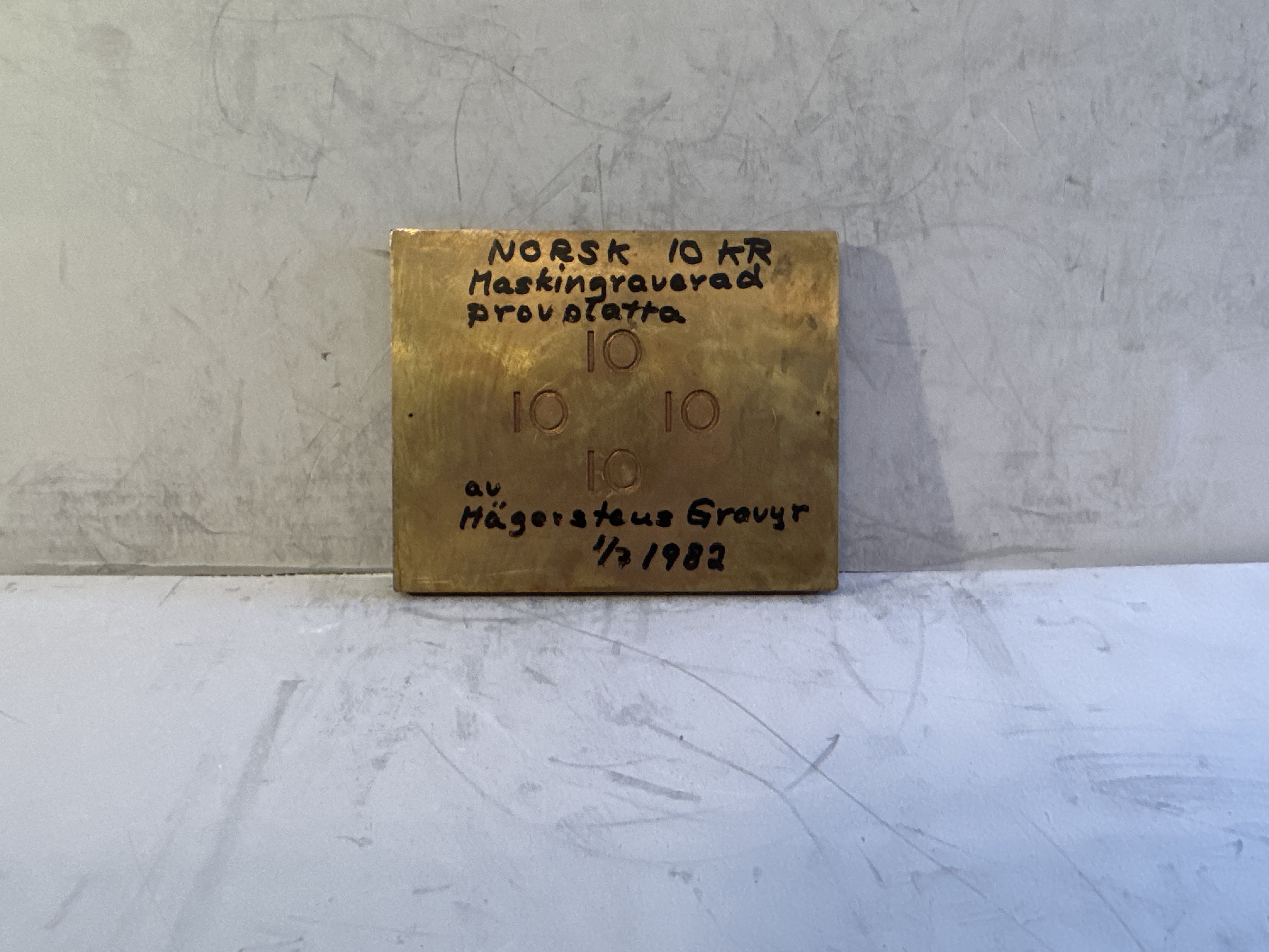Pressplatta för vattenmärkestillverkning. Plattan tillverkad i koppar och bly, med motiv föreställande siffran tio. Plattans framsida med påskrift i tusch: "NORSK 10 KR Maskingraverad provplatta av Hägerstens Gravyr 1/7 1982".