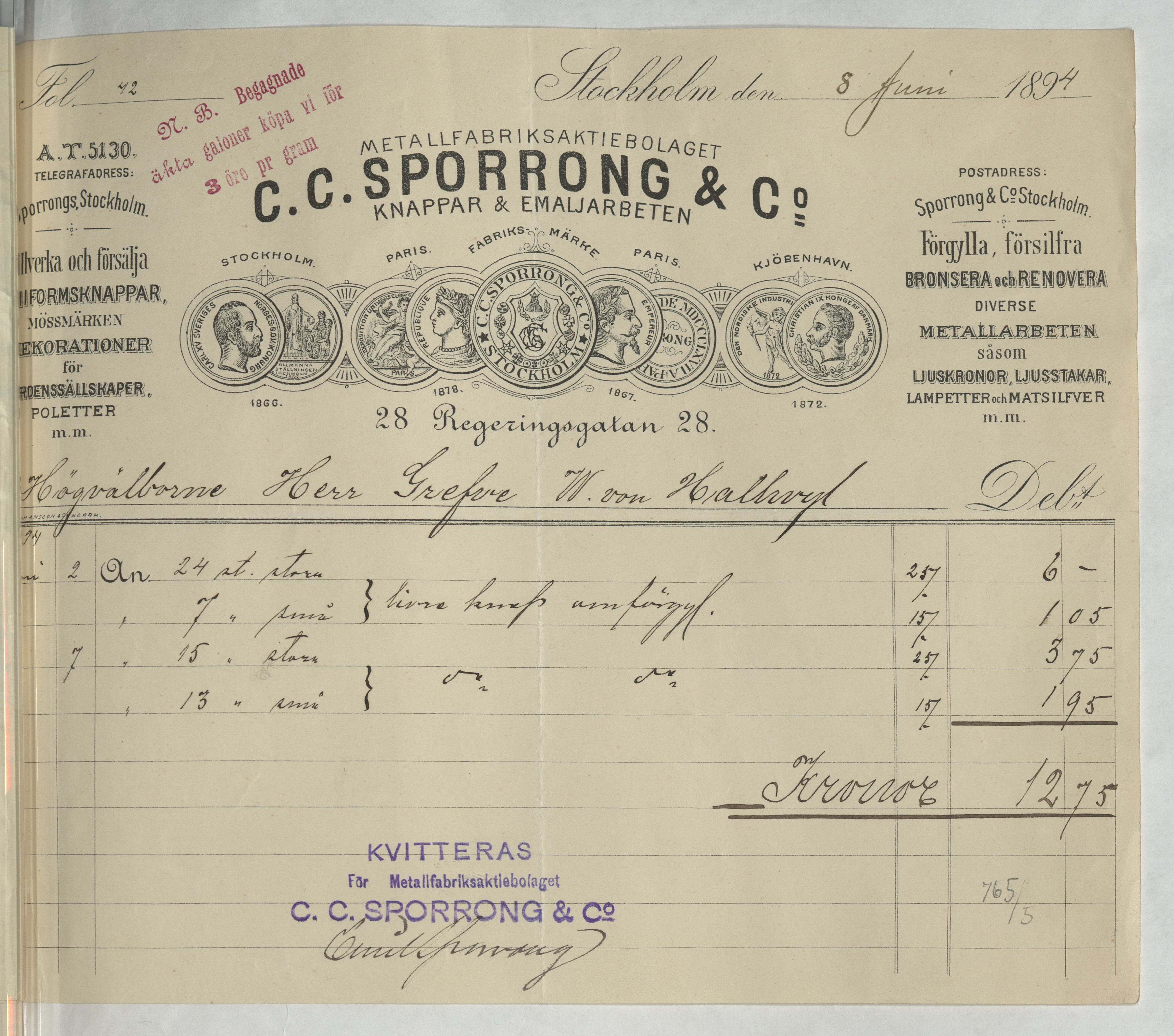 Kvitto från C. C. Sporrong & Co. Gällande omförgyllning av livréknappar. Stockholm, 1894.