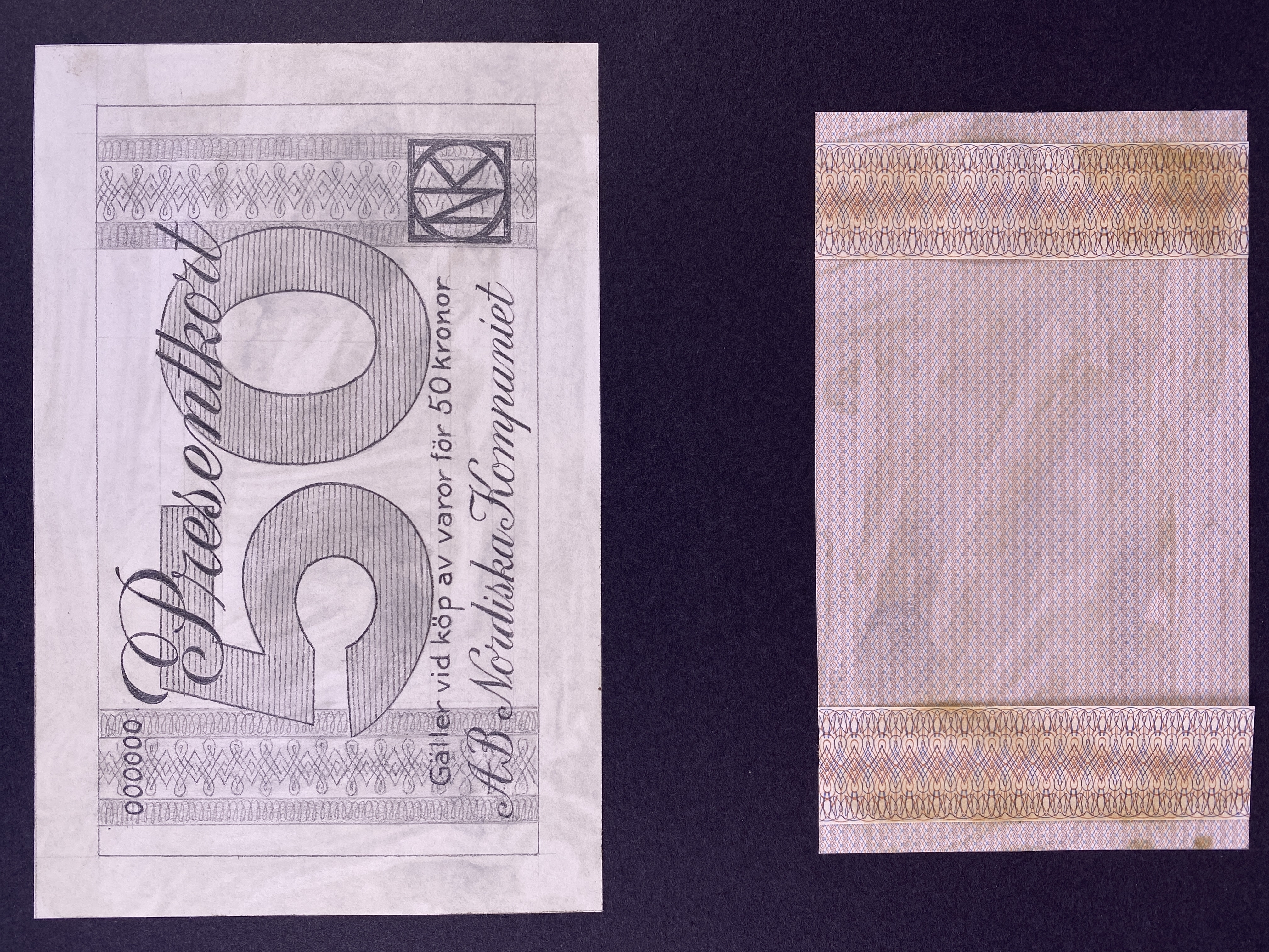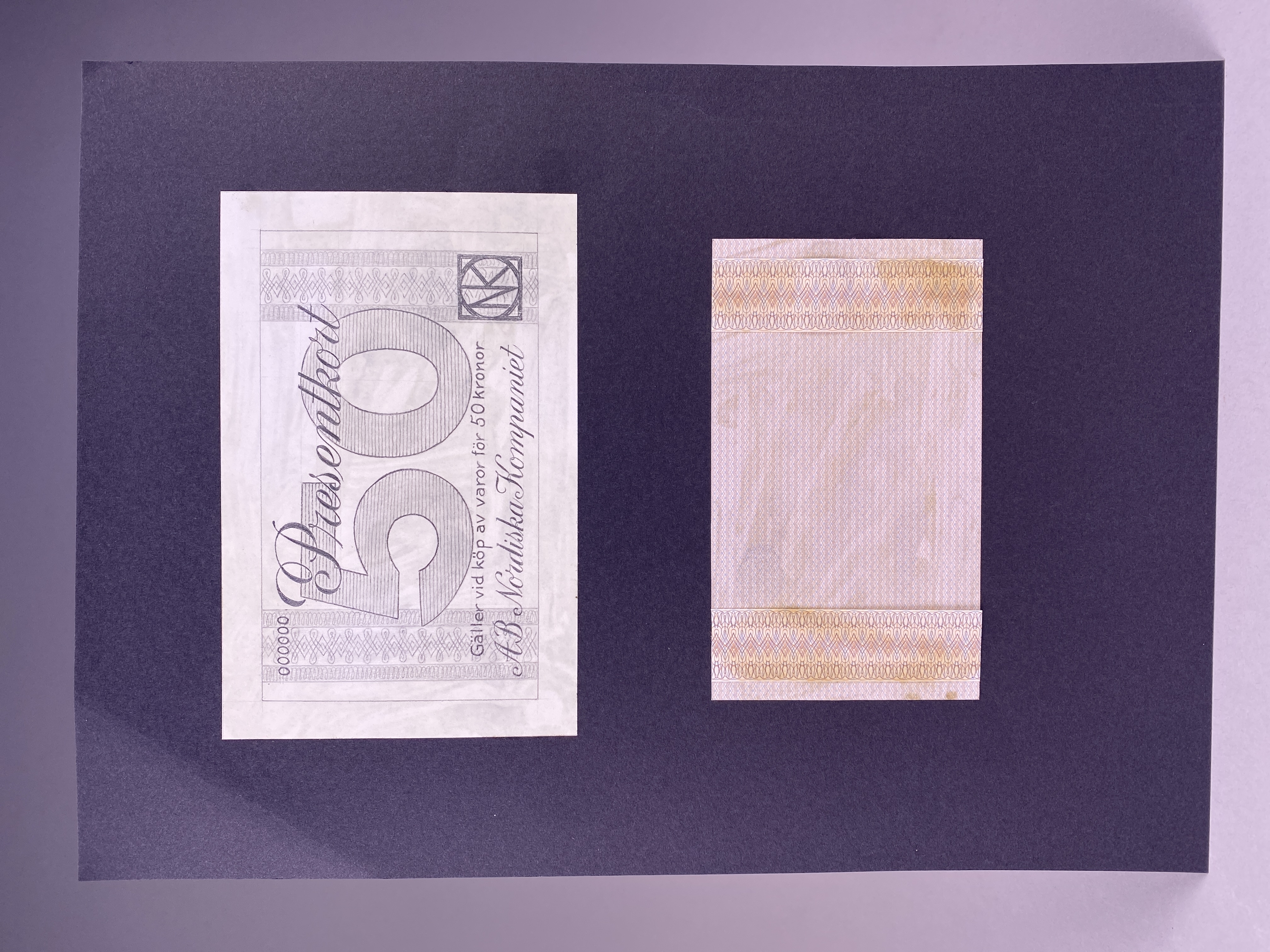 Designförslag på NKs presentkort med ett värde av 50 kronor. Blyertsteckning samt tryckt bakgrund i en brun/gul nyans, båda klistrade på svart kartong. Ej daterad ark.