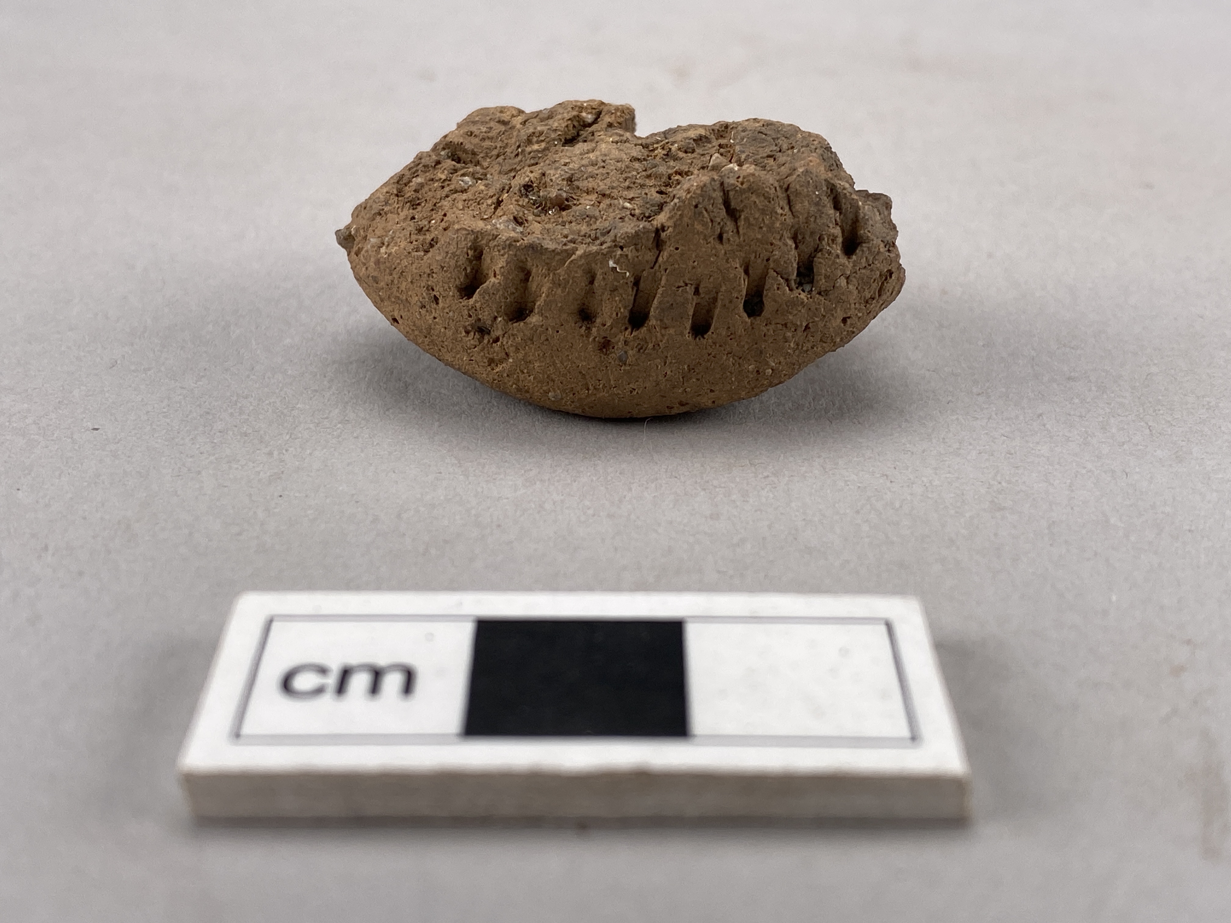 Hälften av en bikoniskt pärla av keramik. Dekorerad på båda sidor. Fast bergartsmagrat gods. Avbruten genom hålet.