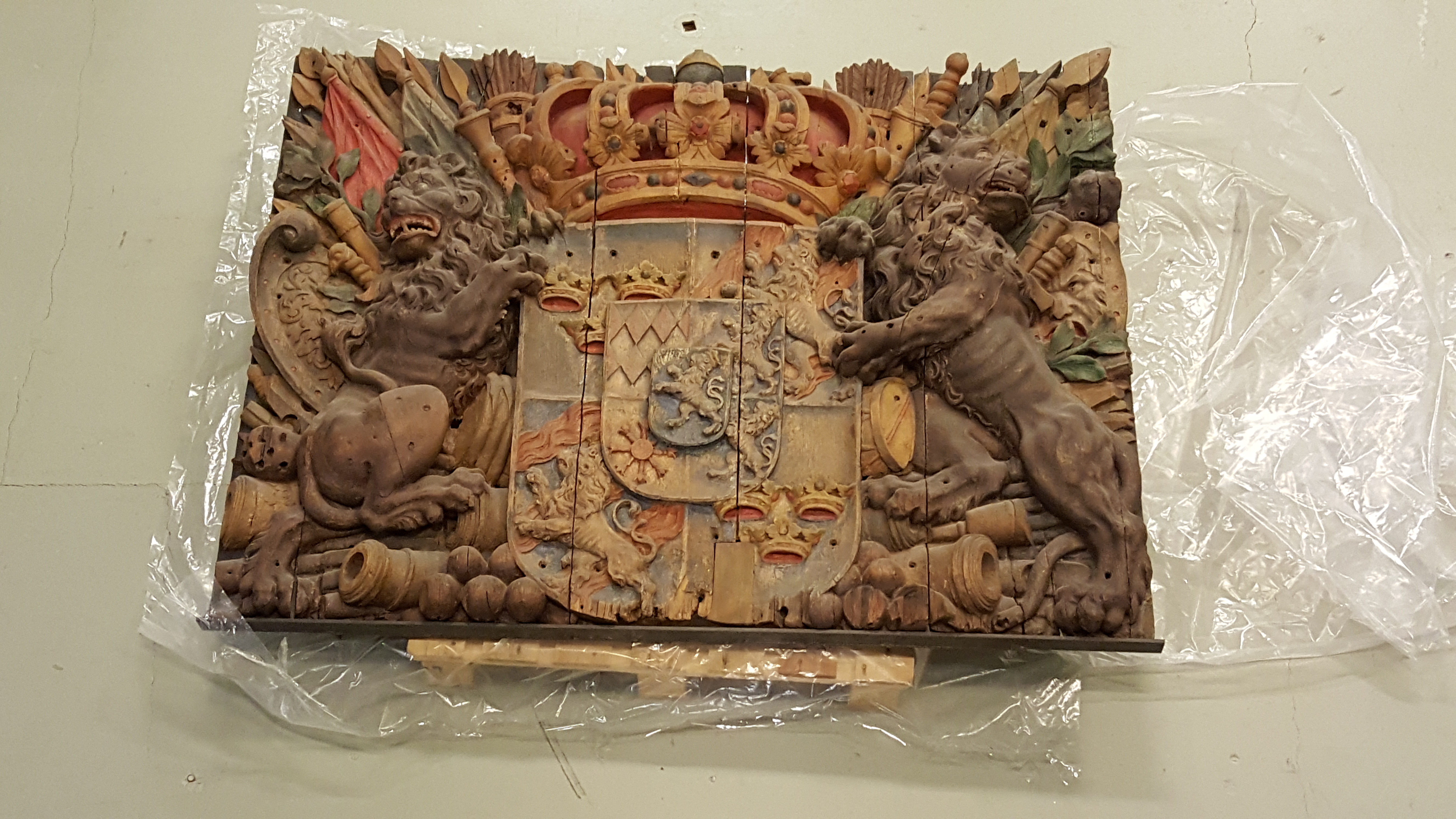 Riksvapen, Pfalziska dynastin (1654-1718), skuret i ek och målat. Färgerna är i dag delvis fel eftersom guld och silver har försvunnit och lämnat kvar en röd grundering. Vapnet ska enligt traditionen ha suttit på en slussport i Hjälmaren kanal.