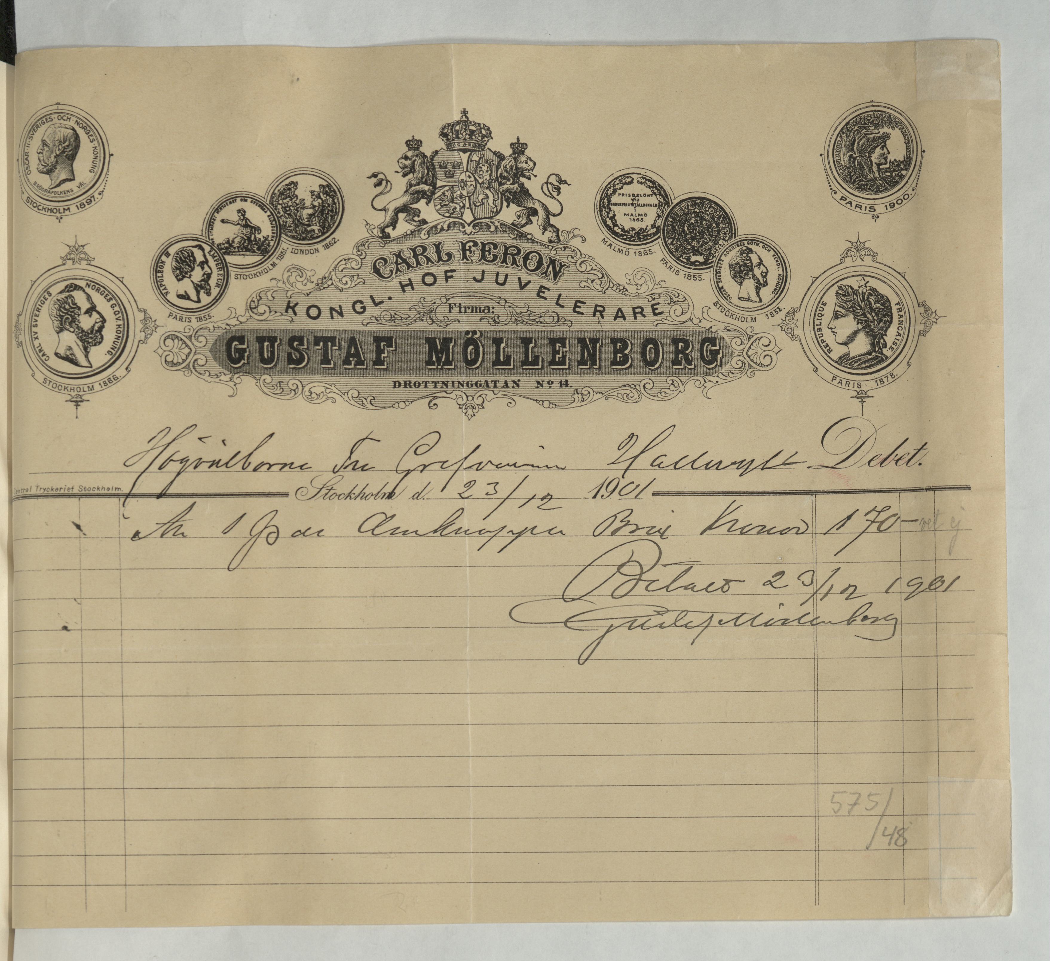 Kvitto från Gustaf Möllenborg, Juvelerare, 1901