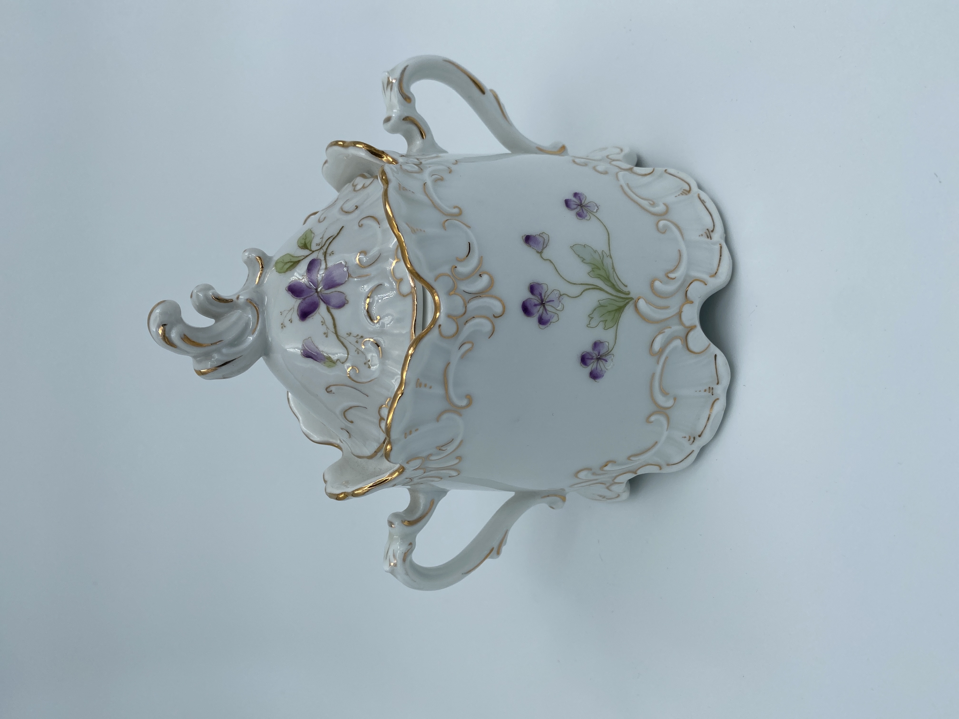 Sockerskål i porslin med tillhörande lock. Skålen har två handtag och är bemålad med violer och prästkragar. Ornamentik med gulddetaljer.