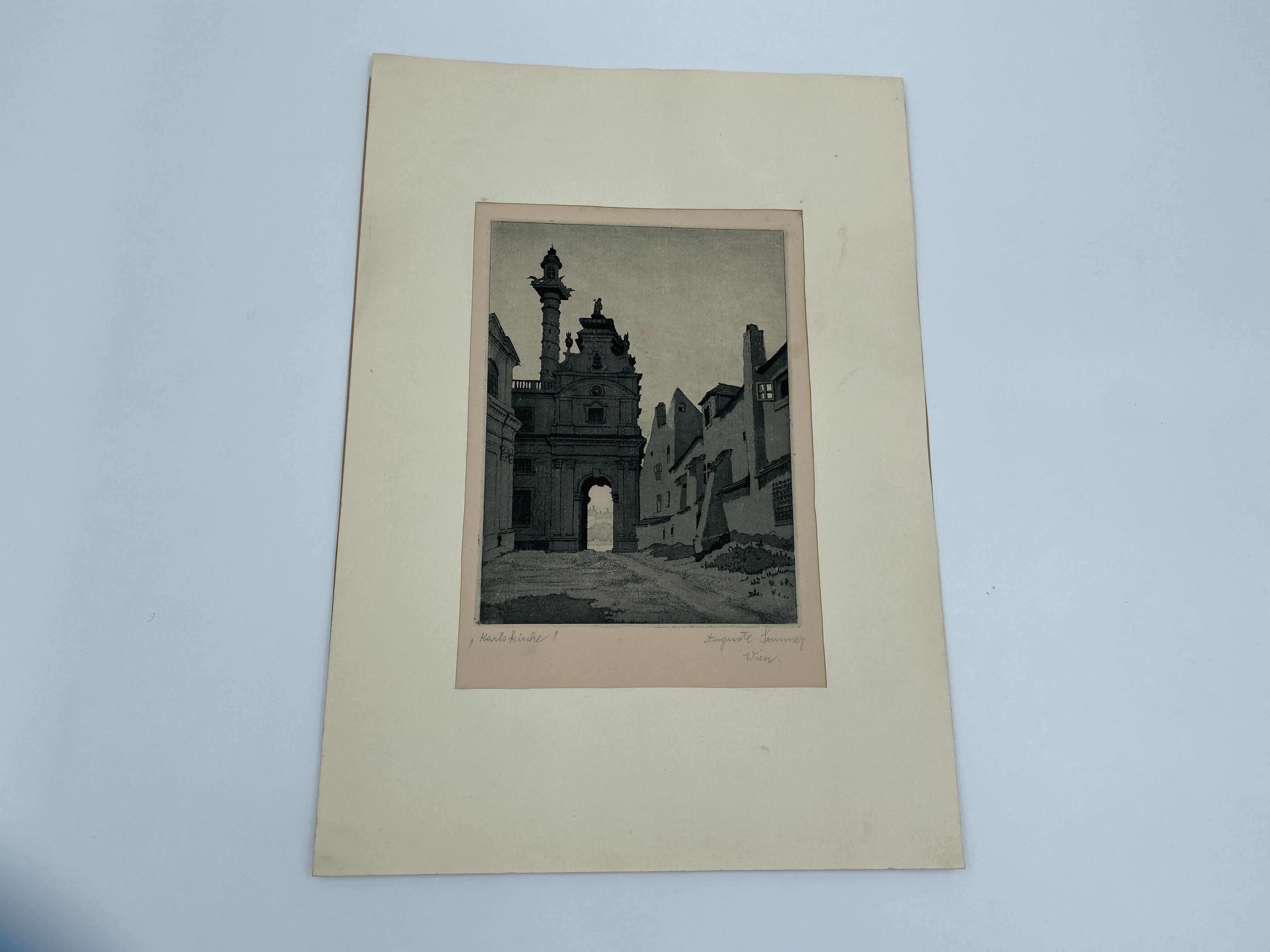 Kopparstick av Auguste Sommer, föreställande Karlskirche i Wien. Kopparsticket är monterat i passepartout.