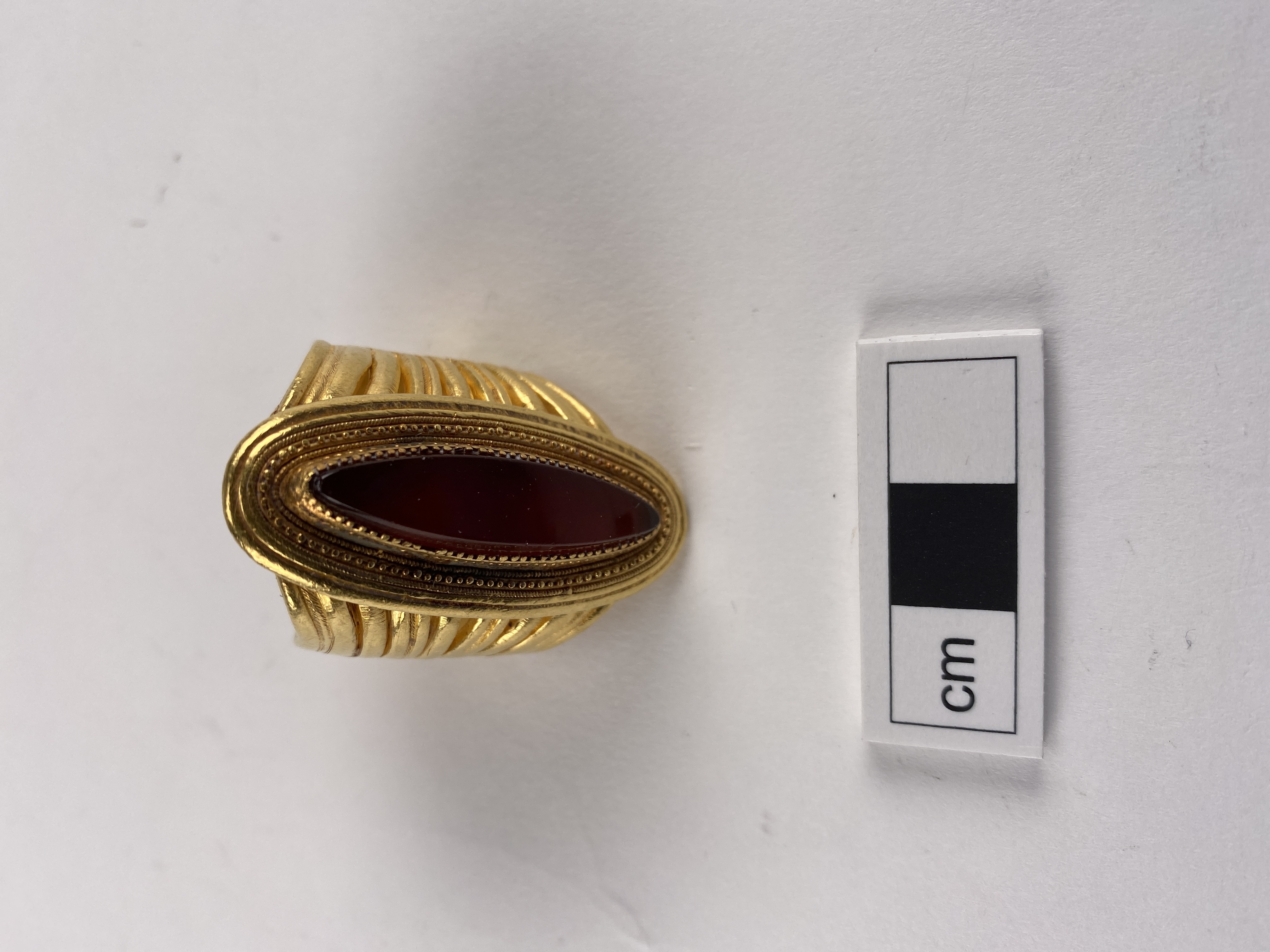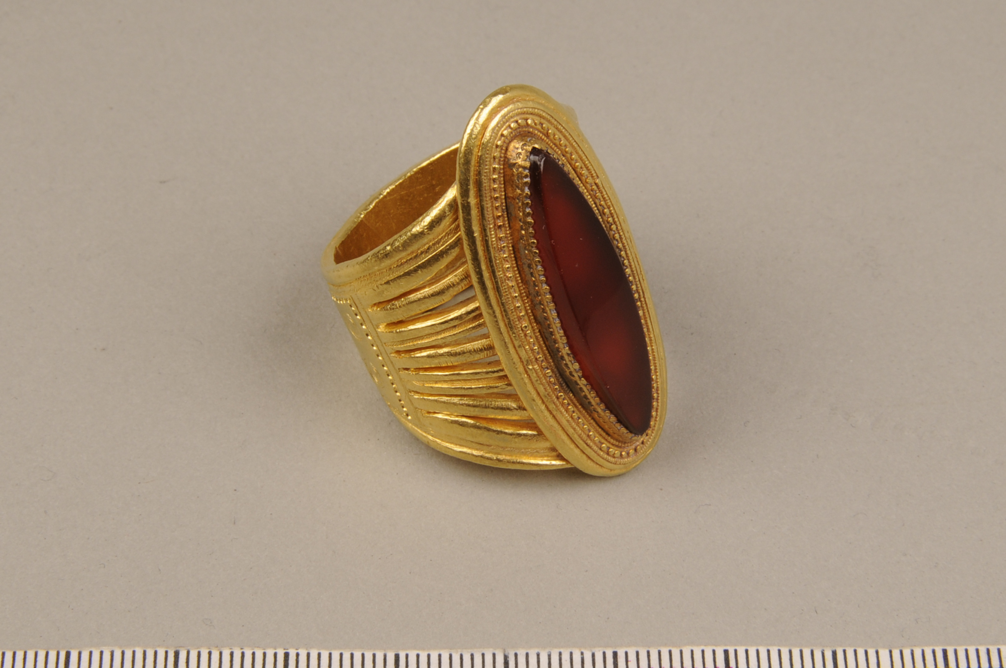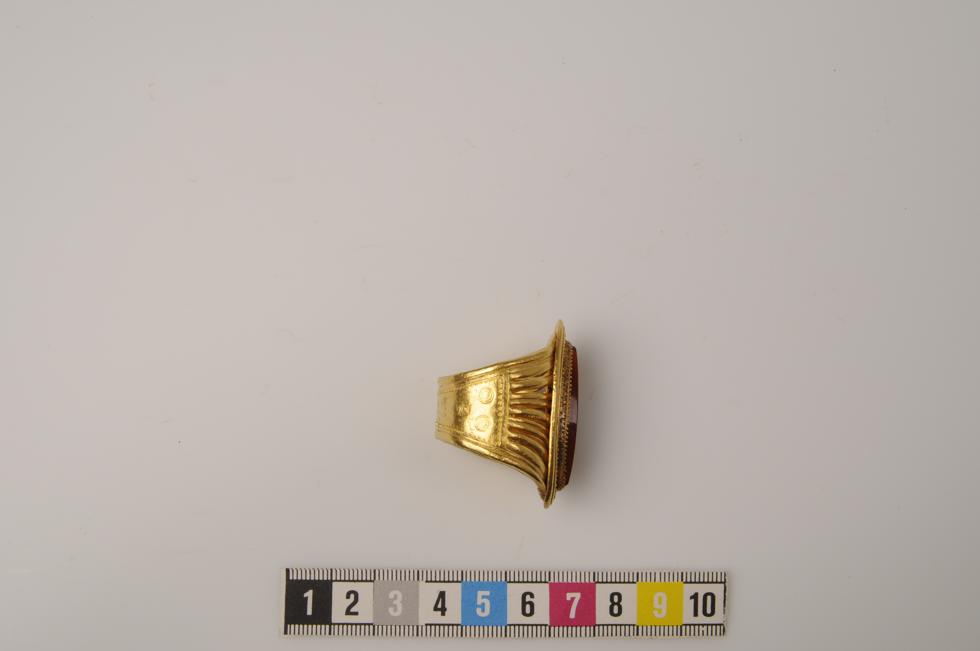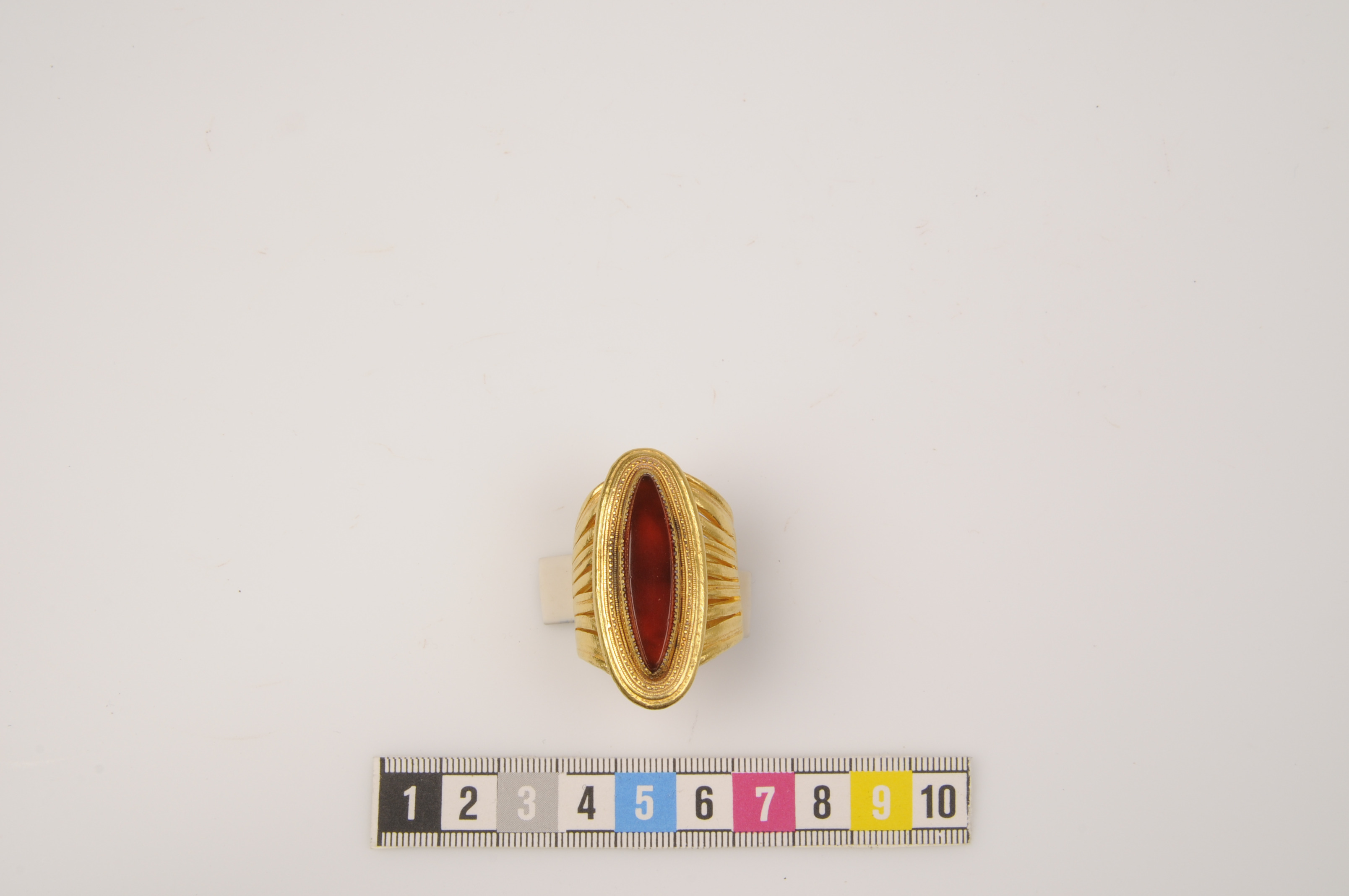 Fingerring av guld med en karneol, fattningen består av en kant, ornerad med halvcirklar, avslutad med små rundlar, nedanför kanten den ovala plattan, med en rad korn omgiven av strierade och släta trådar. Ringen mot fattningen bestående av sju tenar, varannan ornerad med en längsgående fåra, varannan slät. Med infattning