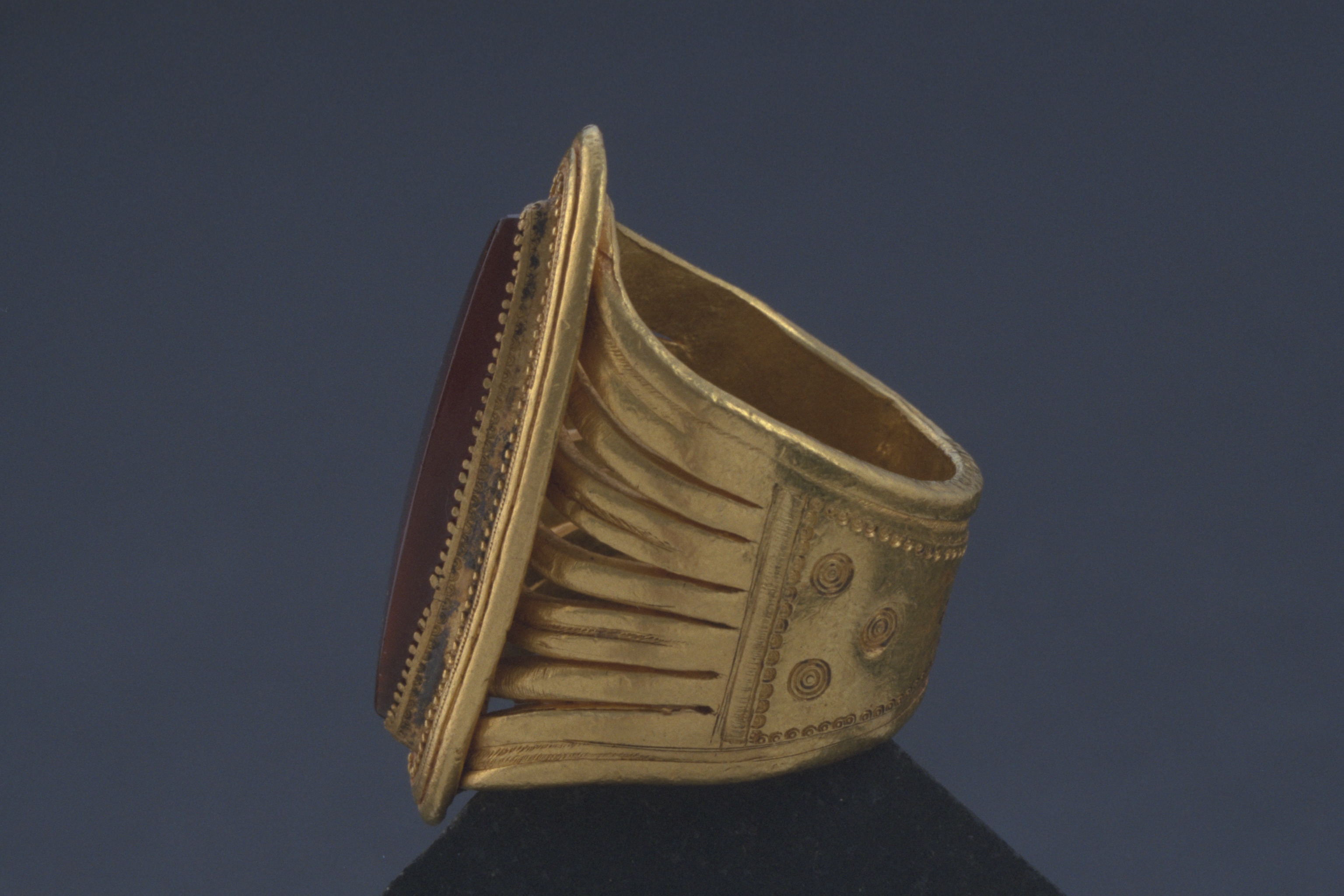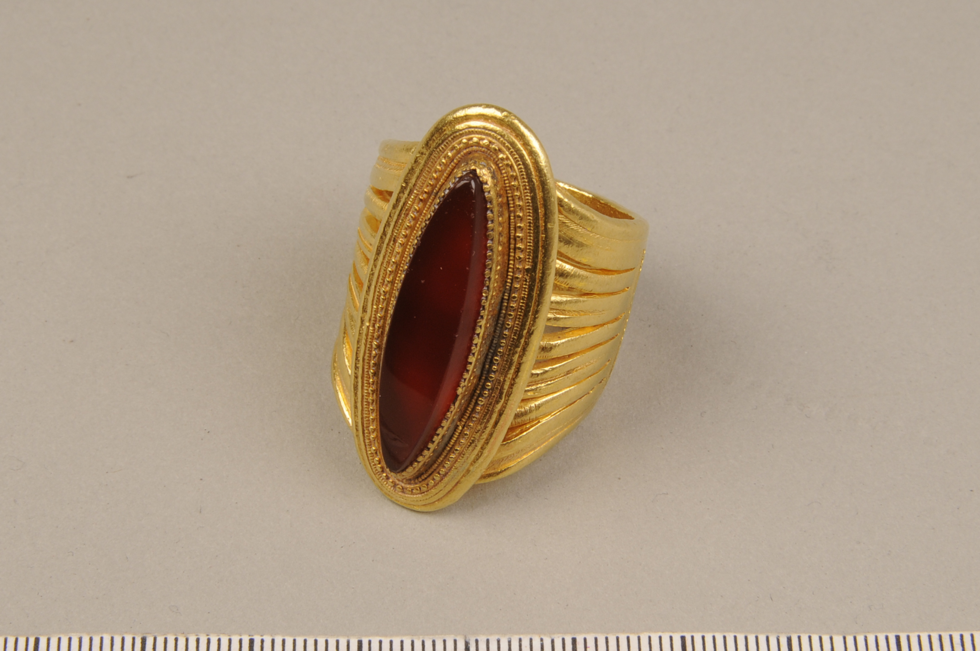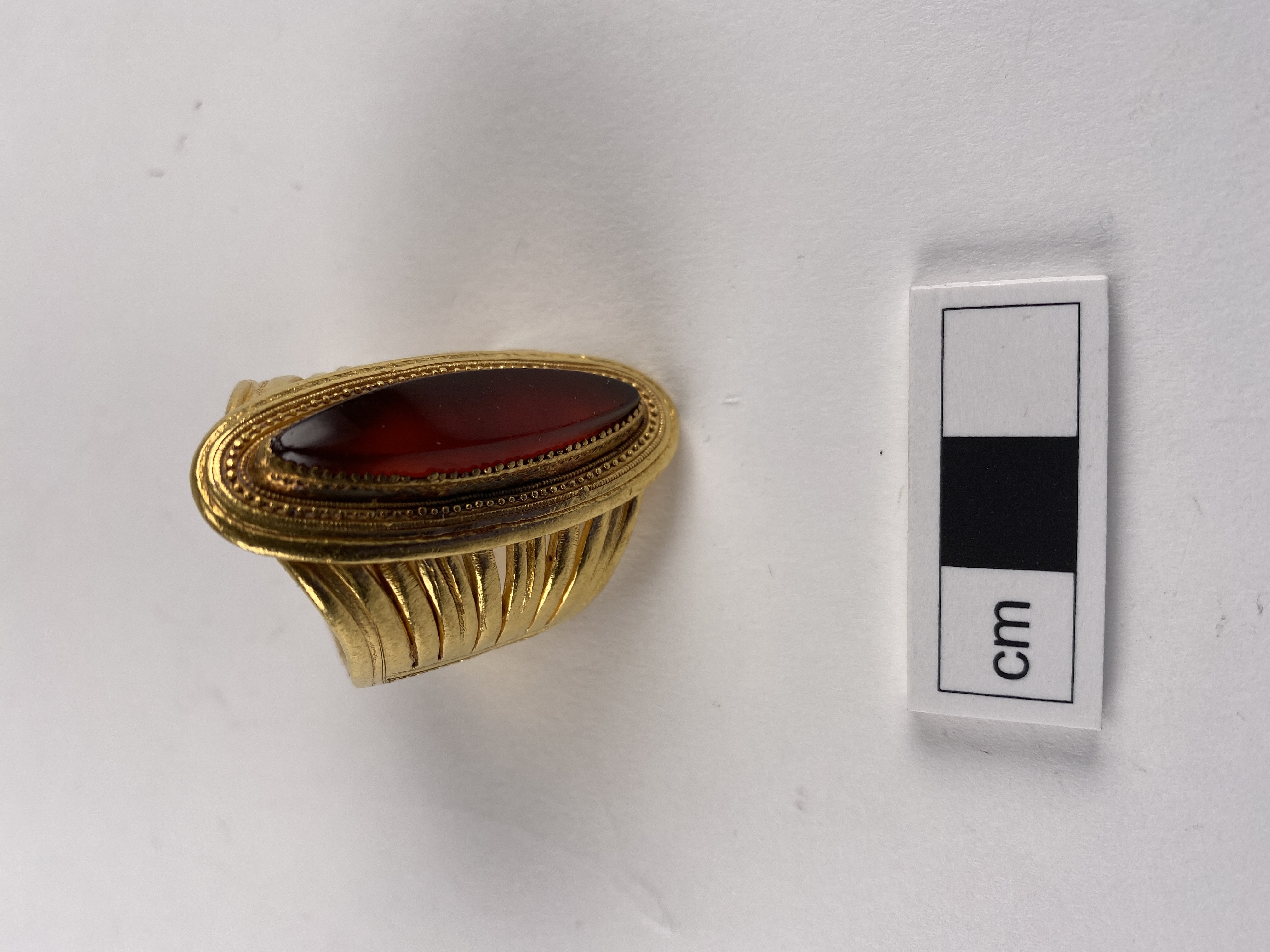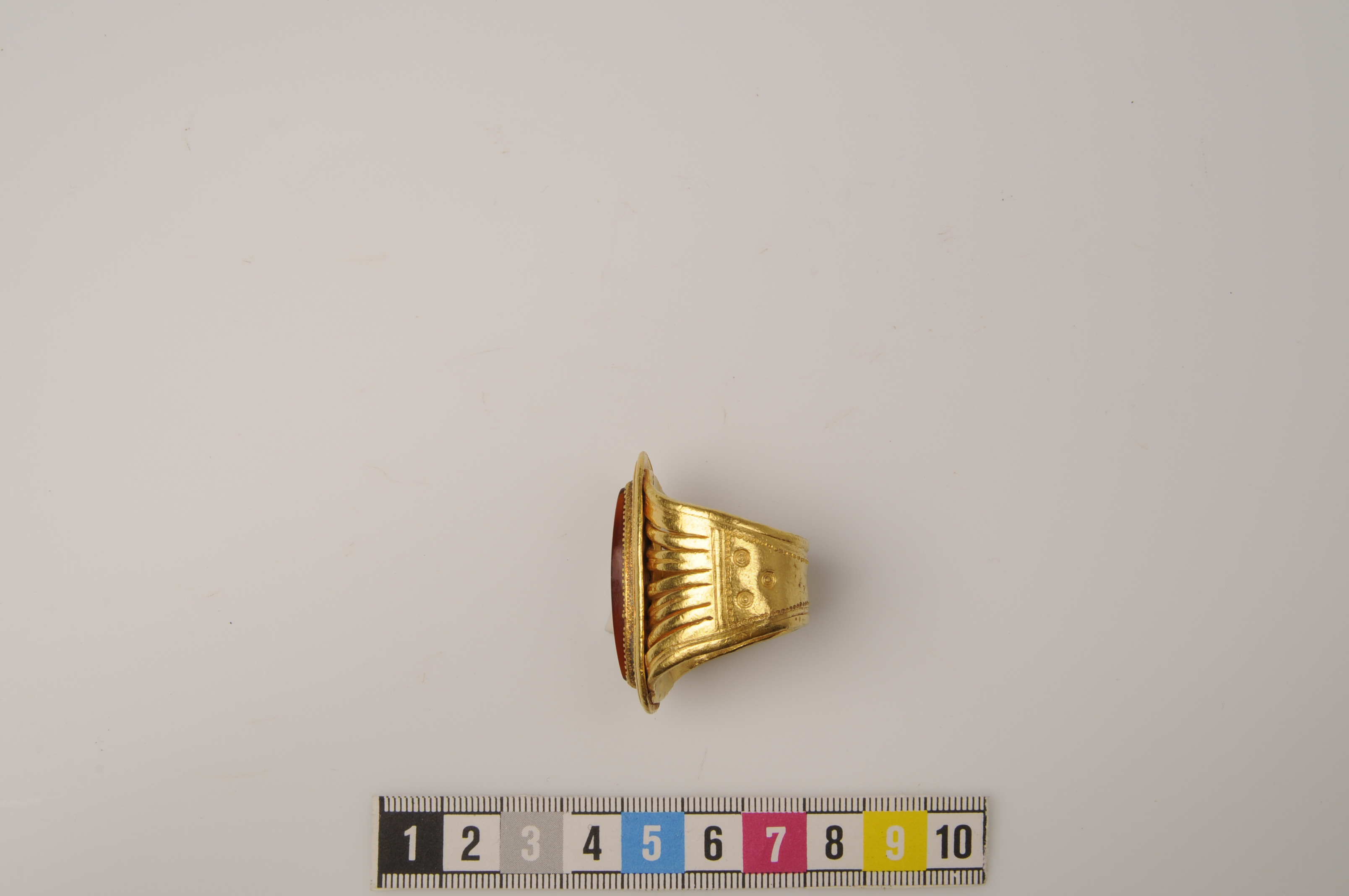 Fingerring av guld med en karneol, fattningen består av en kant, ornerad med halvcirklar, avslutad med små rundlar, nedanför kanten den ovala plattan, med en rad korn omgiven av strierade och släta trådar. Ringen mot fattningen bestående av sju tenar, varannan ornerad med en längsgående fåra, varannan slät. Med infattning