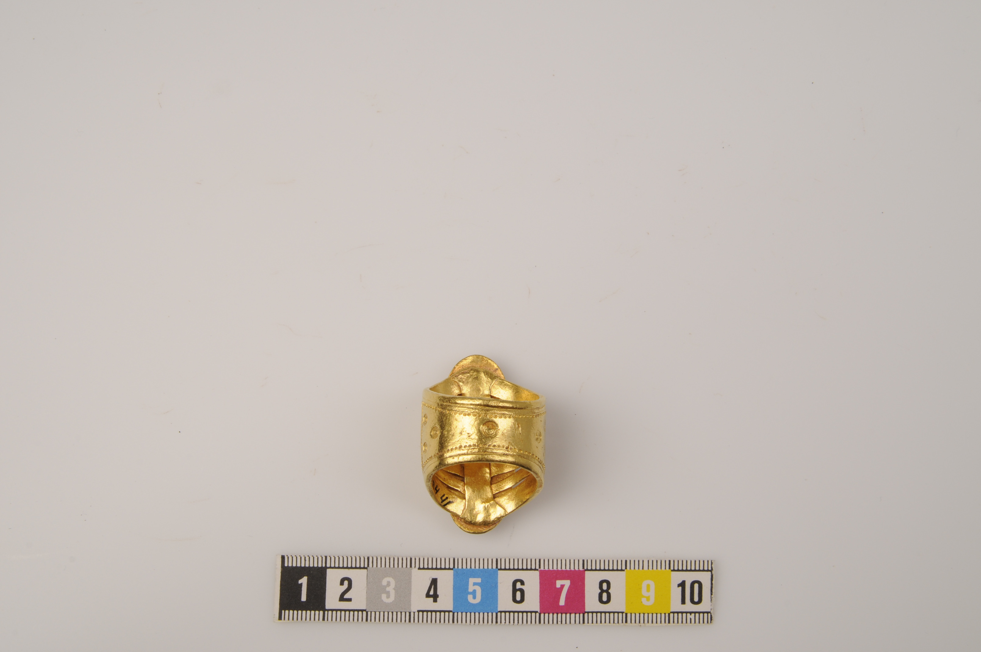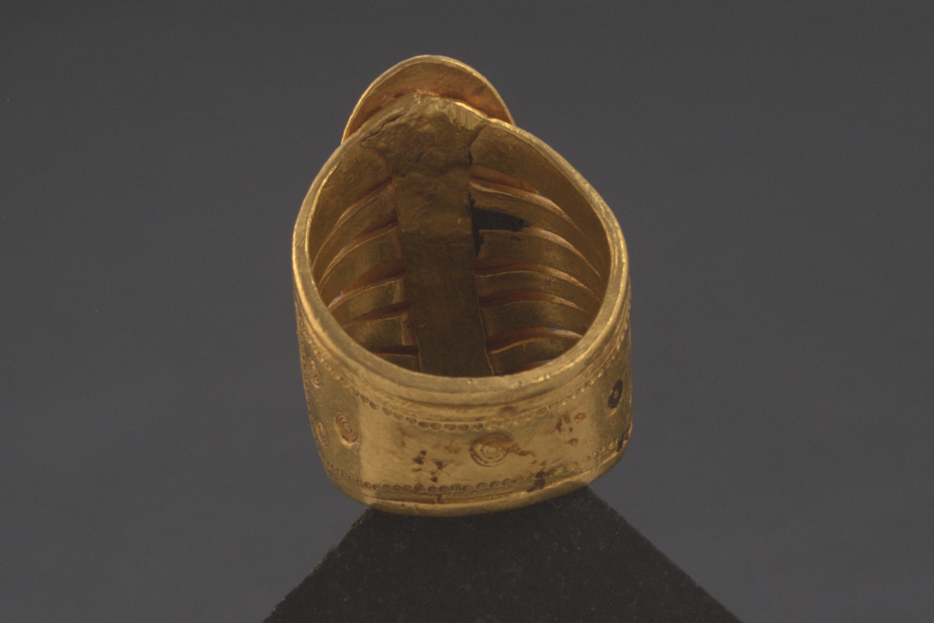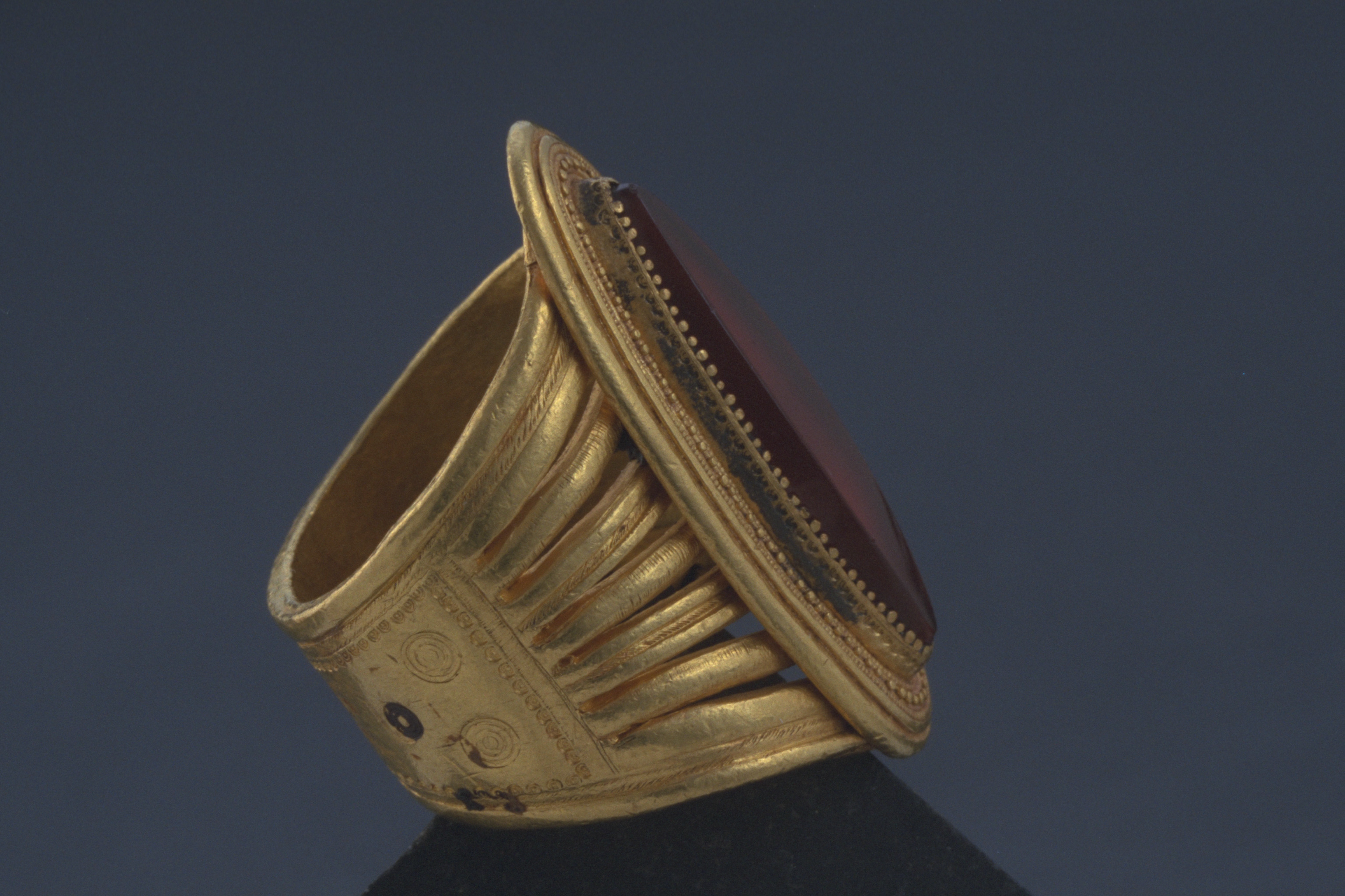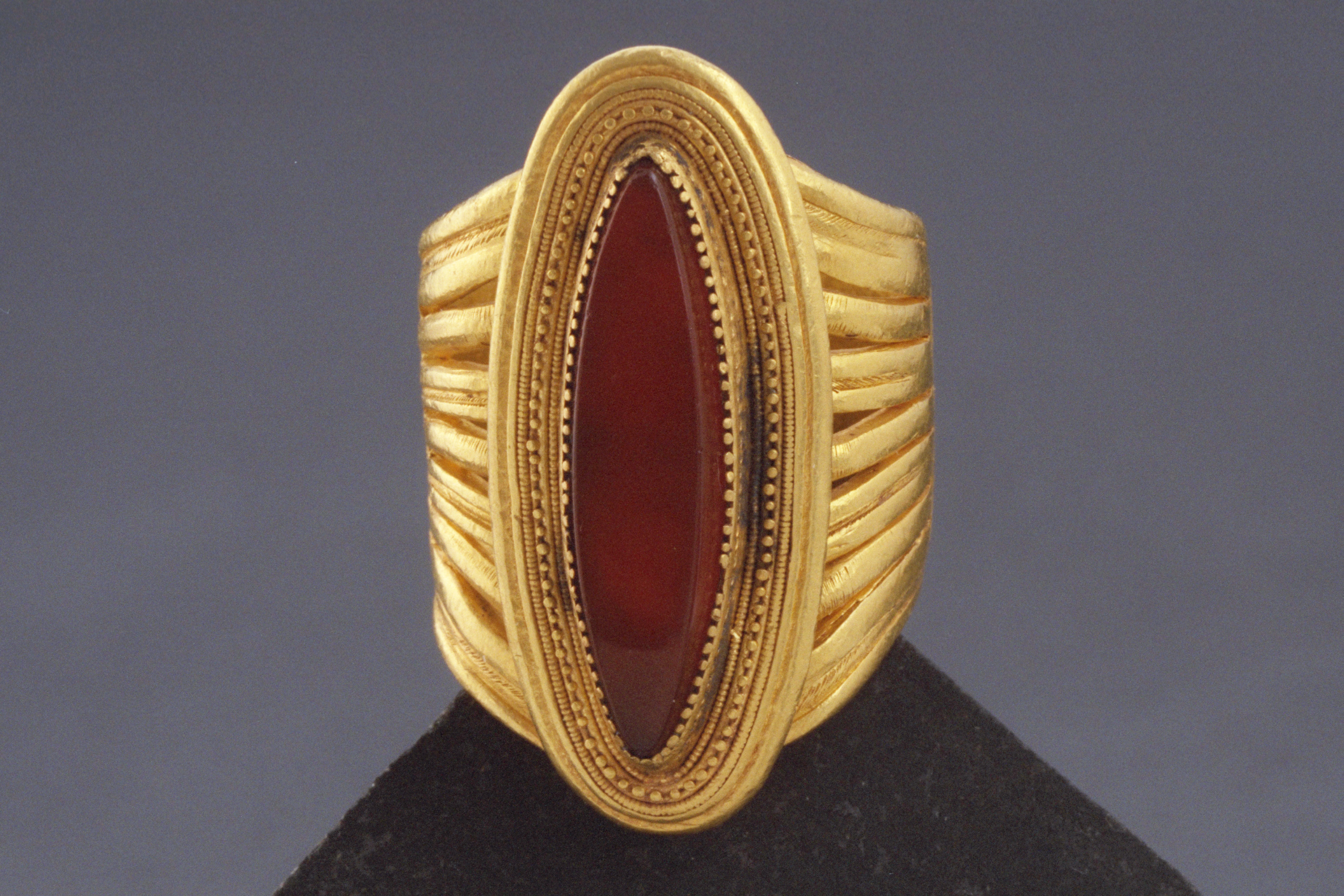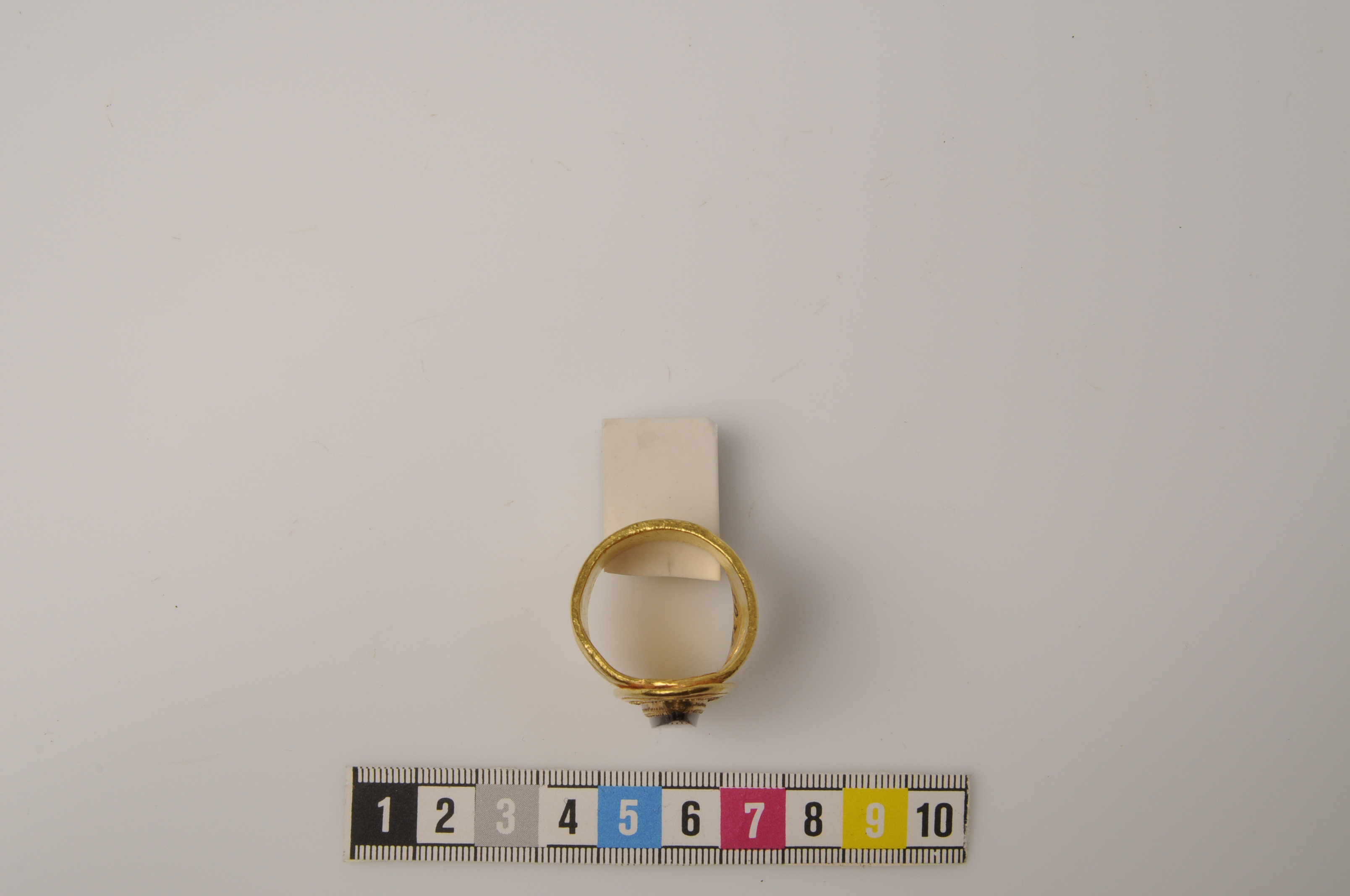 Fingerring av guld med en karneol, fattningen består av en kant, ornerad med halvcirklar, avslutad med små rundlar, nedanför kanten den ovala plattan, med en rad korn omgiven av strierade och släta trådar. Ringen mot fattningen bestående av sju tenar, varannan ornerad med en längsgående fåra, varannan slät. Med infattning