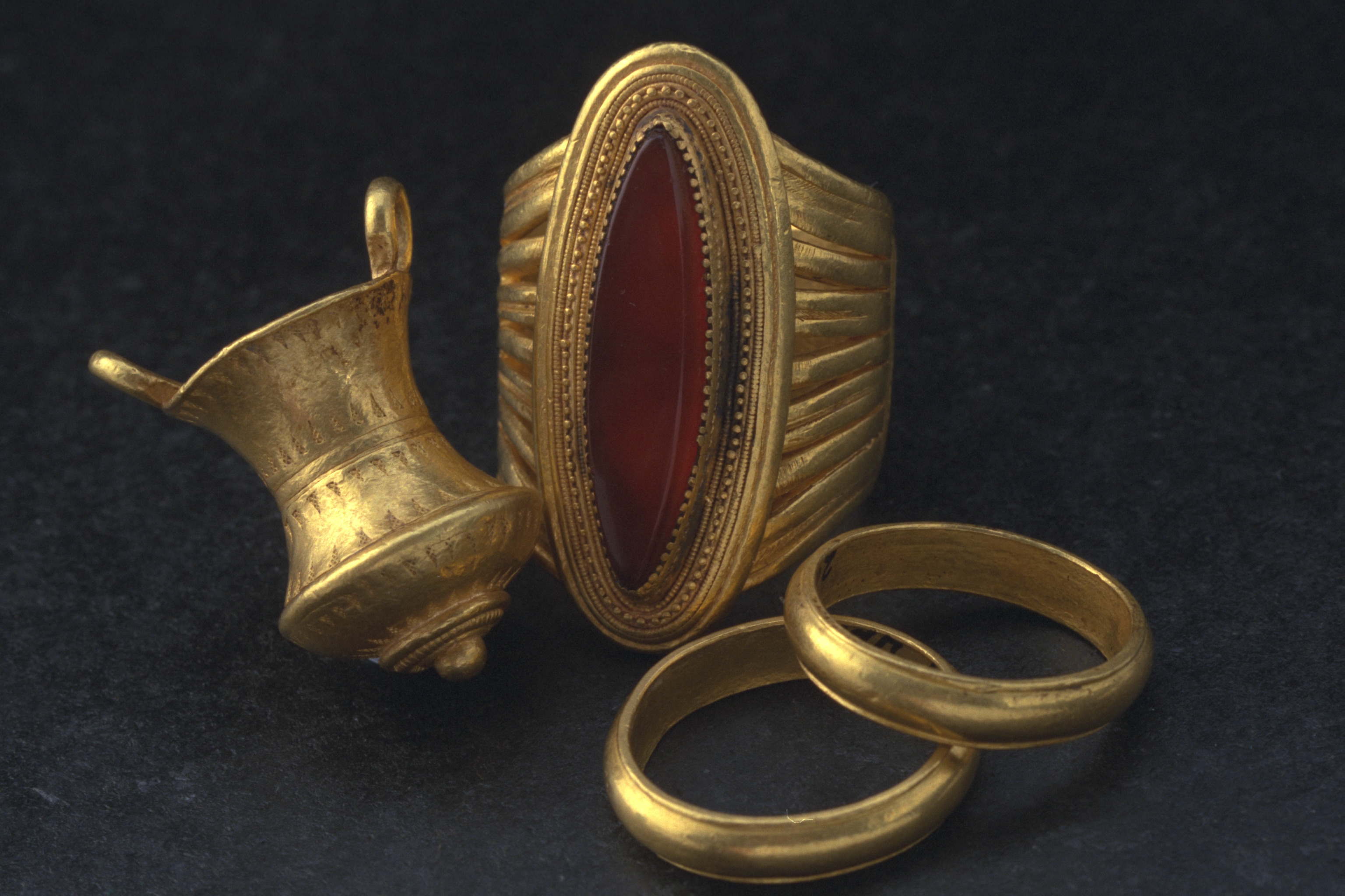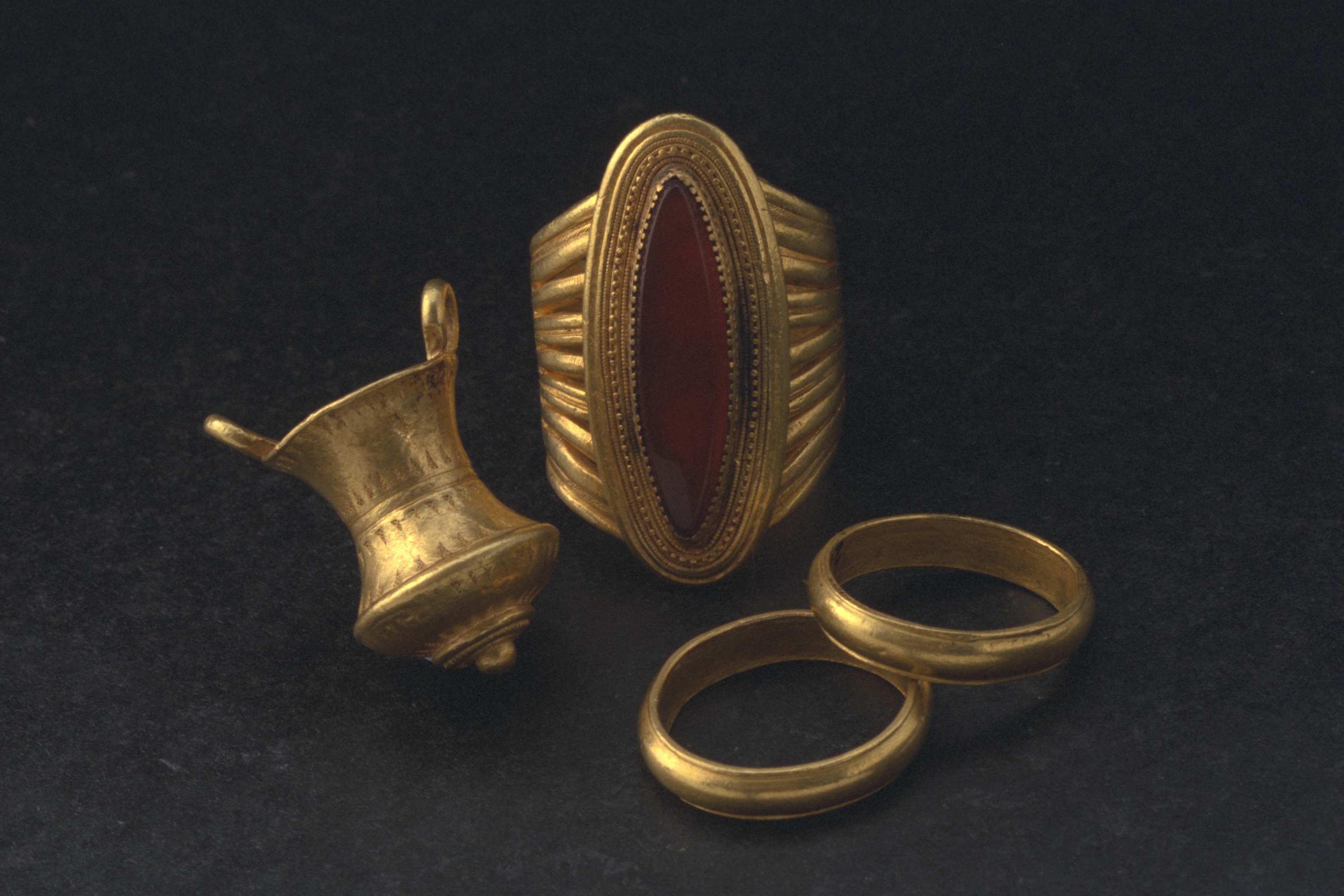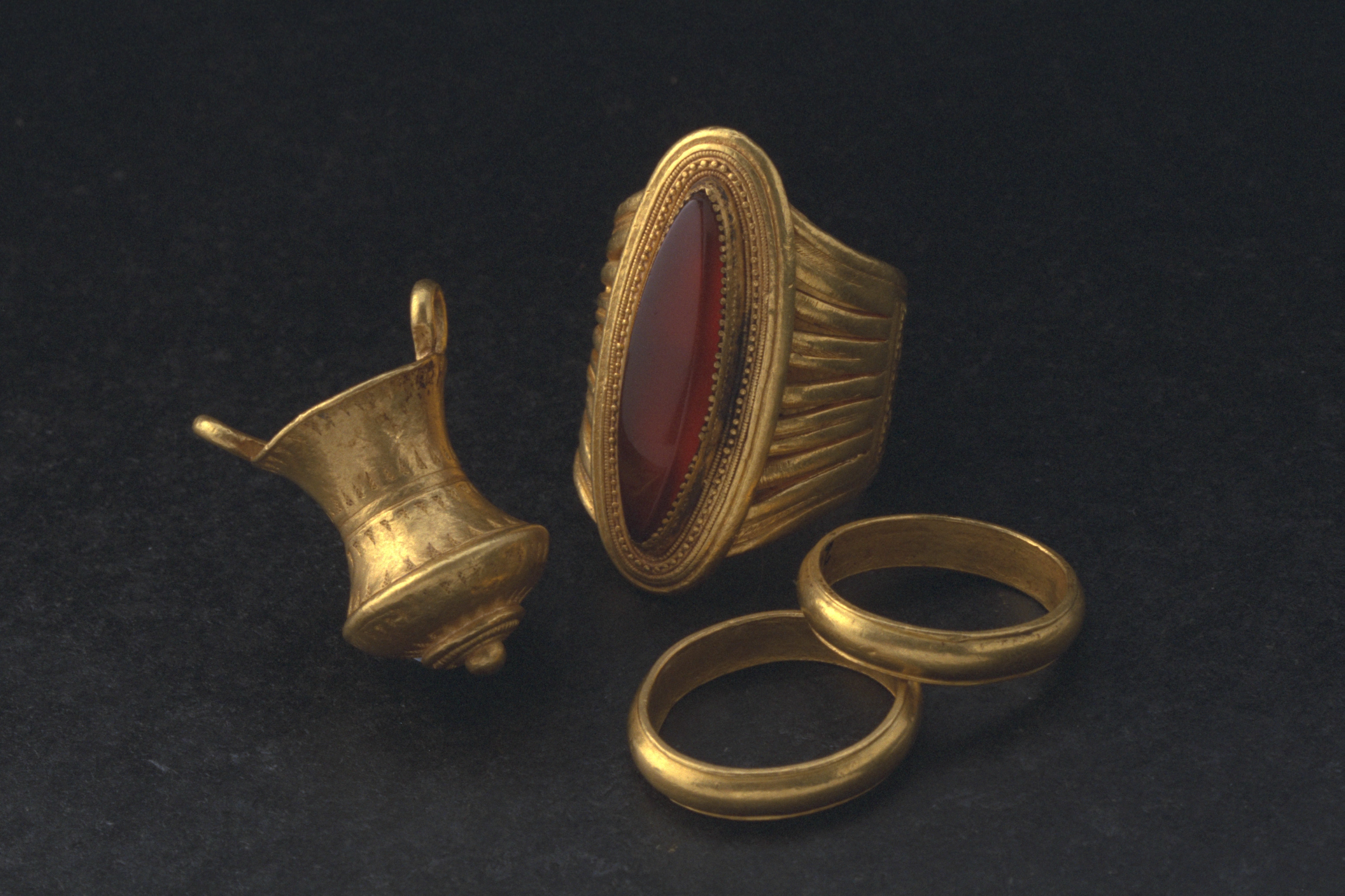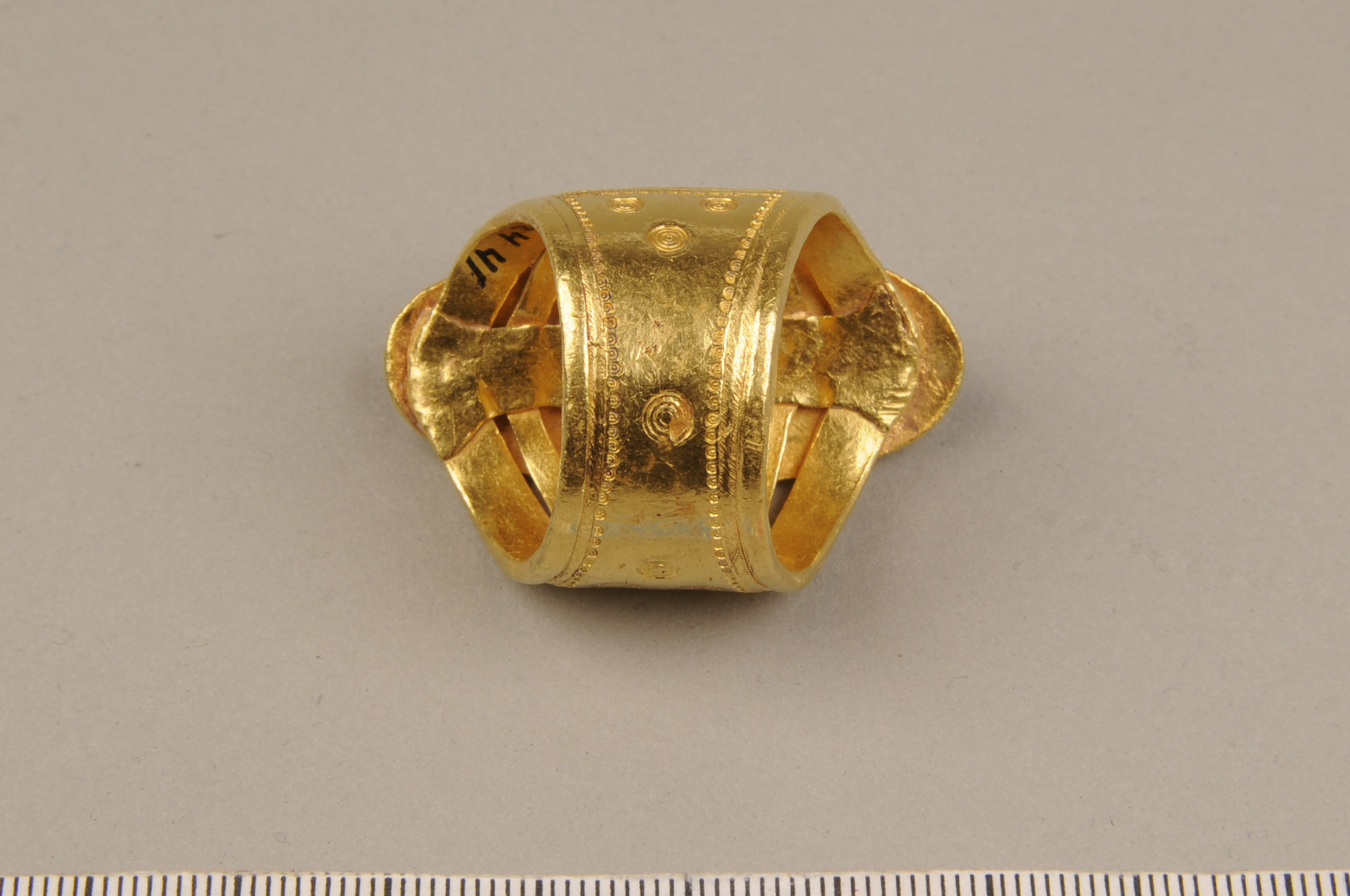 Fingerring av guld med en karneol, fattningen består av en kant, ornerad med halvcirklar, avslutad med små rundlar, nedanför kanten den ovala plattan, med en rad korn omgiven av strierade och släta trådar. Ringen mot fattningen bestående av sju tenar, varannan ornerad med en längsgående fåra, varannan slät. Med infattning