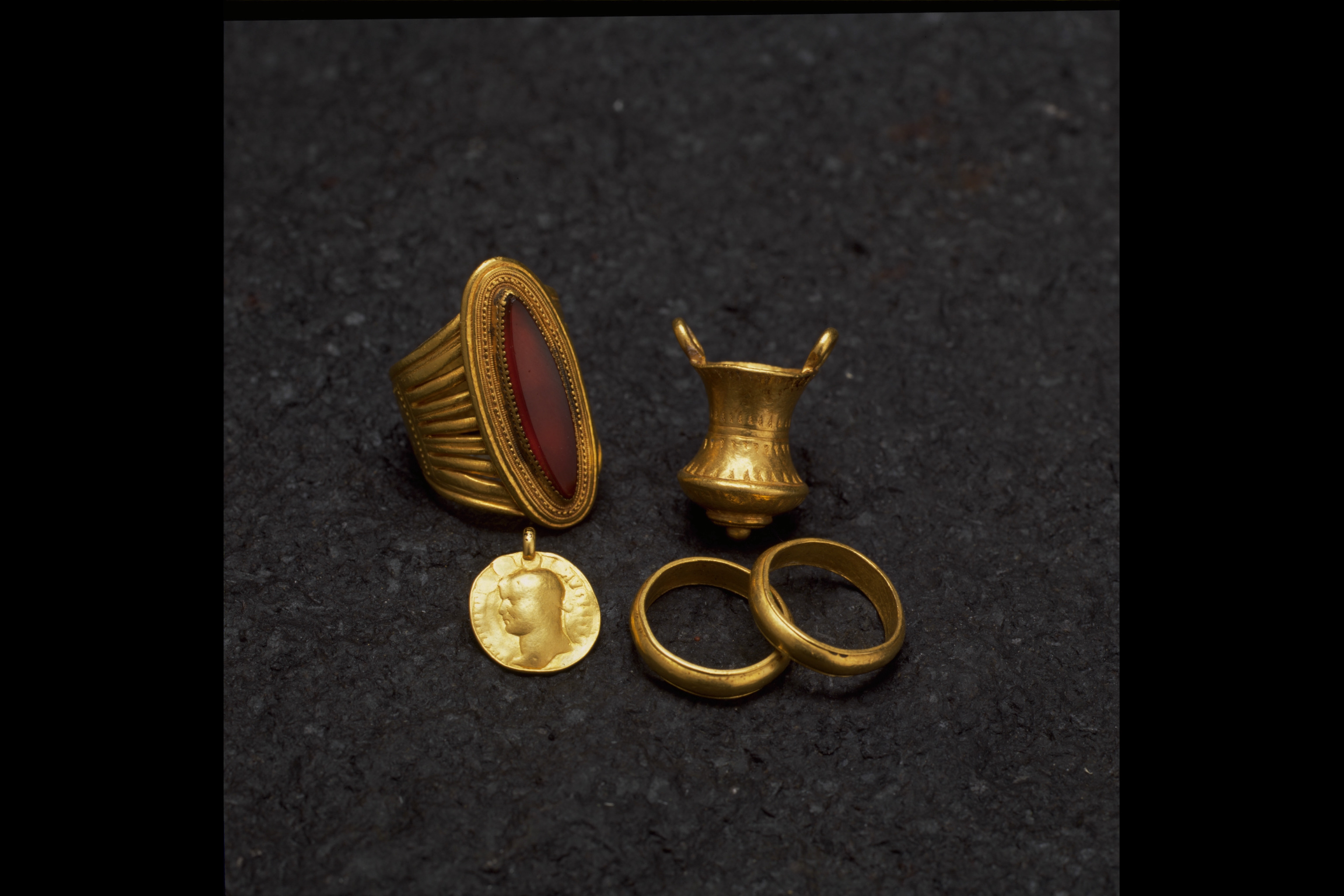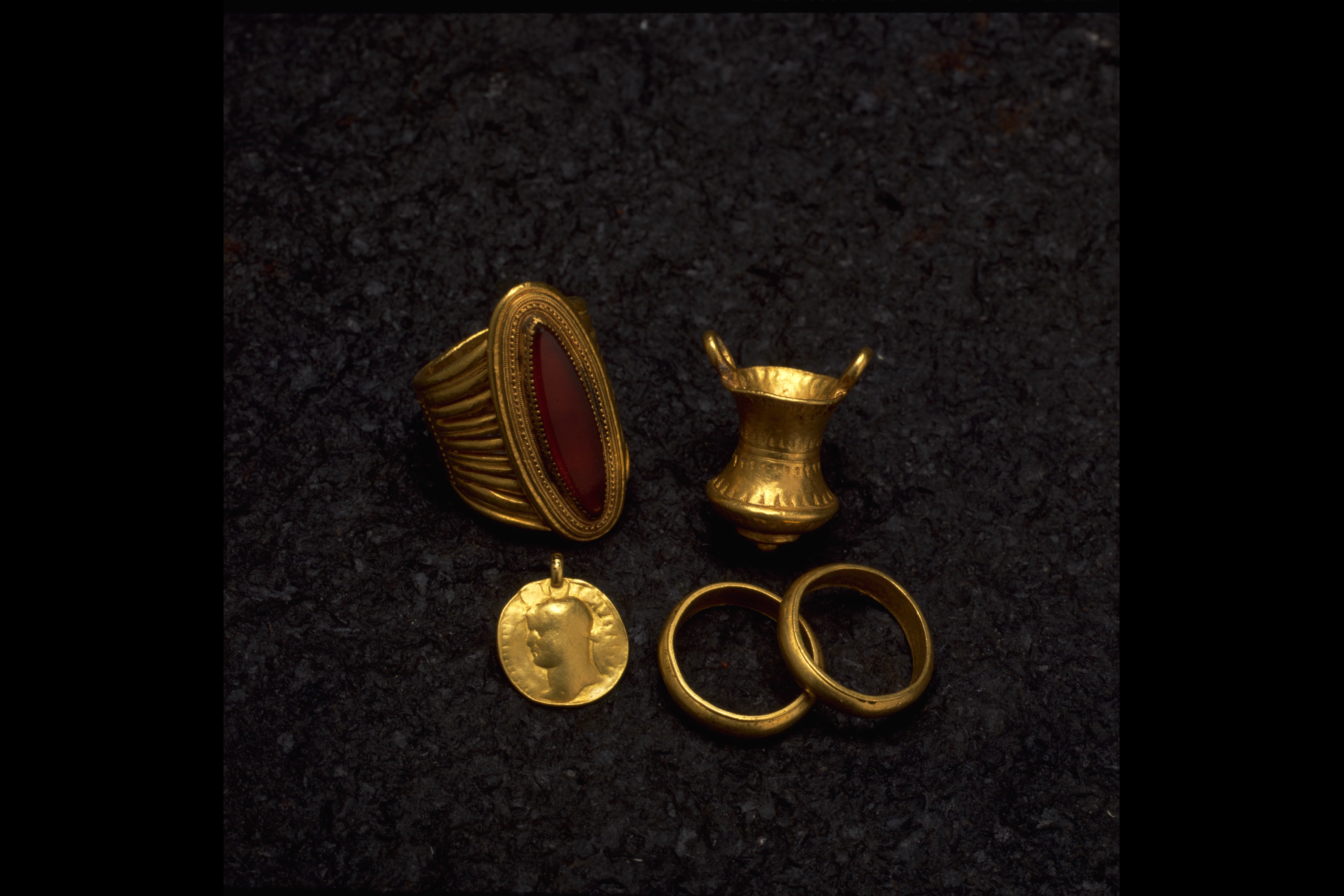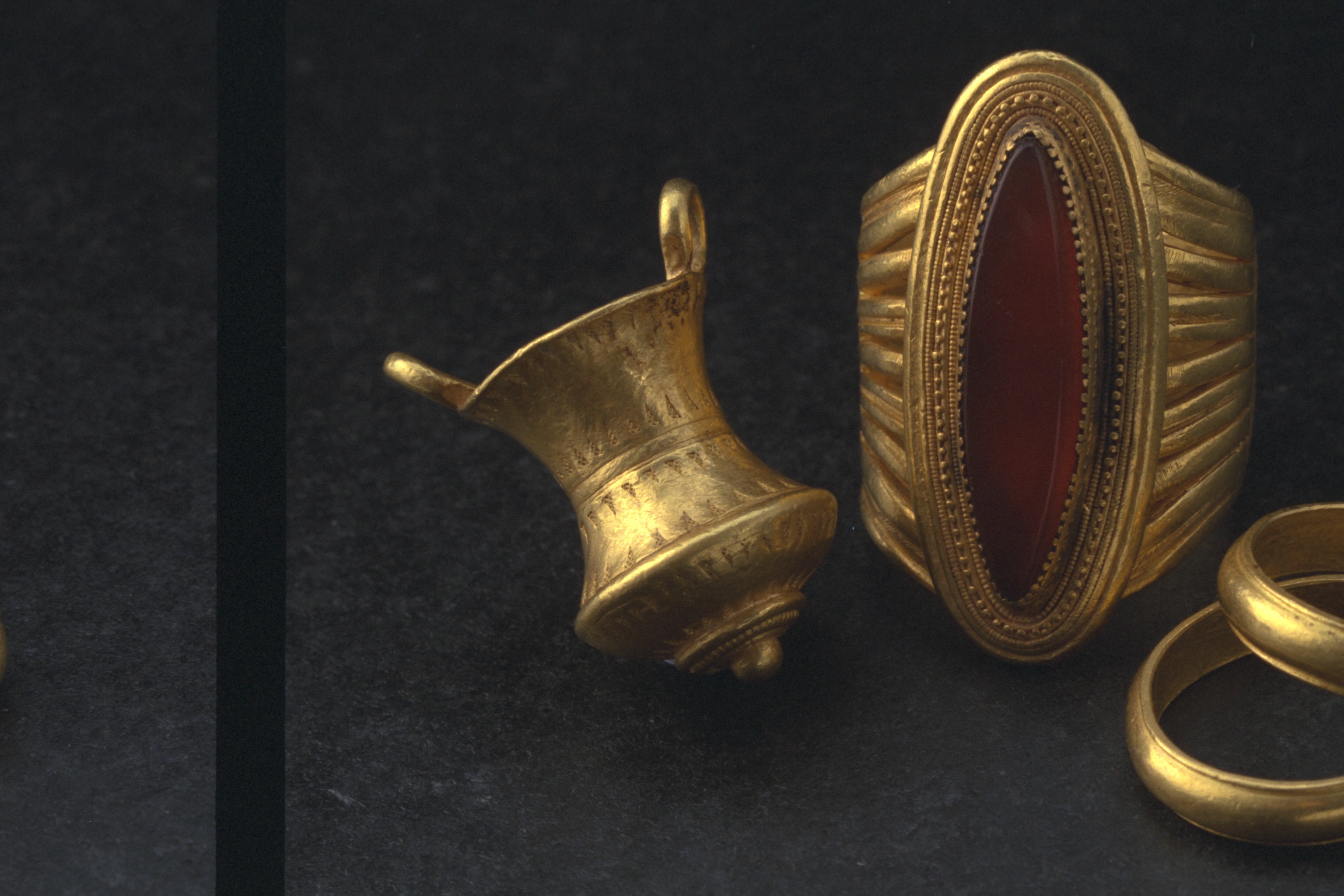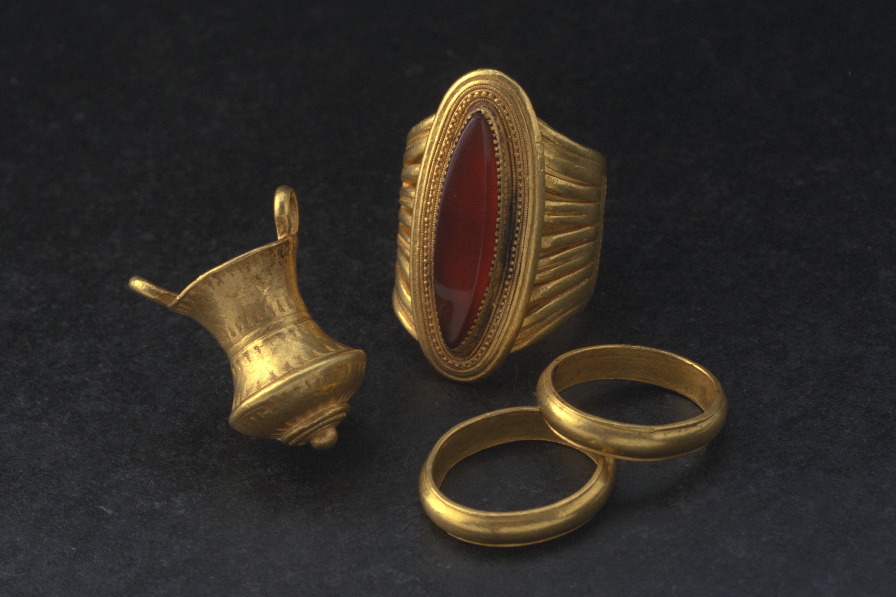 Fingerring av guld med en karneol, fattningen består av en kant, ornerad med halvcirklar, avslutad med små rundlar, nedanför kanten den ovala plattan, med en rad korn omgiven av strierade och släta trådar. Ringen mot fattningen bestående av sju tenar, varannan ornerad med en längsgående fåra, varannan slät. Med infattning