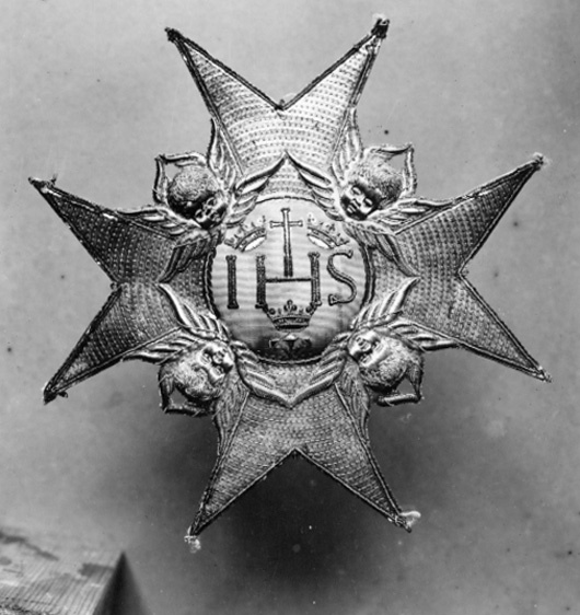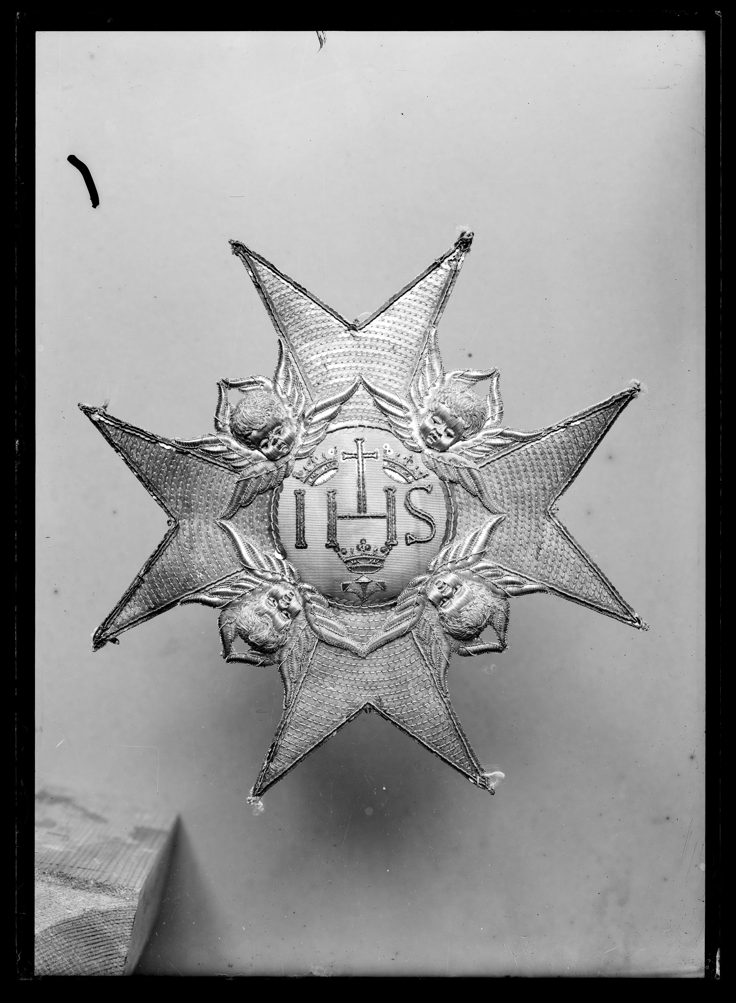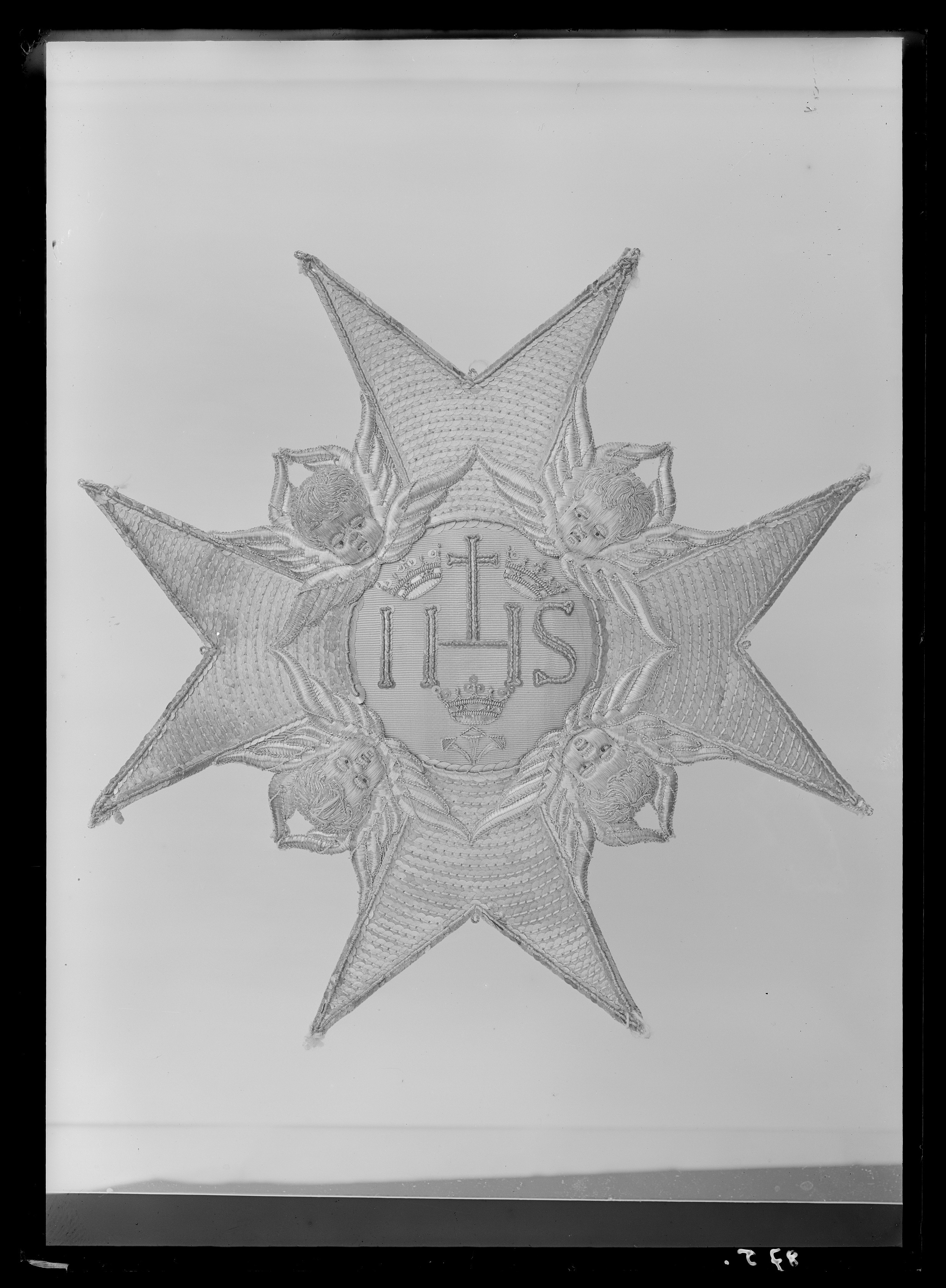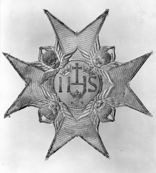 Malteserkors, broderat med silverkantiljer och -paljetter. Serafer i hög relief av silvertråd samt brunt och rött silke, vingar av silverlan. Välvd medaljong täckt med ljusblå sidenmoare, därpå broderat IHS samt kors av svartnade silverpaljetter och-kantiljer, tre spikar av silvertråd samt tre kronor och kantbård av paljetter och kantiljer av förgyllt silver. Baksidan täckt med gulnat vitt skinn, signatur skriven med bläck: "A:s:Sergell". (Anna Sibylla Sergell, 1733-1819, gm Johan Walentin Howe 1754).