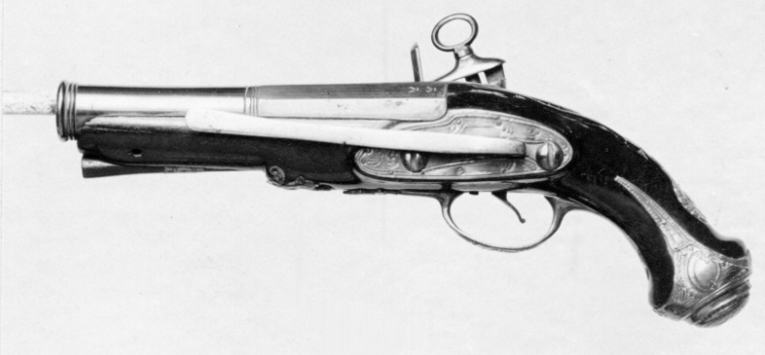Rund, slätborrad pipa av blånerat stål med förstärkt mynning, åttsidig kammare. På kammaren inläggningar av silver samt en mässingsstämpel: "TENAS" (N spegelvänt), krönt av kunglig krona. Ett häfte. Snapplås alla catalana med plant låsbleck av stål. Hane med halvspänn, lös, blånerad överkäke med ringformig käkskruv. På hanstudeln graverad dekor i form av en rocaille. Två blånerade låsskruvar, svagt böjd avtryckare. Helstock av valnöt med snidad dekor vid svansskruvbladet. Beslag av förgylld mässing. Kolvkappa med smala flikar, rokokodekor, centrumplattan förhöjd med en silverplatta med dekor i form av en krigare i relief. På kolvhalsen en silverplatta med klumpig dekor. Sidbleck av förgylld mässing. Bälthake av stål fäst med bakre låsskruven. Ett genombrutet, förgyllt mässingsbeslag vid laddstocksrännan, en rörka. Varbygel med en silverplatta på bygeln, dekor i form av mansprofil. Tillbehör: Laddstock av valnöt.