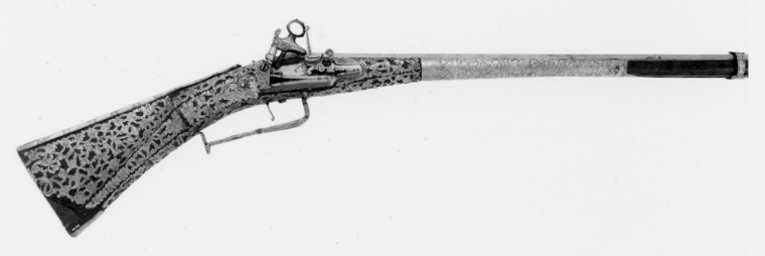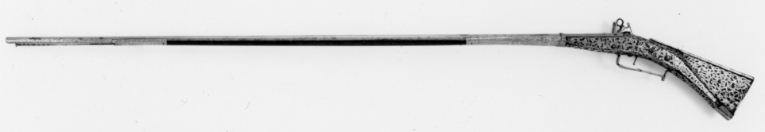 Åttsidig, slätborrad, pipa av stål, på kammaren S:t Etiennes kontrollstämpel (Stöckel nr 1424). Snapplås, av katalana-typ, med plant låsbleck av stål, baktill graverad dekor i form av voluter. Rak hane med lös överkäke med graverad dekor, ringformad käkskruv. Studel över hanfoten, med graverad volutdekor, utvändig slagfjäder, därnedanför graverat "Barbuti" (se Stöckel s.28). Batteri med graverade voluter på skärm nedanför fängpannan samt på eldstålets rygg och fot. Två låsskruvar. Helstock av trä med kolv av franskliknande typ. Kolven täckt av genombruten stålplåt med graverad bladdekor. Bakplåt av stål. På kolvryggen en stålskena med parallella räfflor. På framstockens bakre del ett brett graverat stålbleck med yttäckande rankdekor. Näsband och överrörka i ett stycke med liknande dekor. Vid kammaren ett smalt stålband med graverad dekor på den breda undersidan. Rak varbygel av stål med inlagda mässingsplattor med graverad dekor. Framför varbygeln en smal mässingsspång. Tillbehör: Laddstock av stål.