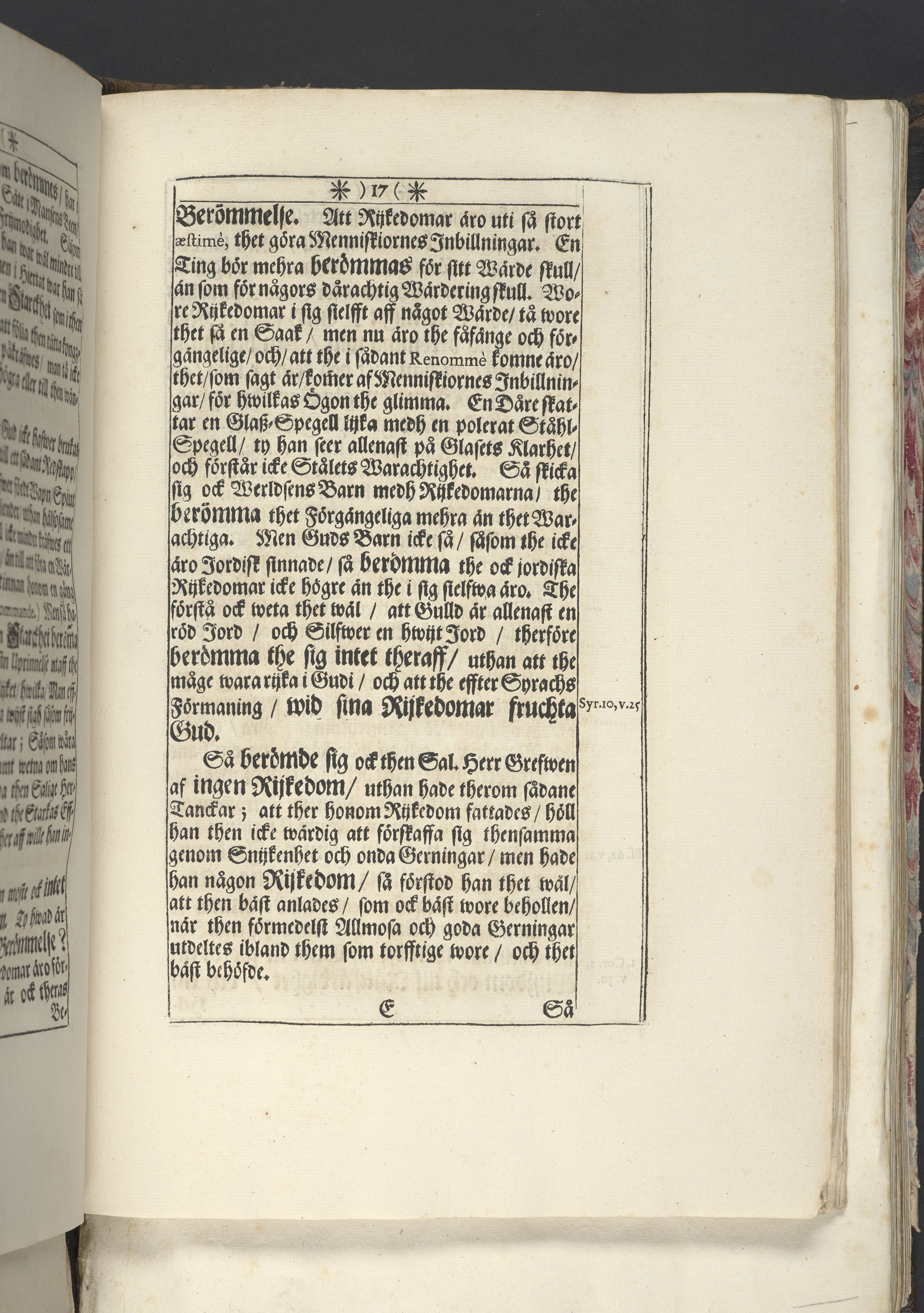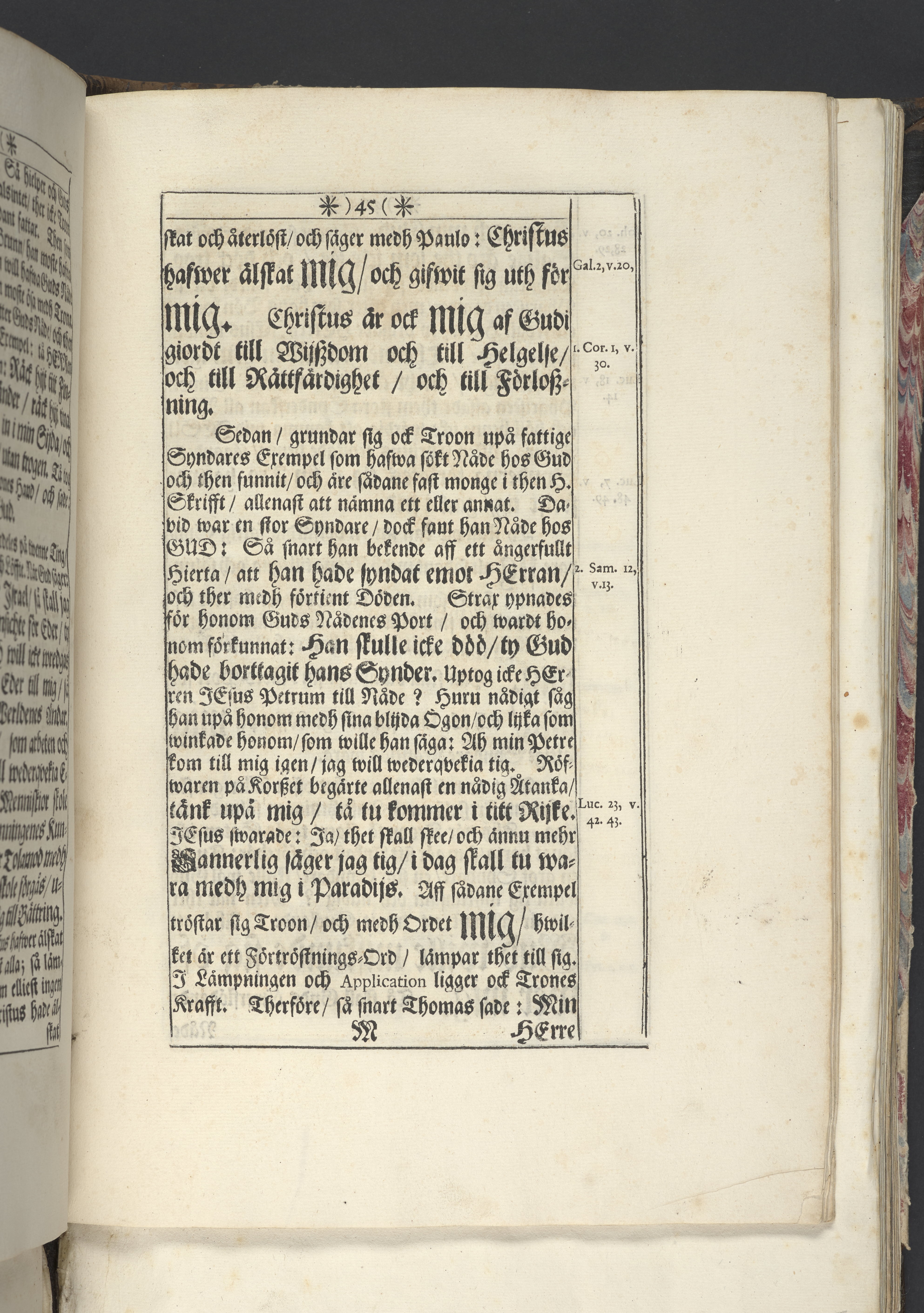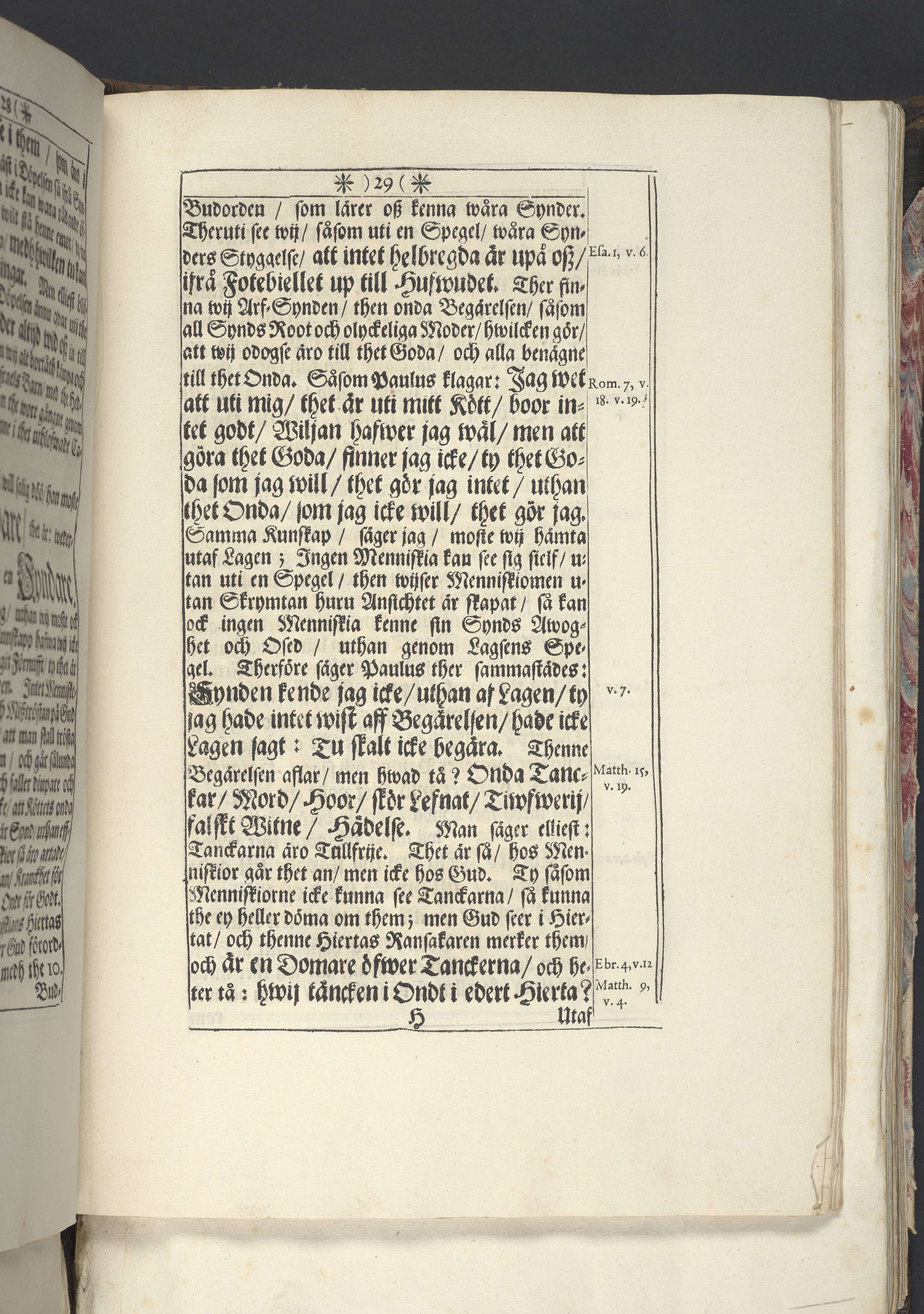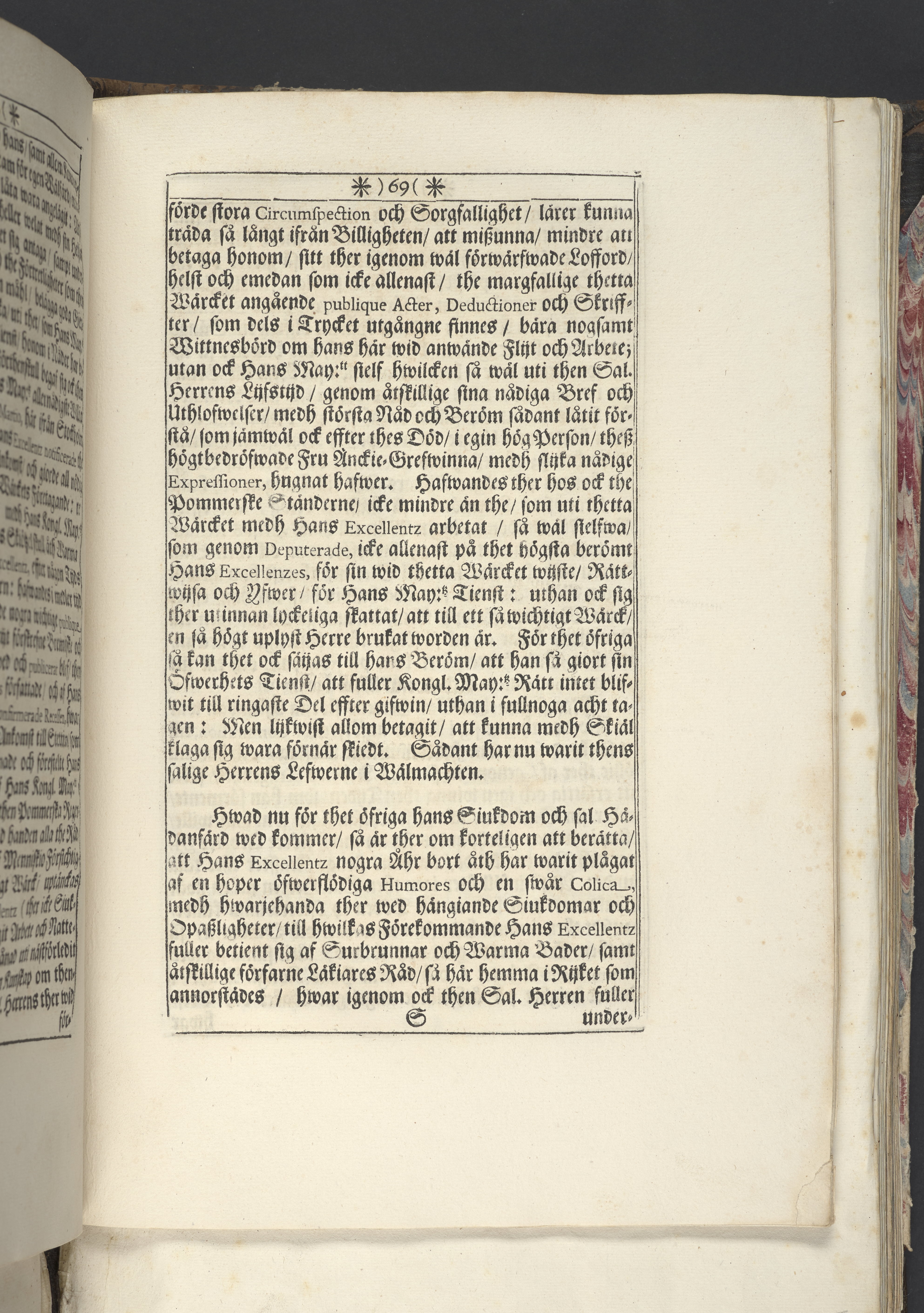Band m. pärmar av marmorerat papper, rygg och hörn av pergament. Pärmfyllnad: trä.