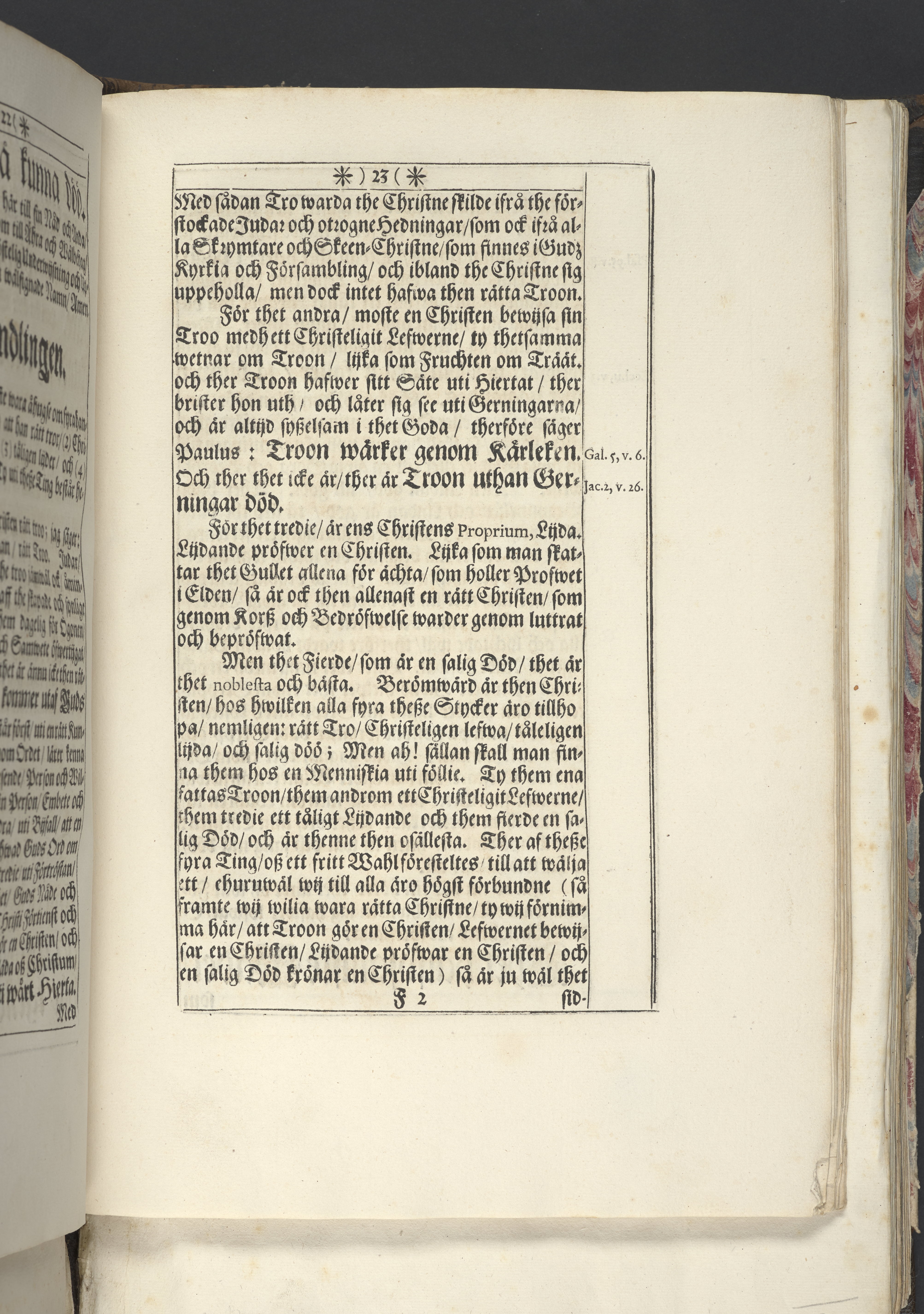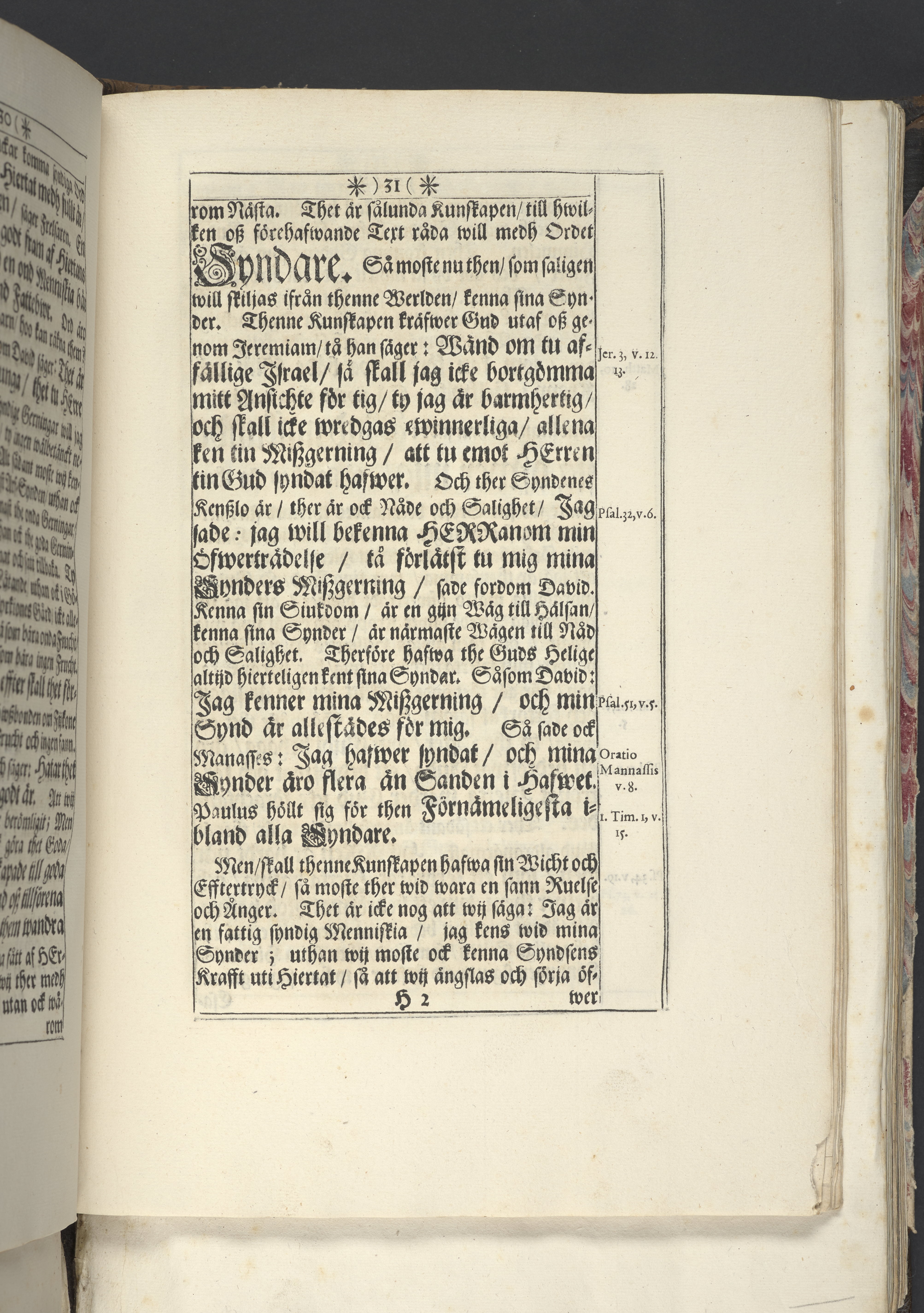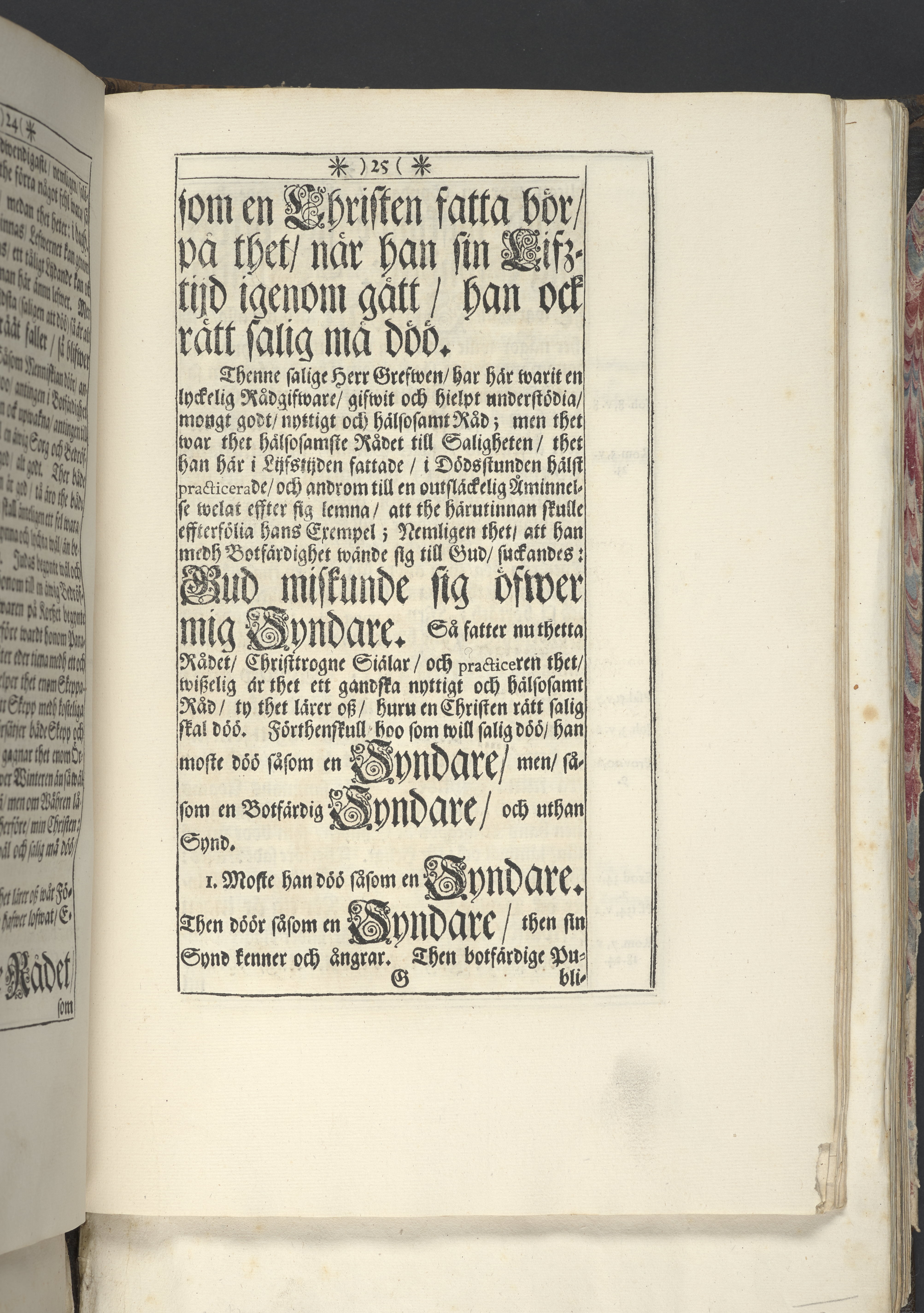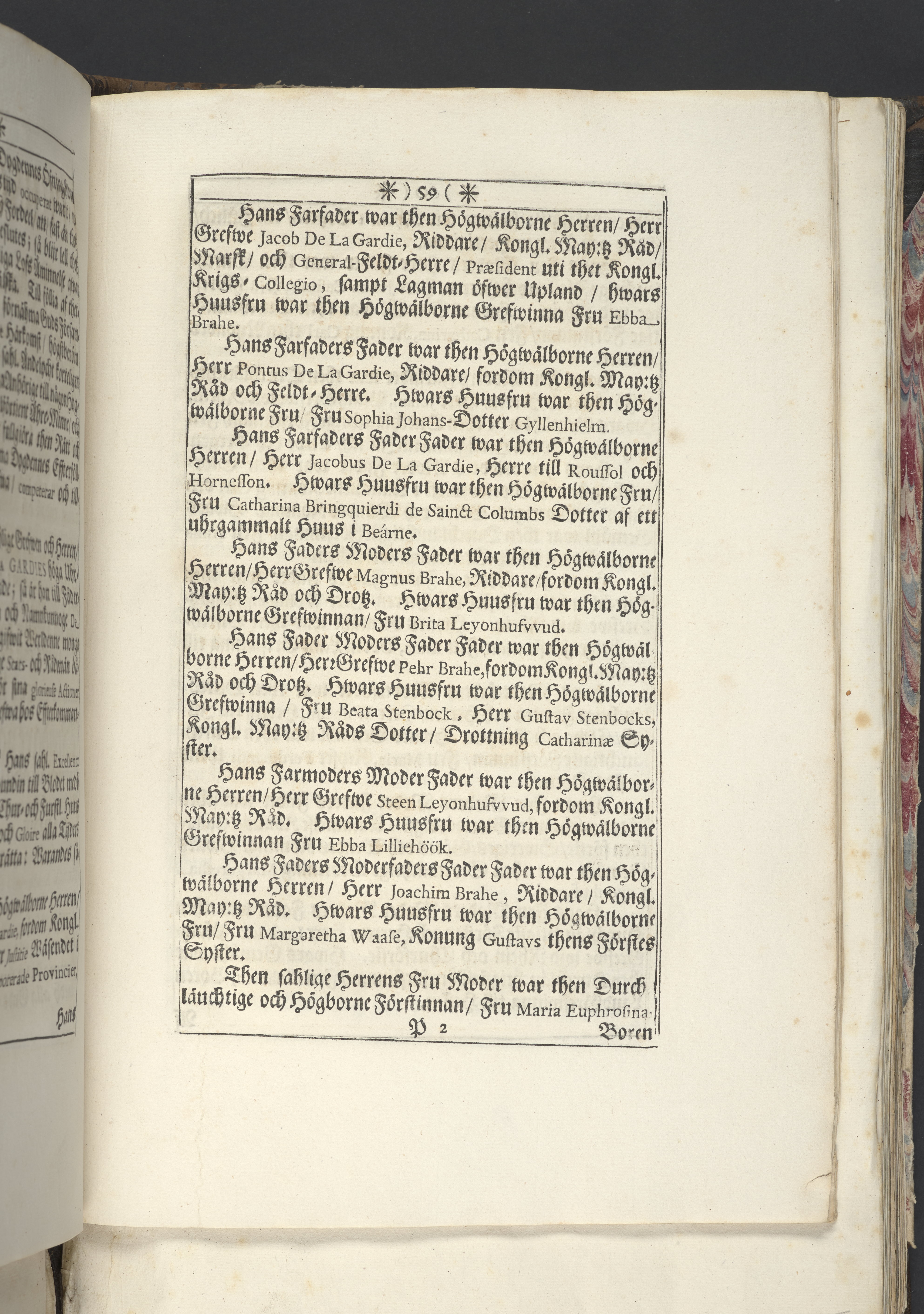 Band m. pärmar av marmorerat papper, rygg och hörn av pergament. Pärmfyllnad: trä.