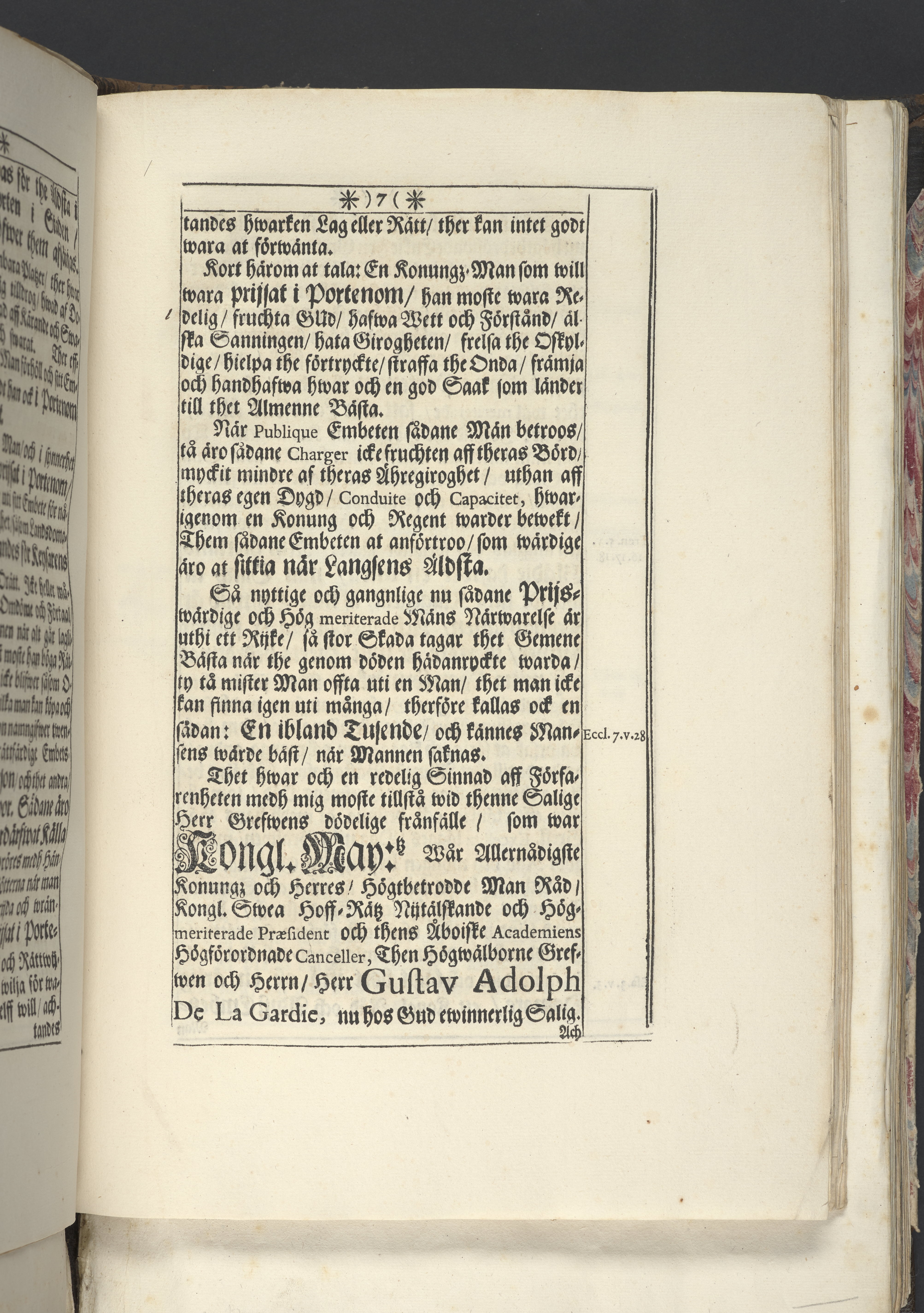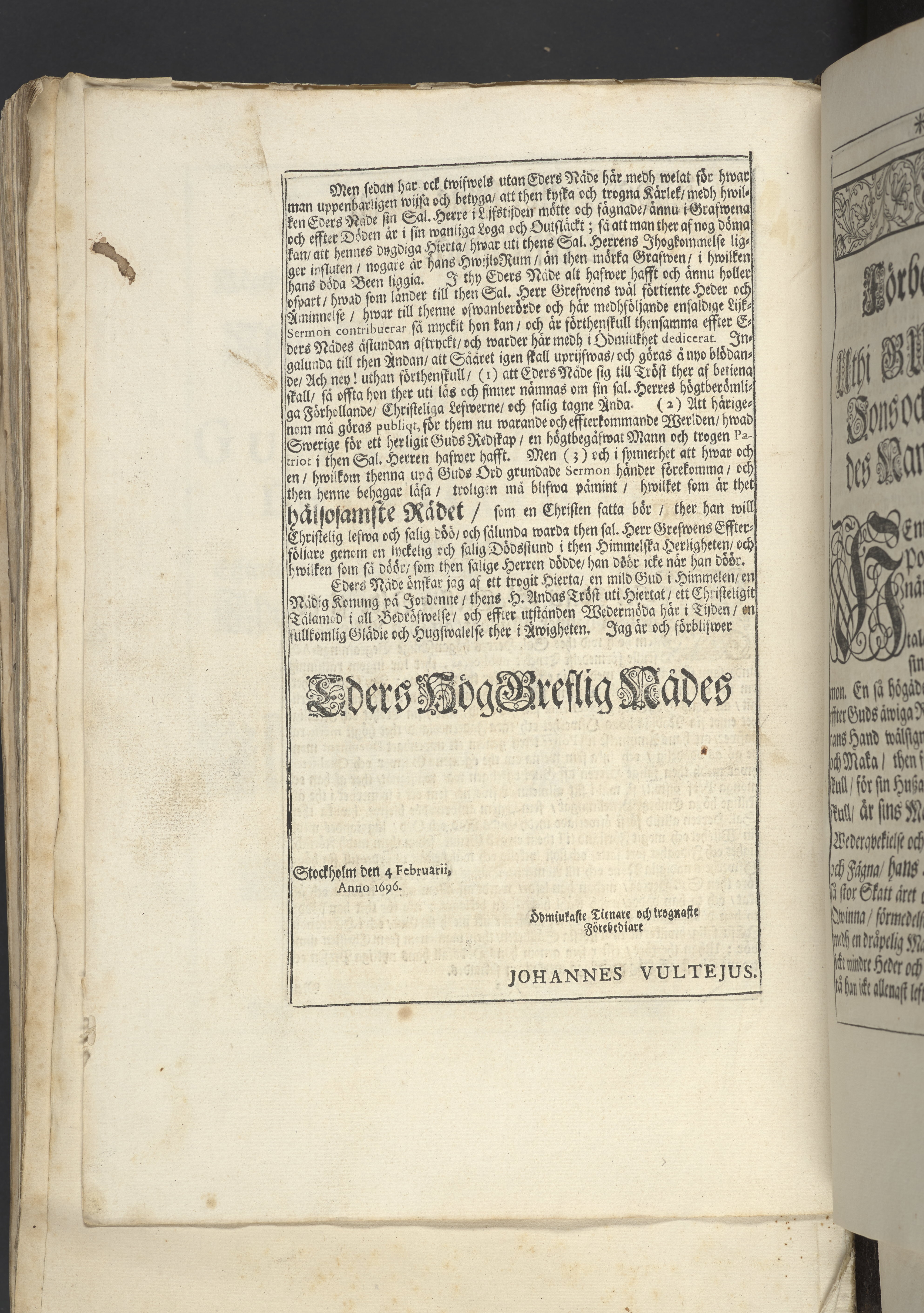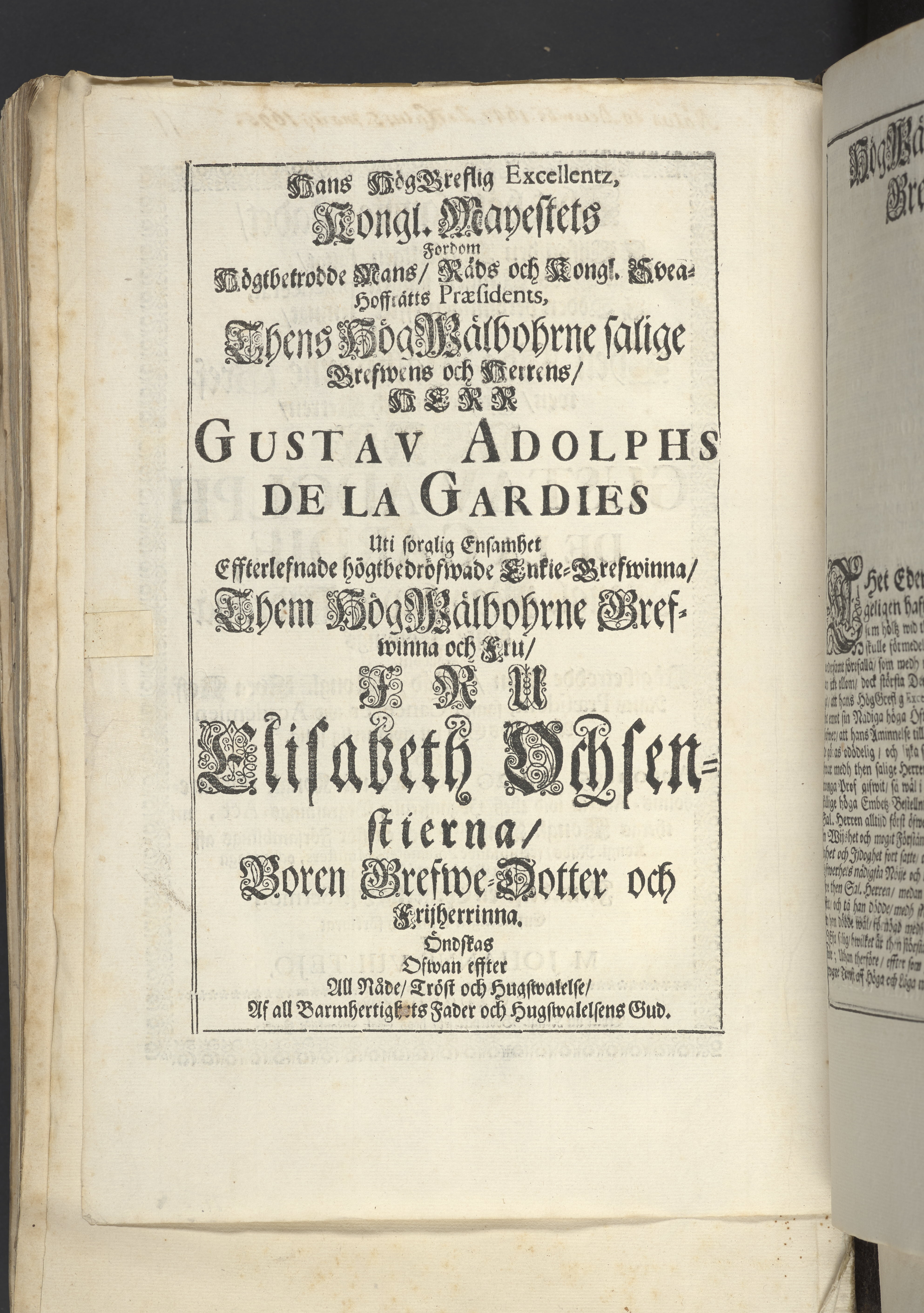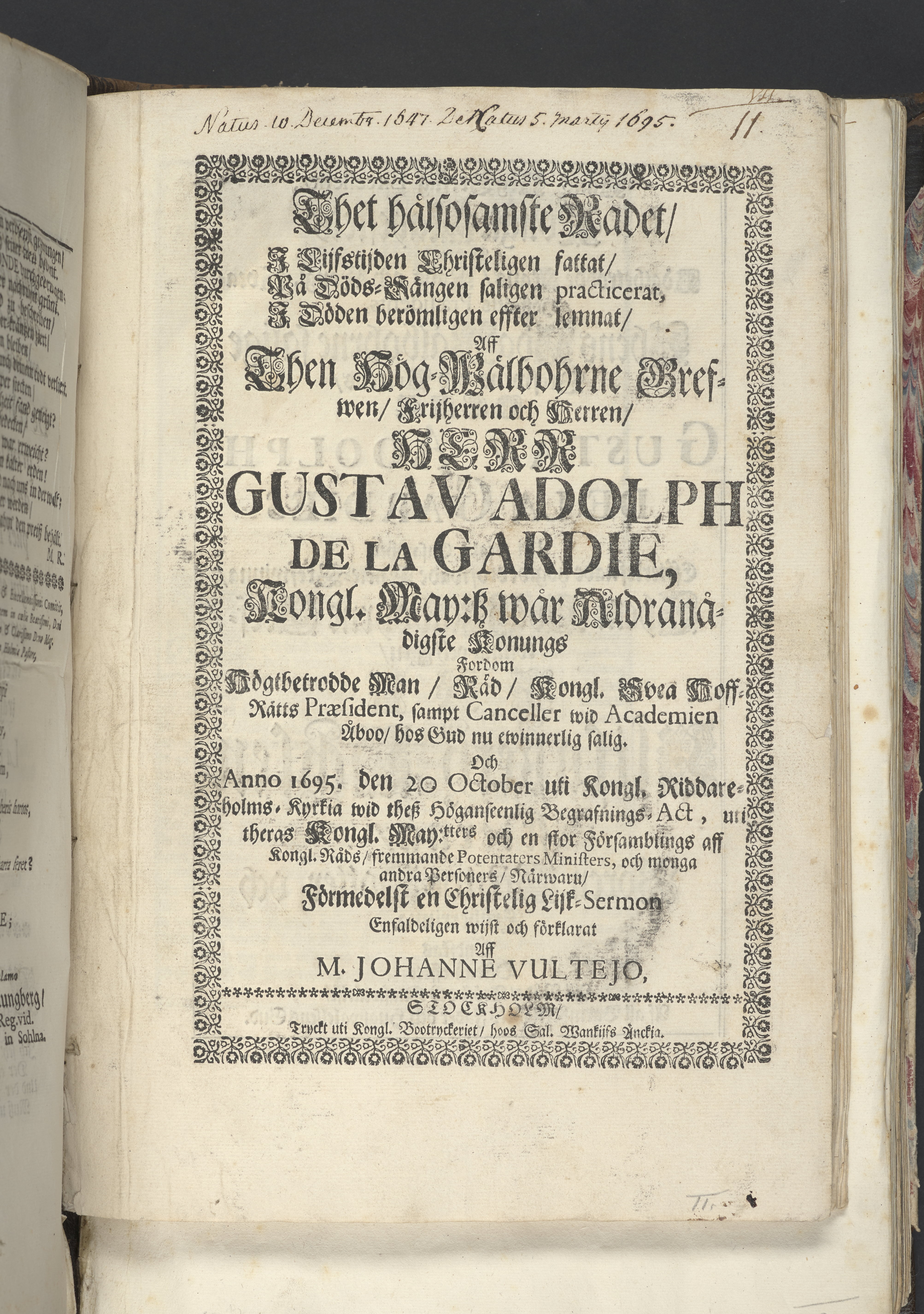 Thet hälsosamste rådet i lijfstijden christeligen fattat, på döds-sängen saligen practicerat ... aff then hög-wälbohrne grefven ... Gustav Adolph De la Gardie ... Anno 1695 den 20 october uti Kongl. Riddareholms. kyrkia... förmedelst en christelig lijk-sermon ... förklarat aff M. Johanne Vultejo, Stockholm, tryckt uti kongl. booktryckeriet, hoos sal. Wankijfs änckia.