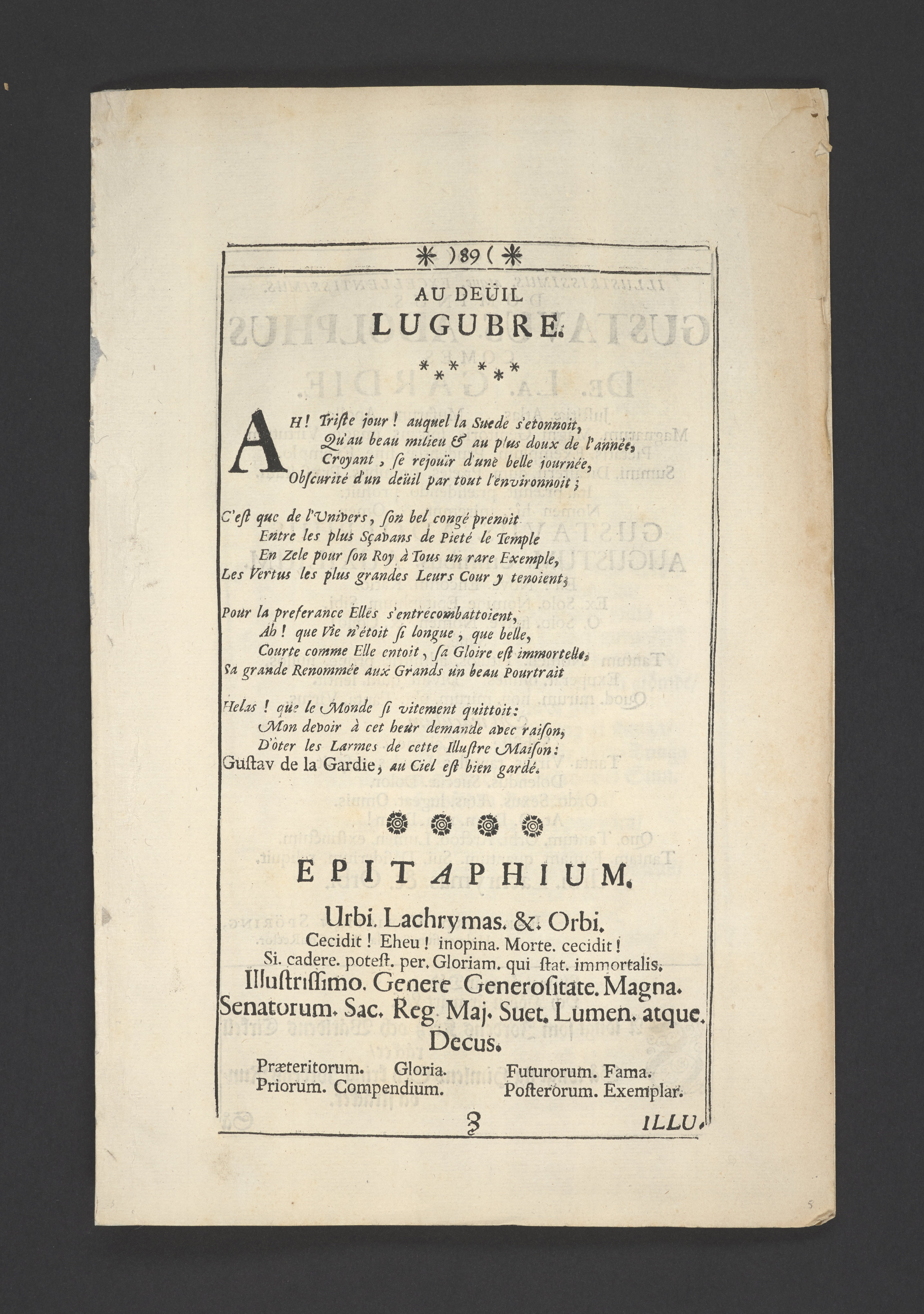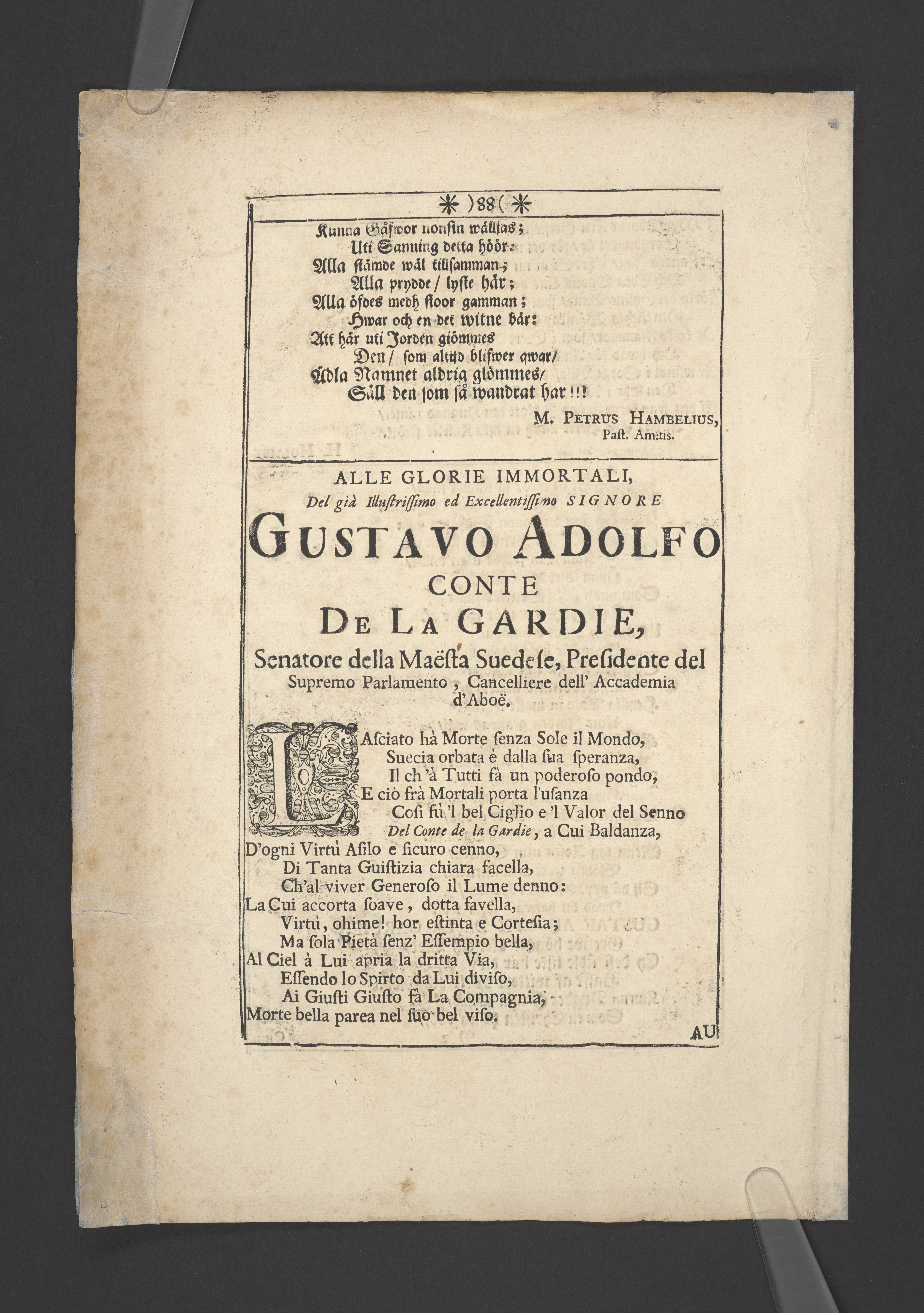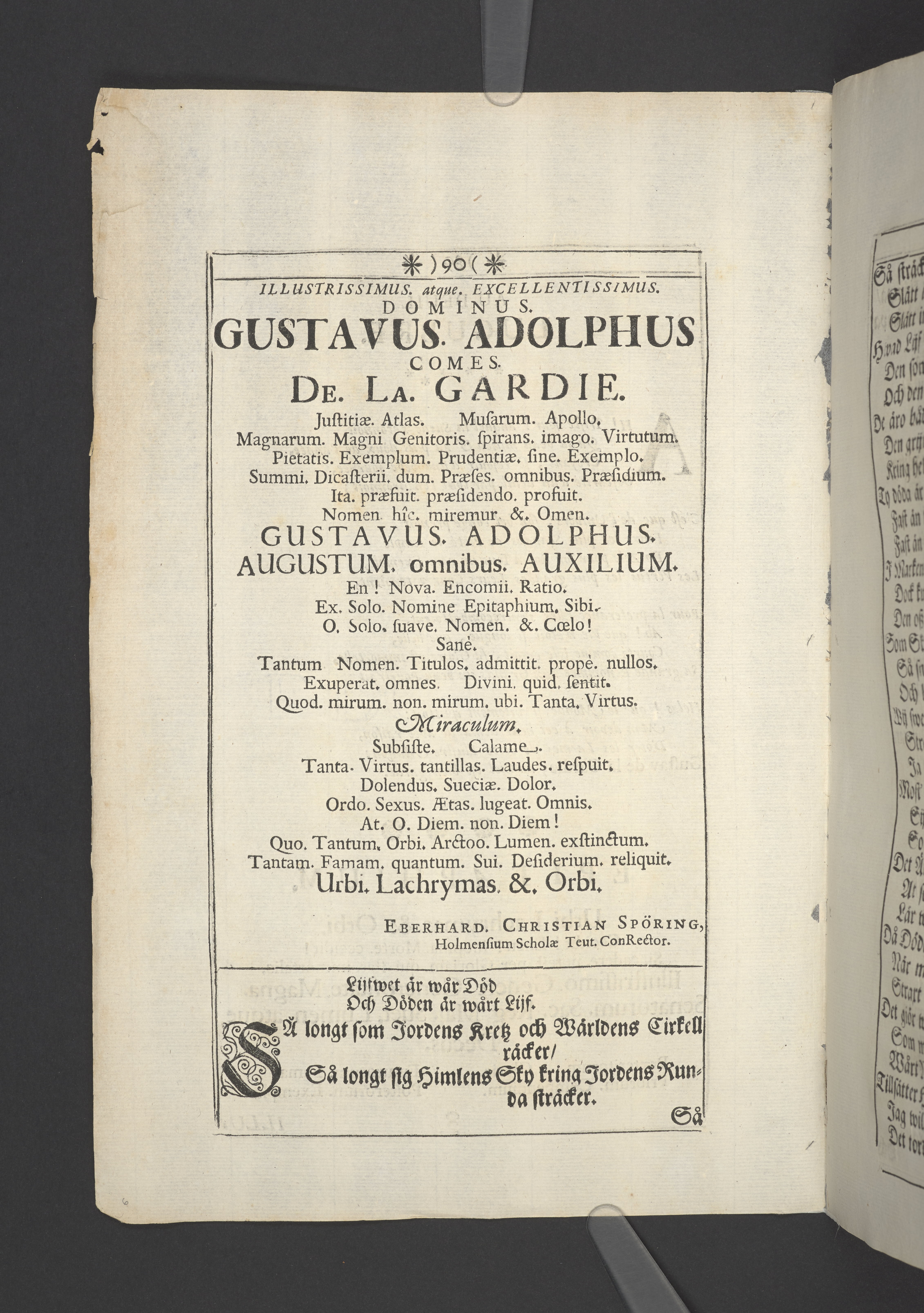 Thet hälsosamste rådet i lijfstijden christeligen fattat, på döds-sängen saligen practicerat ... aff then hög-wälbohrne grefven ... Gustav Adolph De la Gardie ... Anno 1695 den 20 october uti Kongl. Riddareholms. kyrkia... förmedelst en christelig lijk-sermon ... förklarat aff M. Johanne Vultejo, Stockholm, tryckt uti kongl. booktryckeriet, hoos sal. Wankijfs änckia.