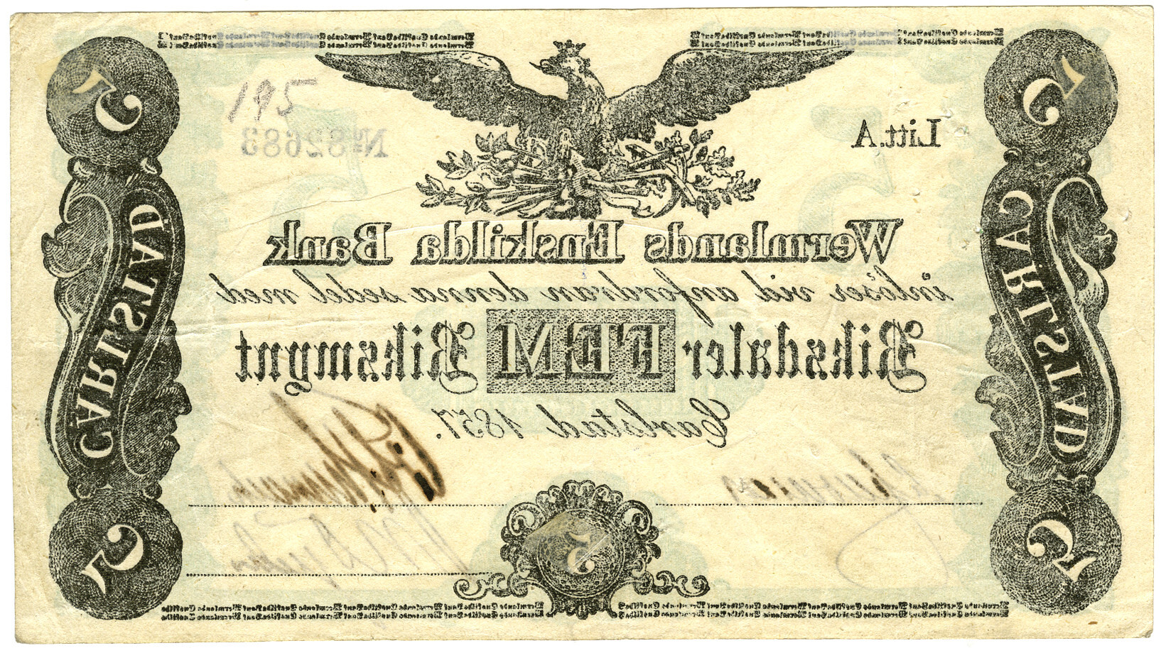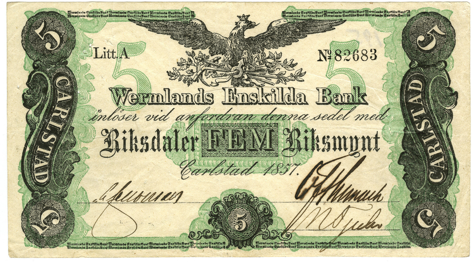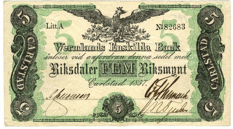 Upphov: Wermlands Enskilda Bank. Media: Statens historiska museer. Ekonomiska museet - Kungliga myntkabinettet/SHM, (PDM) Upphovsrätten till detta verk har gått ut och är därmed fritt att använda på alla sätt. Ange gärna upphovsperson om denne är känd.