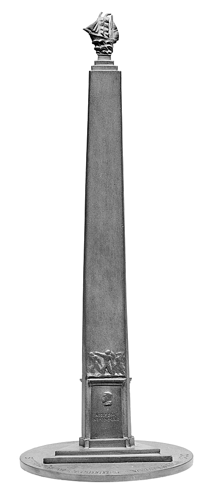 VEGA-MONUMENTET i miniatyr. I form av en hög tresidig obelisklinande pelare med platta kanter och avsmalnande upptåt samt på tresidig bas och rund tunn fotplatta. Nedtill på varje sida en minnestavla med slät sockel och profilerad kapitäl. På tavlorna i relief, på den ena bröstbild av en man i profil åt vänster, ovanför kapitälet tre män på isvandring, på den andra tavlan bröstbild av en man i profil. På den tredje tavlan bröstbilder av polarforskarna OTTO MARTIN TORELL och ALFRED GABRIEL NATHORST i profil till höger. Höjd: 33 cm. Fotplatta, diameter: 12 cm. Svenskt arbete från 1930, modellerad av skulptören IVAR JOHNSSON, f. 12 februari 1885. Gåva till WILHELMINA VON HALLWYL , f. KEMPE, juli 1930 hos Kommittén för Vega-minnets befästande.