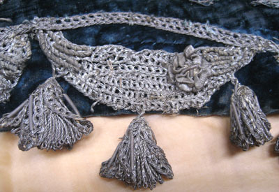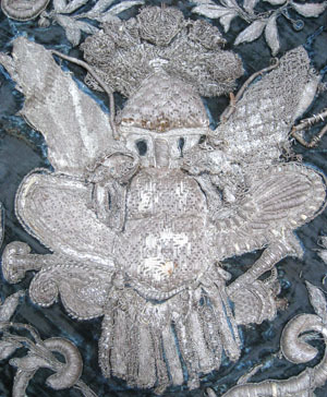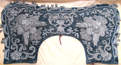 Schabrak av rektangulär form med rundade, något utdragna, bakre hörn. Utskuren halvcirkel mitt fram. Framsidan av blå sammet med dekorbroderi i applikationer i kraftig relief över hela ytan. Broderi och kantiljer av silvertråd och silverlan. Fyllning av ofärgat garn och kartong med stadgande ståltråd. Motiv i form av trofégrupper i hörnen med romerska rustningar, plymer, fanor och trumpeter. Omgivande växt- och blomsterslingor. Kantad längs sidorna och bak av en festongliknande bård av knuten eller stickad silvertråd, med krepiner och nedhängande tofsar som dekor. Bårdbredd: 45 mm, tofslängd: 30 mm. Foder av blå linnelärft i flera stycken. Ett rött silkessnöre trätt i två runda, tränsade hål mitt fram, 10 mm från framkanten. Ett par runda, tränsade hål i varje hörn längs framkanten.