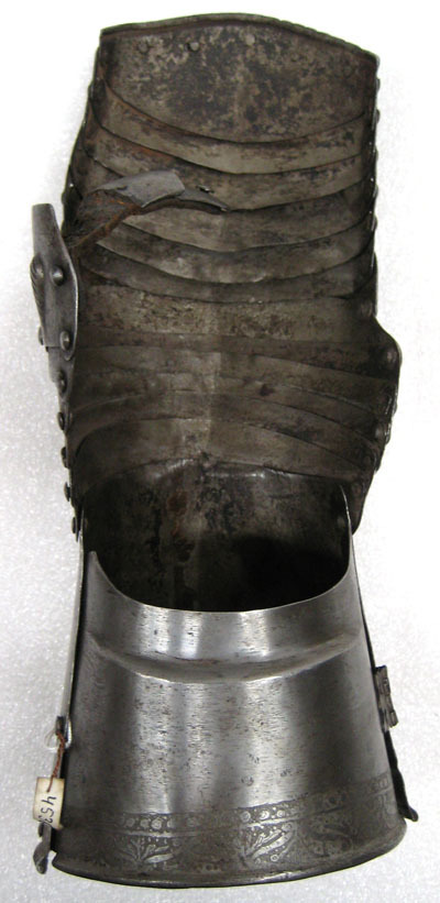 Denna rustningsdel utgör en del av en rustning som inkom till Livrustkammaren genom Karl XV:s testamente. Den hade tidigare varit överintendenten Fritz von Dardels ägo. Till denna rustning, som tillverkats i Nordtyskland under 1500-talet mitt, tillverkades under 1800-talet kompletterande delar. Dessa avlägsnades år 1894 men finns fortfarande kvar i Livrustkammarens samlingar.