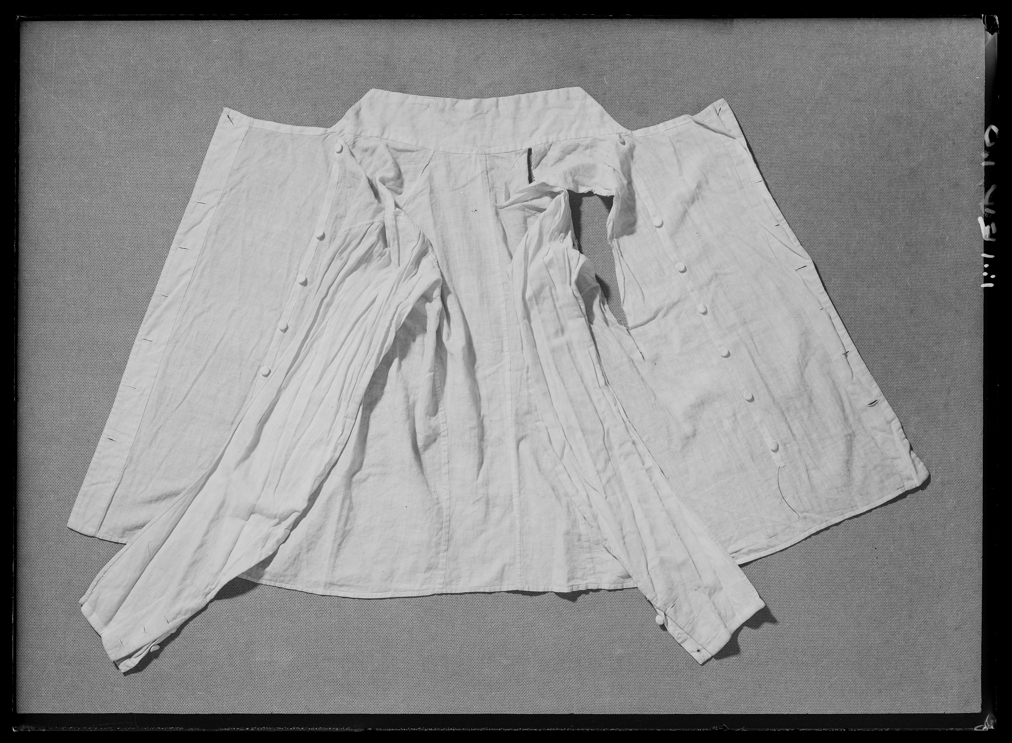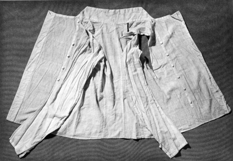 En skjorta i vit linnelärft. Lätt utställd modell. Ståndkrage med en klädd knapp vid halsen. Sydda veck/krås fram på bröstet och bak på samma ställe. Slitsad i sidorna. Små manchetter som knäpps med någon form av manchetterknappar.