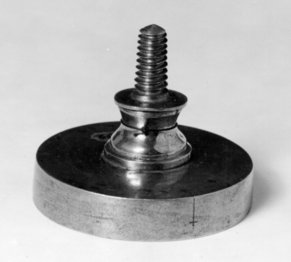 Cylinderformig platta av stål, däri graverat vapen, skrafferade färgangivelser. Sköld av fransktyp, kluven, tre kronor och folkungavapnet, på sänkt spets Södermanlands grip. Hjärtsköld kröntav kunglig krona: Holstein-Gottorp. Huvudskölden krönt avhertigkrona. Runt sköldenNordstjärne-, Svärds- och Serafimerordens kedjor med tecken. Vapentält, därbakom två korslagda ankare. Slät, dubbel kantring, den yttre bredare. Ankarna och serafimerkorset går delvis utöver ringarna. Upptill ett spegelvänt valspråk: "COMITER AC FIRME". På randen graverat: "Friedrich Sigism: Novisadi, Graverat // i Carlscrona". På ovansidan svarvad nedre del till skaft, avslutad med gängad tapp för fästning av träskaft.