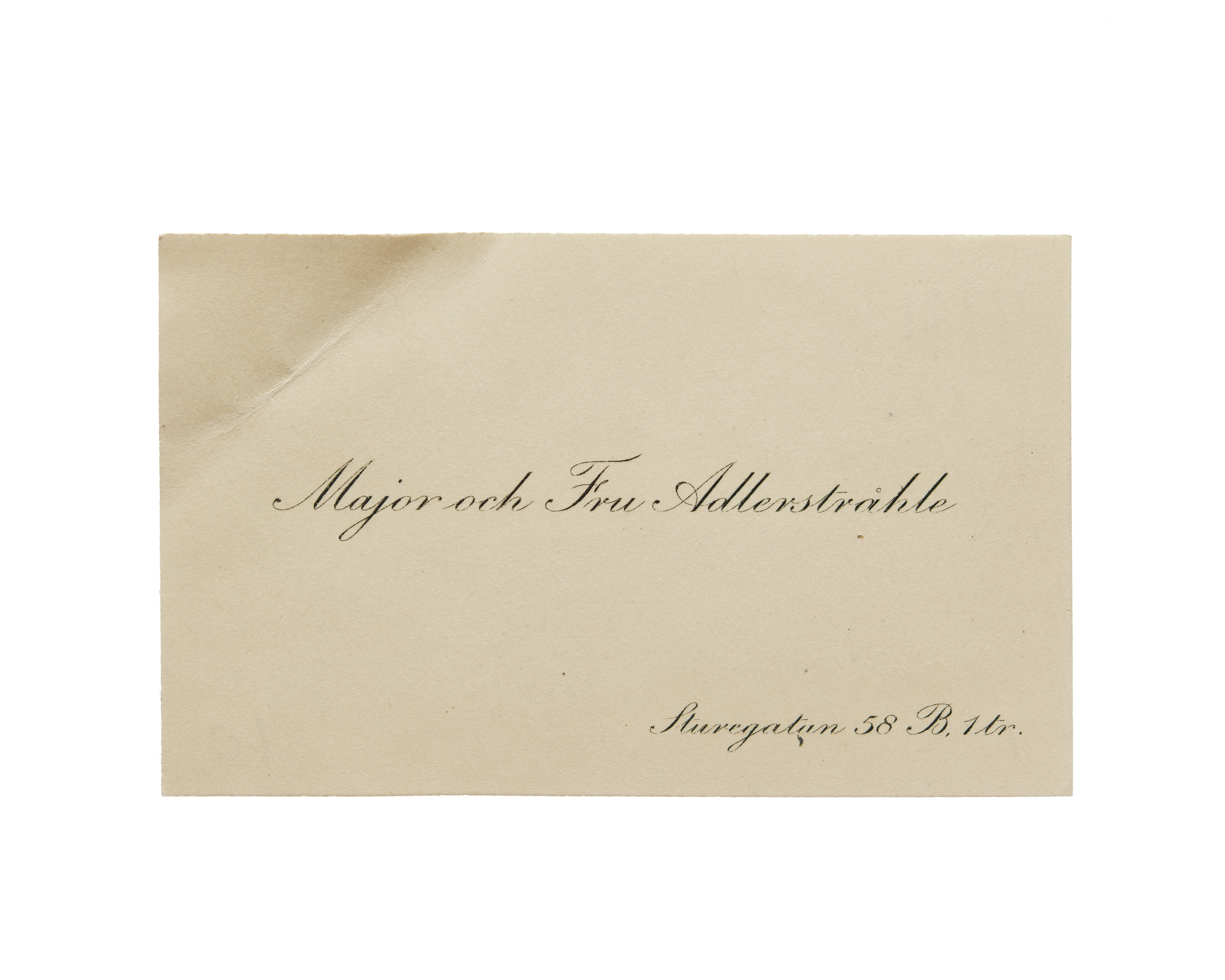 Ett visitkort från Major Einar Adlerstråhle och Fru Märta, född Oelreich, daterat 1921, vikt i övre vänstra hörnet. Adress (nedre högra hörnet) Sturegatan 58 B. 1 tr.