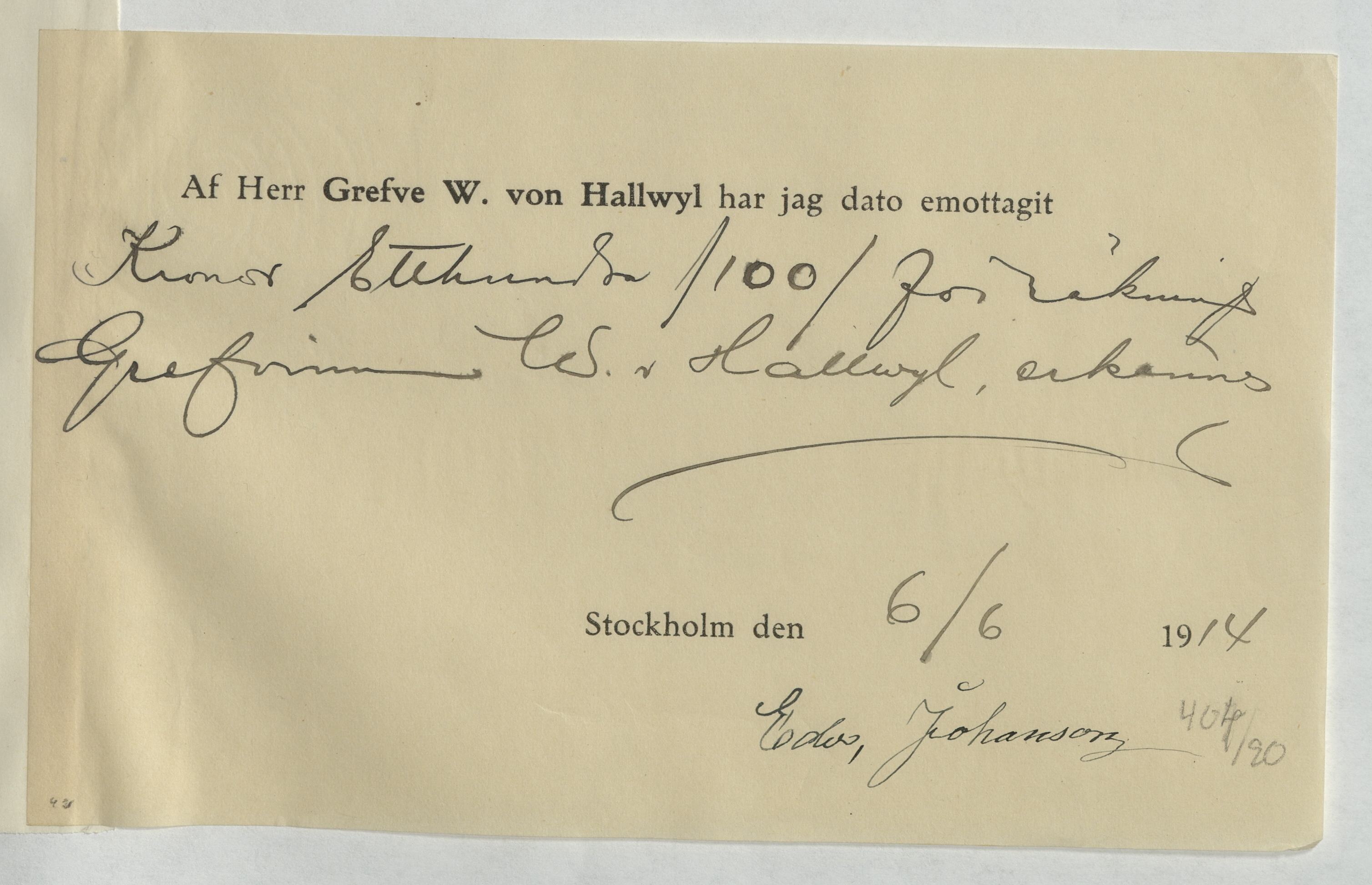 Kvitto från Edv. Johanson, Snickare. Gällande betalning för utfört arbete.