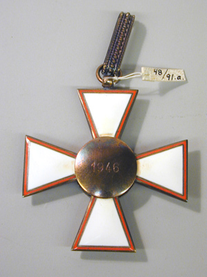 Georgskors av förgyllt silver(?), armarna vitemaljerade med röda kanter. Medaljong av karminröd emalj, belagd med sköld i Ungerns färger (2 ggr delad rött-vitt-grönt), runtom grönemaljerad lagerkrans. Medaljongens baksida svagt välvd, präglat årtal: 1946. På övre korsarmen genomborrad kula, däri fäst ring med tillplattad bandring, b: 6 mm, dekorerad med kulbårder.