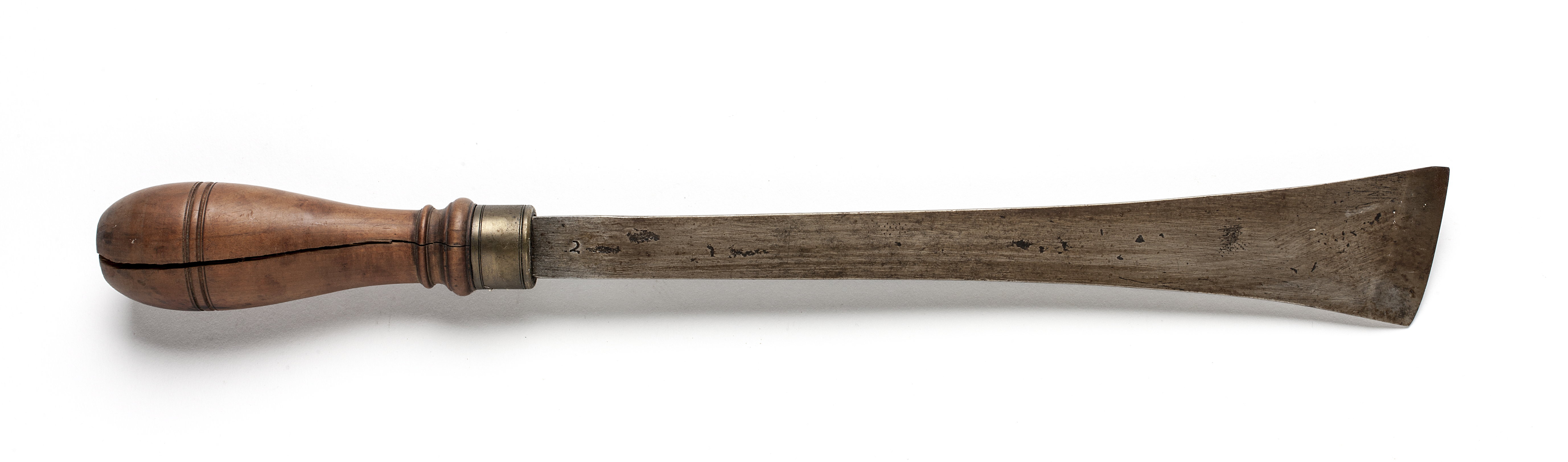 Klinga med rektangulär genomskärning. Stämplat på klingan: "2" med stans nr 5375. Sned egg. Svarvat skaft av päronträ, med två vulster nedtill ("skoklostertyp"). Mässingsring.