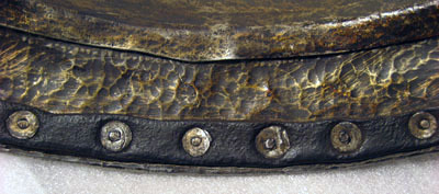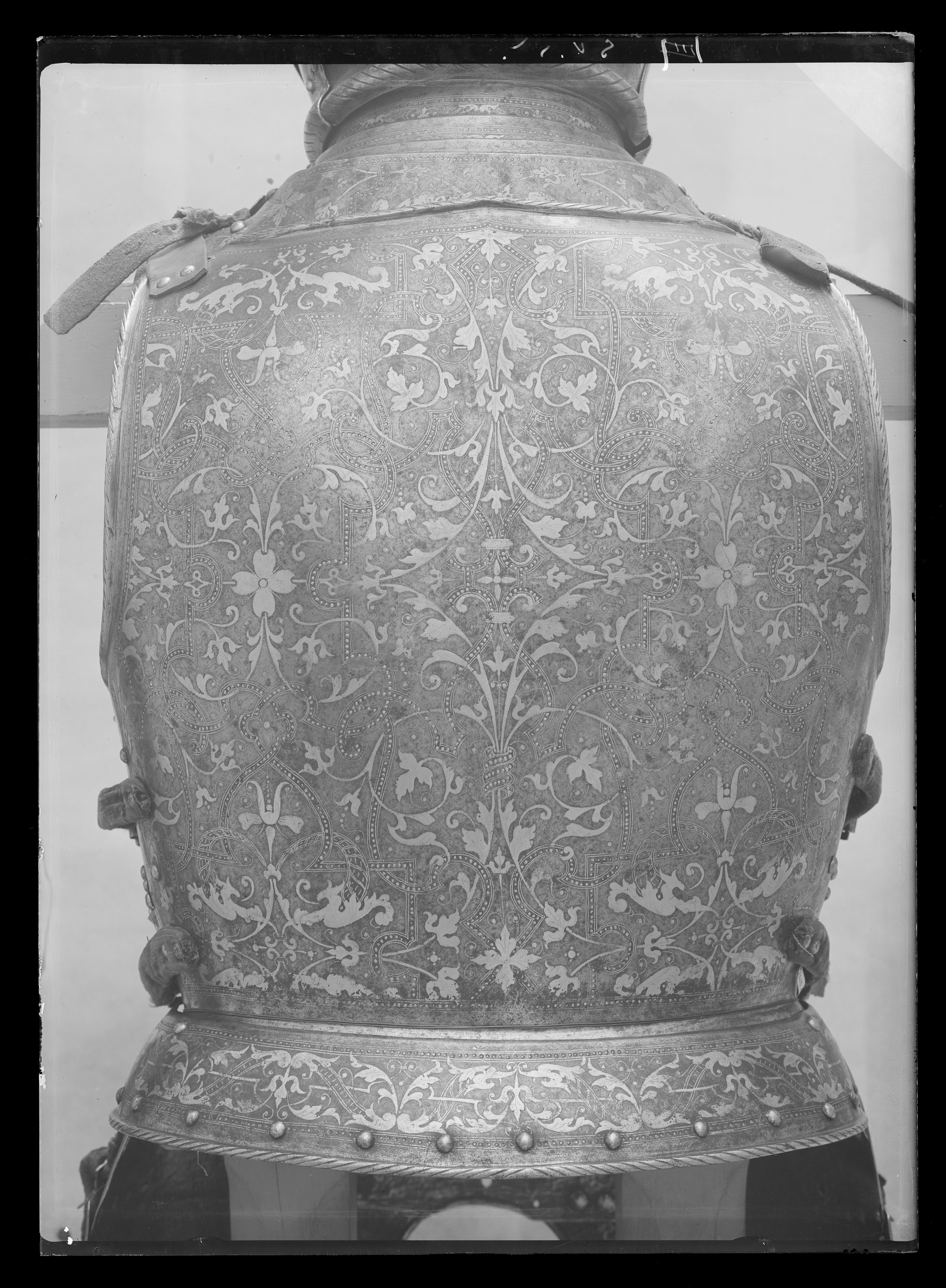 Driven stålplåt med på utsidan förgylld dekor mot mörk bakgrund. Insidan brunaktig med tydliga hammarslag. Sammanlagt två delar, harnesk och ländskena. Vid nacken lätt runda kant med i mitten svag spets, h 15 mm. Drivna förhöjningar över skulderbladen och mellan dem mjukt rundad försänkning. Rundade urtagningar för armarna. Harneskets sidor lutande inåt och framtill utdragna med en nitad och smidd förlängning, 45 mm bred över mitten. Nedre kanten driven till en krage, b ca 16 mm, riktad utåt 45 grader. Nertill vid kragen och formad efter denna en skena, b 57 mm, nitad i små utskott på övre kanten. Längs nedre kanten nitar i rad. Nackens, armhålornas och kragens kanter omvikta, rundsmidda och repstavsfilade. I var sida under armen två sämskade läderremmar klädda med röd sammet, l 170 mm. Vid axlarna ett läderband med spänne, l 69 mm, av konturerad stålplåt med i mitten nyckelhålsformat hål och i änden nitad sammetsklädd läderbit. På skenans insida ett kantband av svart läder. Dekor: Hela ytan blånerad. Mot fint skrafferad yta ett slingrande rankmönster av påslaget guldbleck och prickpunsade kantlinjer. Dessutom ett oregelbundet mönster av 5 mm breda band längs kanterna och genom rankorna. Banden består av i mitten försänkta punkter fyllda med guld, på var sida två tunna linjer av påslaget guld med en yttre linje av punsade prickar. Kragen nertill förgylld