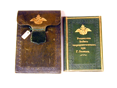 Fodral av delvis gulnat, grönt skinn med lock i form av överviksflik, vars ände sticks in i slits på fodralets framsida. Längs kanterna pressad palmettbård, på flikens framsida den ryska dubbelörnen i guldpressning. Invändigt klätt med grått papper.