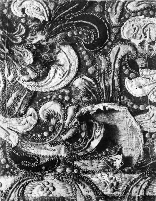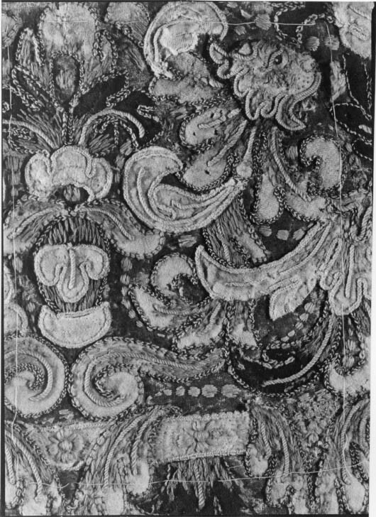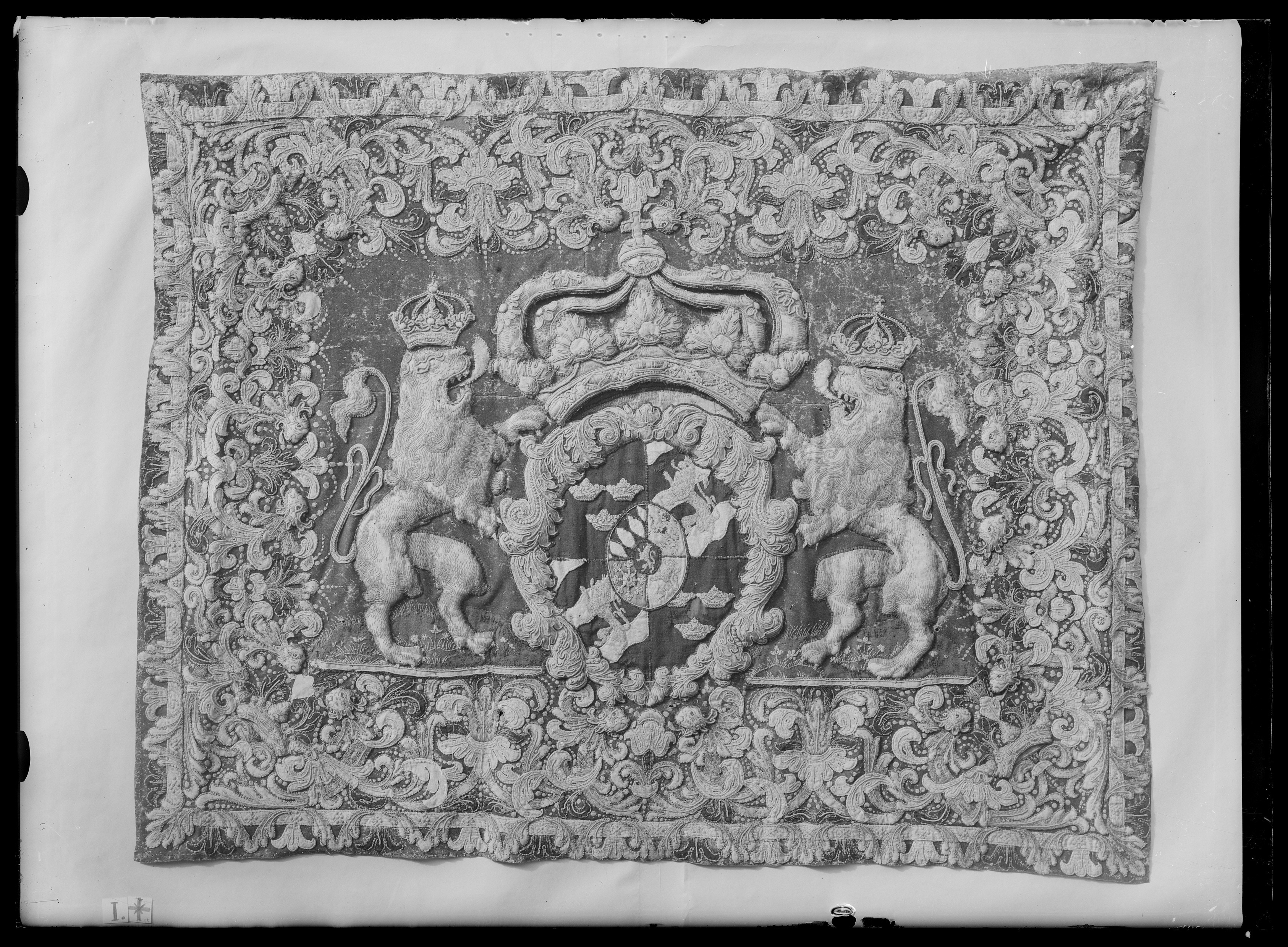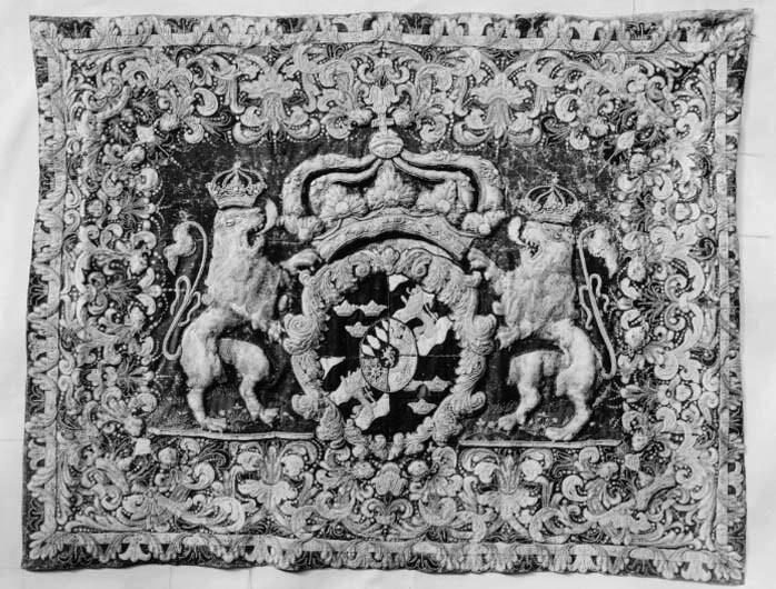 Handhästtäcke ur en svit om tolv stycken med svenska riksvapnet. Tillhört Karl XI (1655-1697). Beställda i Frankrike, troligen hos brodören Corniquet i Paris.