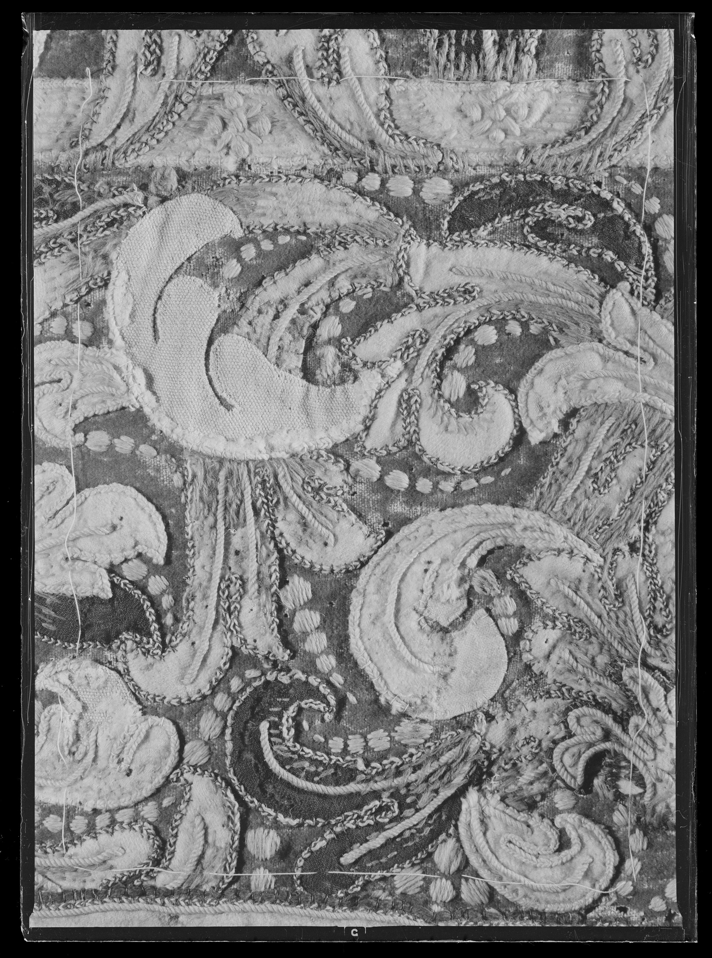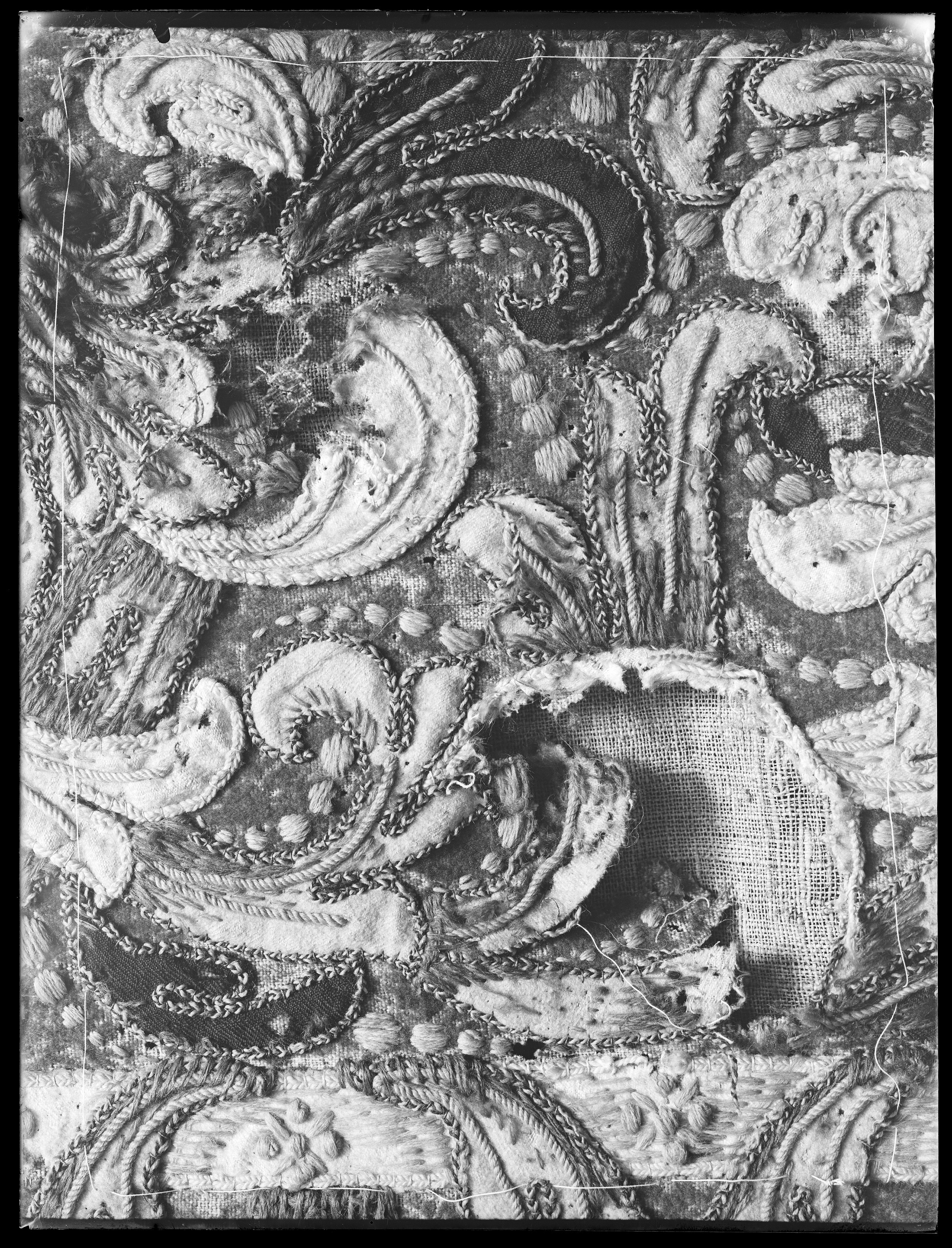 Rektangulärt täcke av blått kläde med applikationsbroderier av kläde i flera färger,huvudsakligen gult och vitt. Samma typ som nr 4048. Sytt av trå tygstycken, bredd 1070 mmrespektive 780 mm.
