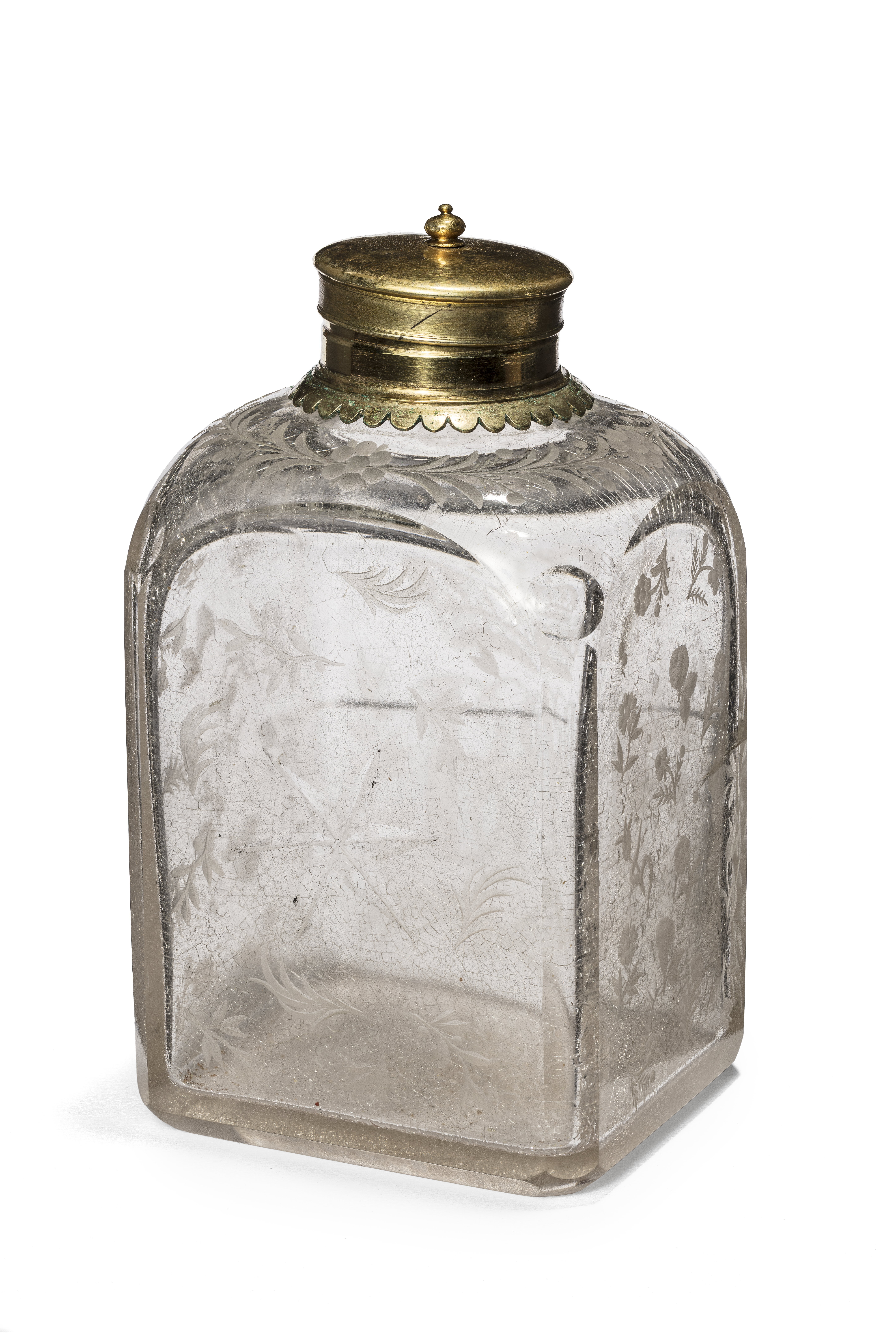 Flaska av glas med rektangulärt tvärsnitt och halsbeslag och lock av förgylld mässing. Glaset ofärgat och med en mycket svag ton i rostrött. Sidorna, bottnen och de fasade hörnen planslipade och polerade. Skuldran rundad, ovanför varje hörn en kulslipning. På framsidan ett stort, graverat monogram av de sammanskrivna bokstäverna H E R S under kunglig krona (Hedvig Eleonora Regina Sueciae) och symmetriskt omgivet av palm- och lagerkvistar. På baksidan en slipad och polerad sexuddig stjärna, omgiven av graverade, strödda blommor. På skuldran en sammanhängande bladkrans med en blomma mitt på varje sida. Halsbeslaget slätt, täckande mynningskanten och övergående nedåt i en cylinderformig, slät holk kring den likaledes cylinderformiga, 15 mm höga flaskhalsen. Beslagets nederdel är utdragen till en tämligen smal, runduddad krage. Till beslaget hör ett runt, svagt bukigt lock med nedåtgående kant, som täcker övre hälften av halsbeslaget. Lockets insida med kork, fastsatt vid locket med en gängad nit på vars ytterände en korsformig mutter av mässing sitter.