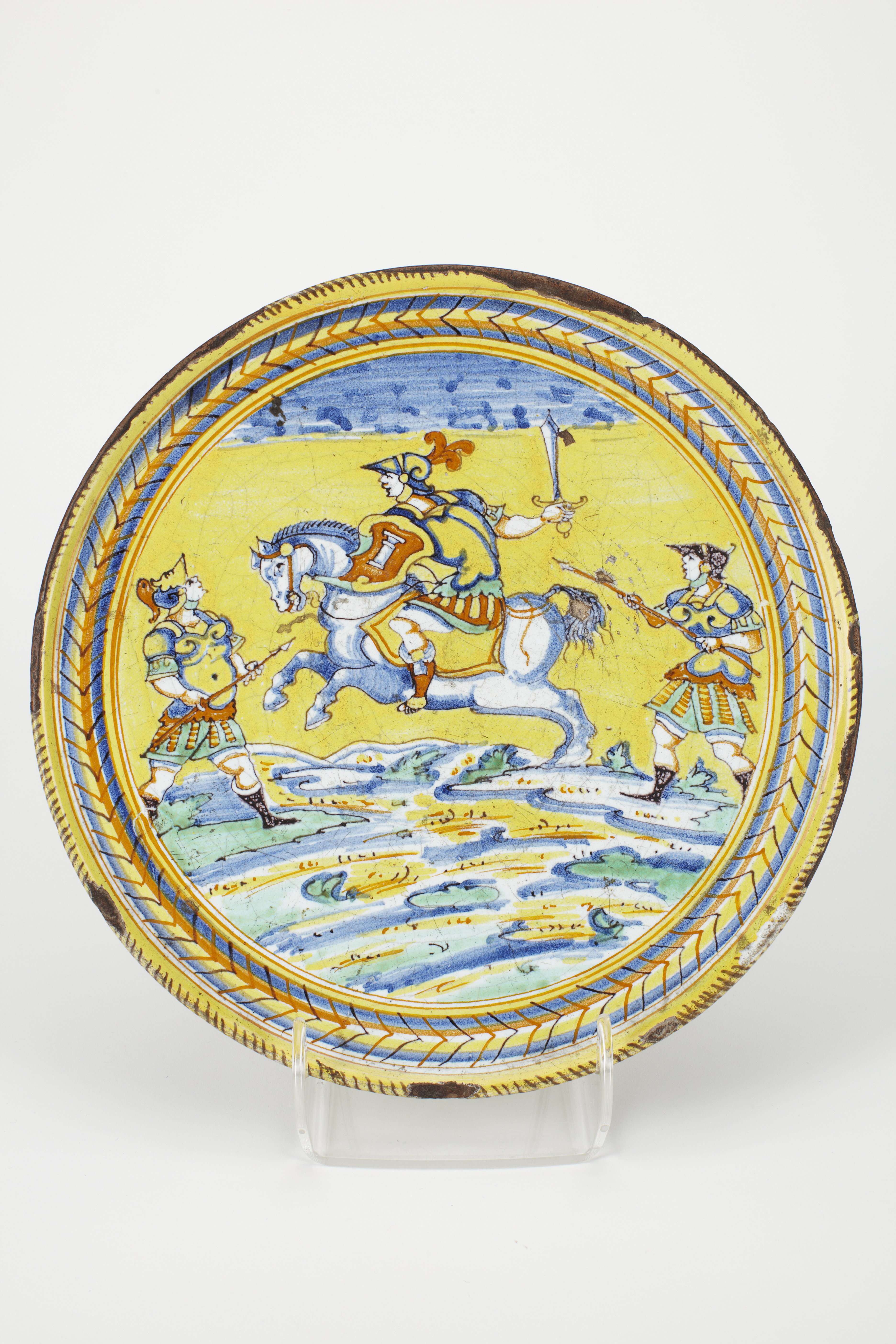 FAT. Runt, plant, med snett uppstående låg kant samt på kupig fot med kort skaft. Dekor: I färger på tennglasyr. Godset rödbrunt. På översidan en soldatbild. En krigare till häst mellan två fotsoldater. Ryttaren i galopp åt vänster, hjälm och harnesk gul med blå kant, tre plymer i brunt, kortärmad grön livtröja, kort gul kjortel med vertikala ränder i brunt med ett ljusblått band upptill, fäst med en gul knapp; på vänstra armen en sköld med en kolonnliknande heraldisk figur (ätten Colonnas vapen) i ljusblått i brunt fält inom ram i gult. Hästen vit med skuggningar i blått. Fotsoldaterna vända mot ryttaren, riktande sina lansar mot honom, iklädda rustningar, den vänstra i blå hjälm med gult framstycke och brun plym, den högra i mörkt brungredelinn hjälm. Bakgrunden gul, upptill blå. Runt bilden en bård av ränder gult, blått, brungult och vitt med tvärställda enkla vinkelornament, vartannat brungult och vartannat i mörkt brungredelint. Kanten gul med snedställda streck i brunt. Höjd 5,2-6,6 cm, diameter 26 cm. Fot, diameter 9,9 cm