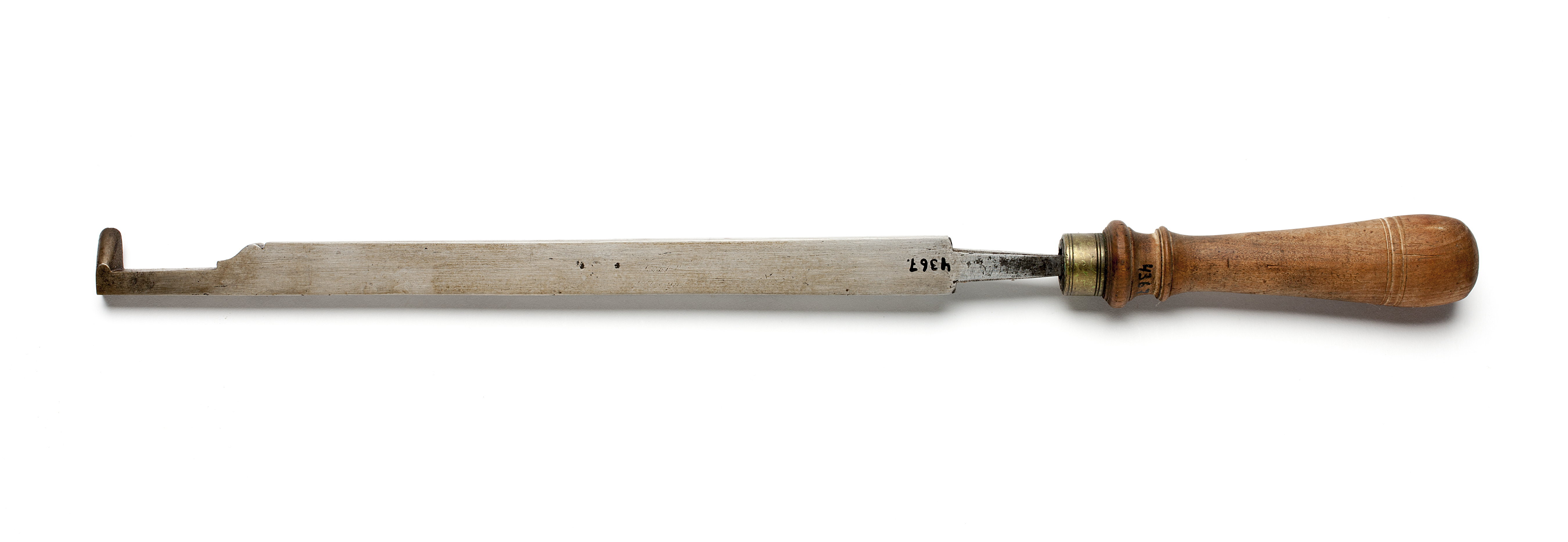 Klinga med rektangulär genomskärning, övergående via profilering på ena sidan i smalare, vinkelböjd ände med rundad egg. Stämplat på klingan: "IK" under krona, Johan Kesemaker, Stockholm. Svarvat skaft av päronträ, med två vulster nedtill ("rydboholmstyp"). Mässingsring.