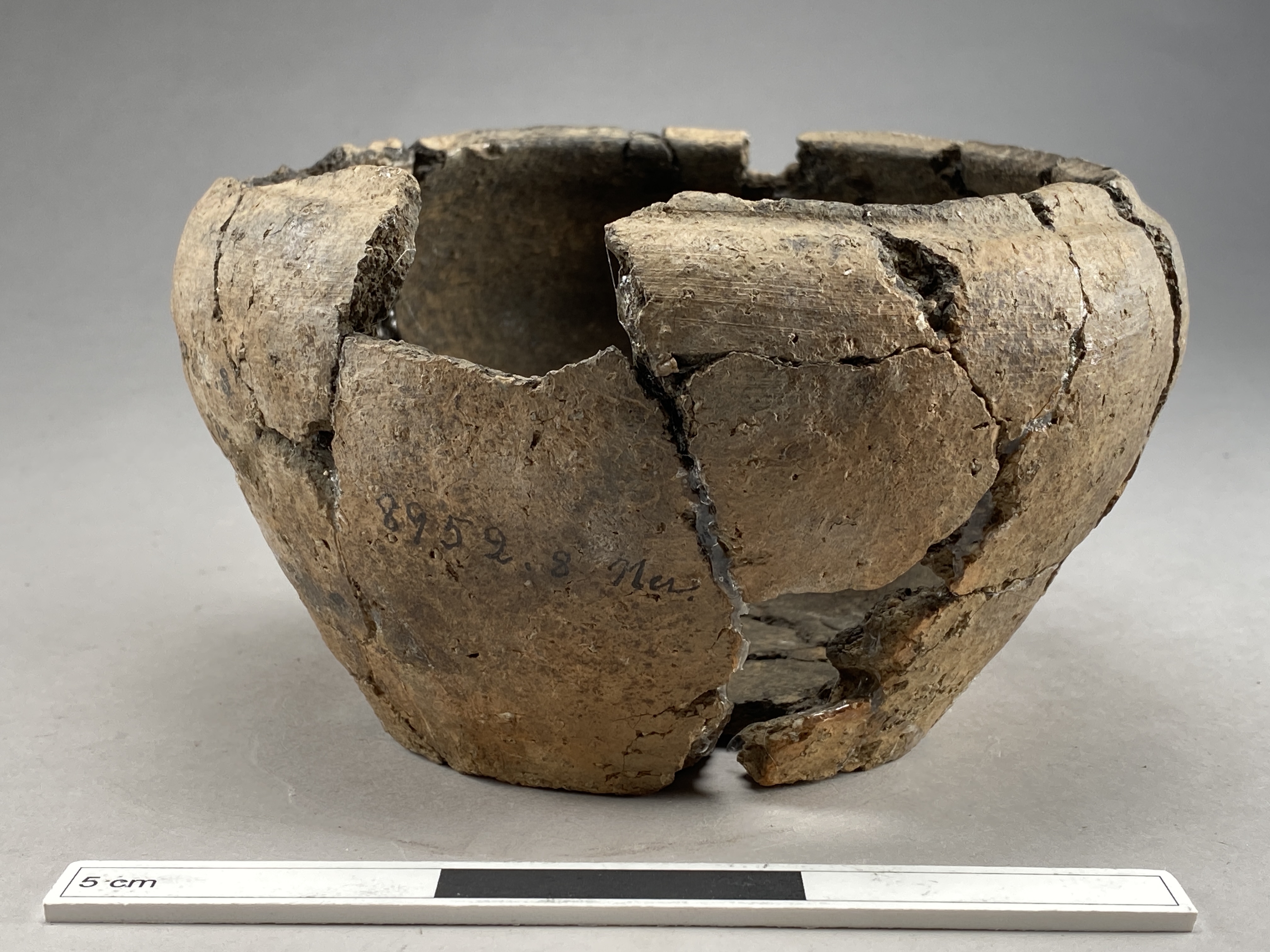 Kärl av keramik, tämligen dåligt bränt. Från en plan botten vidgar sid kärlet. Sedan avsmalnar kärlet mycket starkt och är vid kanten försedd med en insänkt linje.