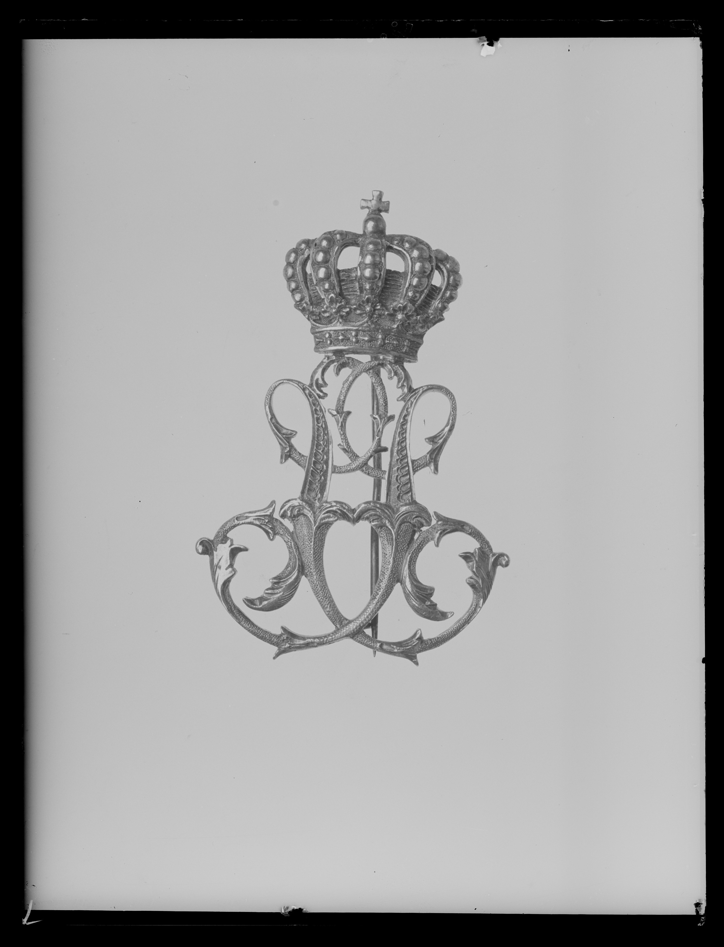 Spegelmonogram av förgyllt silver, S under kunglig krona. På baksidan lodrätt placerad säkerhetsnål.