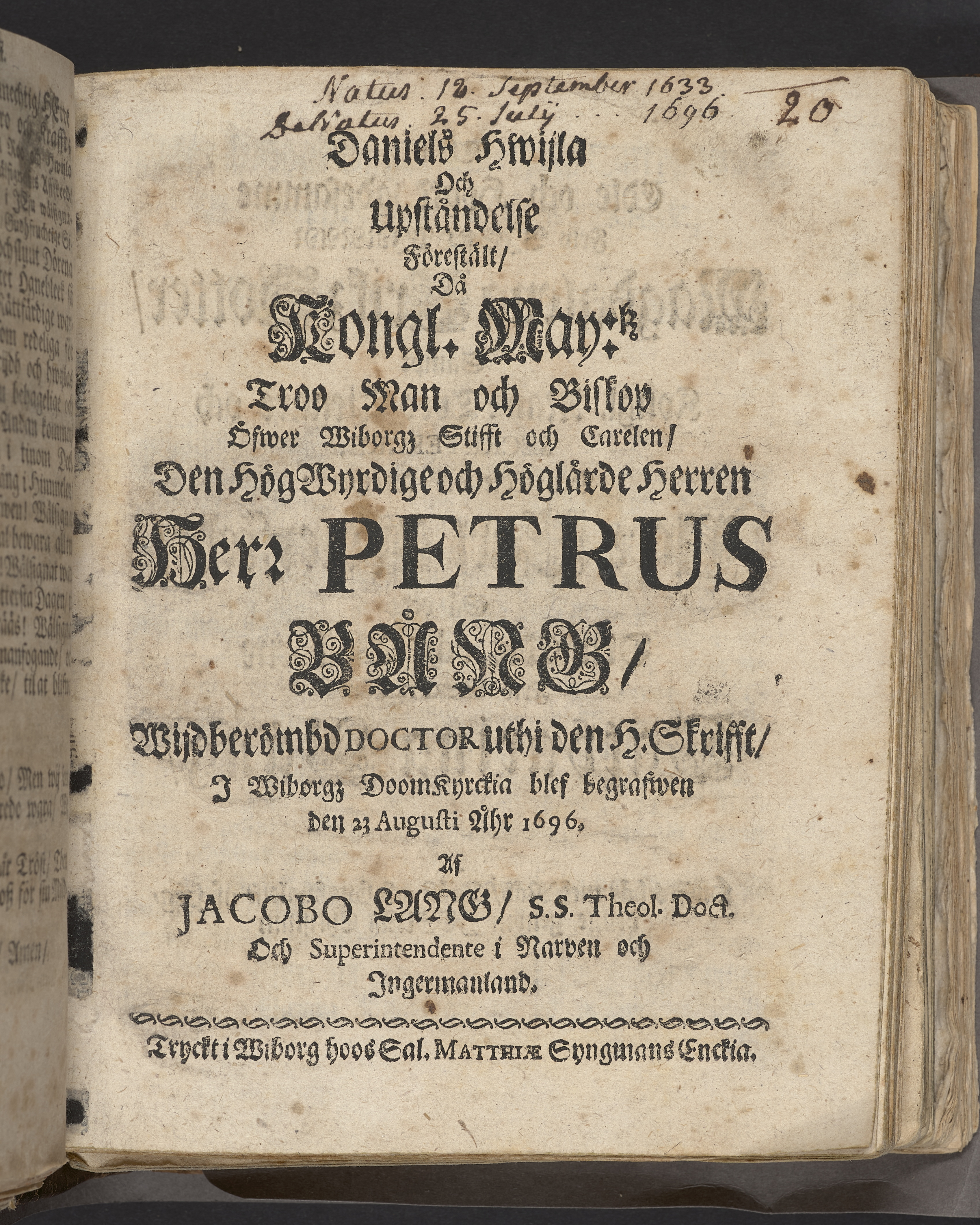 Daniels hwijla och upståndelse förestält, då ... biskop öfwer Wiborgz stifft och Carelen, ... herr Petrus Bång, wijdberömd doctor uthi den H. Skrifft, i Wiborgz doom kyrckia blev begrafwen den 23 augusti åhr 1696. Af Jacobo Lang, S.S. theol. doct. och superintendente i Narven och Ingermanland. Tryckt i Wiborg hoos sal. Matthiæ Syngmans enckia.