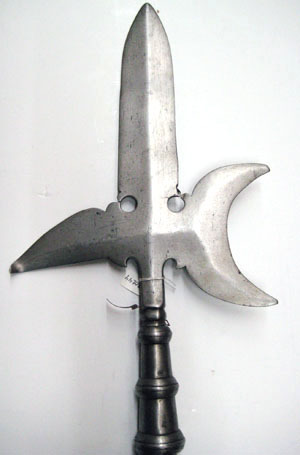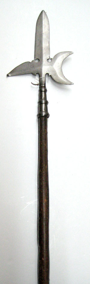 Dolkformig stötklinga, uppåt avsmalnande med mötande skär och rygg. Yxbladet smalt och halvmånformigt med konkav egg och spetsiga ändar, H 114 mm. Haken svagt nedåtriktad, övre kant rundad och nedre rak. Rygg över yxblad samt från dess mitt till hakens slut, möter klingryggen över korset. Utdragen bladhals med nedre delen profilerad. Skruvad i holken. Holken, L 92 mm, konisk och slät med profilerad ring upptill, i mitten och nertill. Blanka skenor, L 471 mm, ursprungligen fästade med sex nitar vardera. Stång av brunaktigt trä, diam 32 mm. Tvärt avsågat.